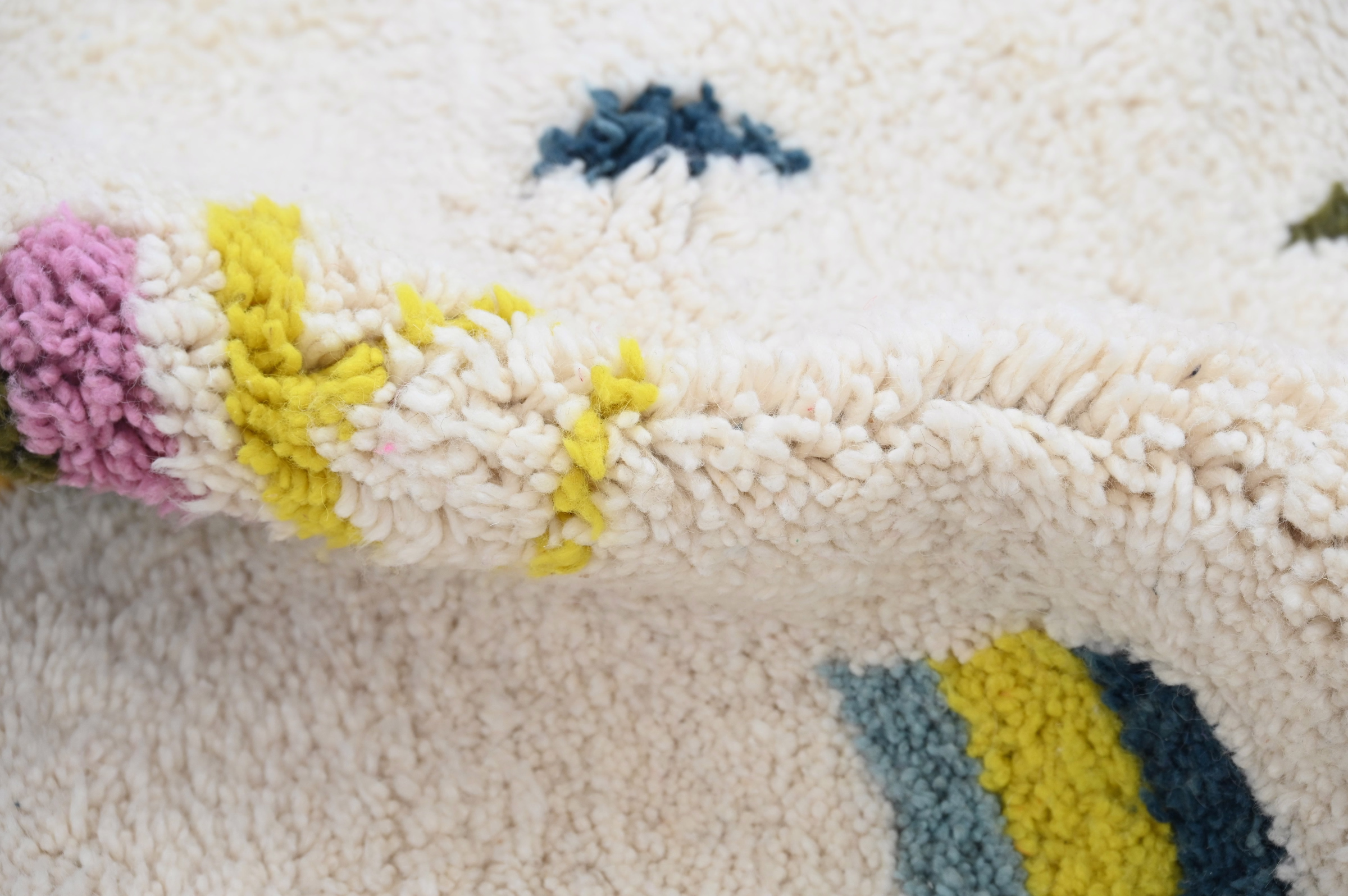 Measuring 300 × 214 cm, this substantial wool rug originates from the Azilal region of Morocco's Atlas Mountains, where Berber artisans weave intuitive compositions without predetermined patterns. The generous proportions suit living rooms, bedrooms, or creative studios, while the vibrant palette energizes contemporary interiors. The high-pile construction delivers acoustic softening and tactile comfort. Free international delivery.