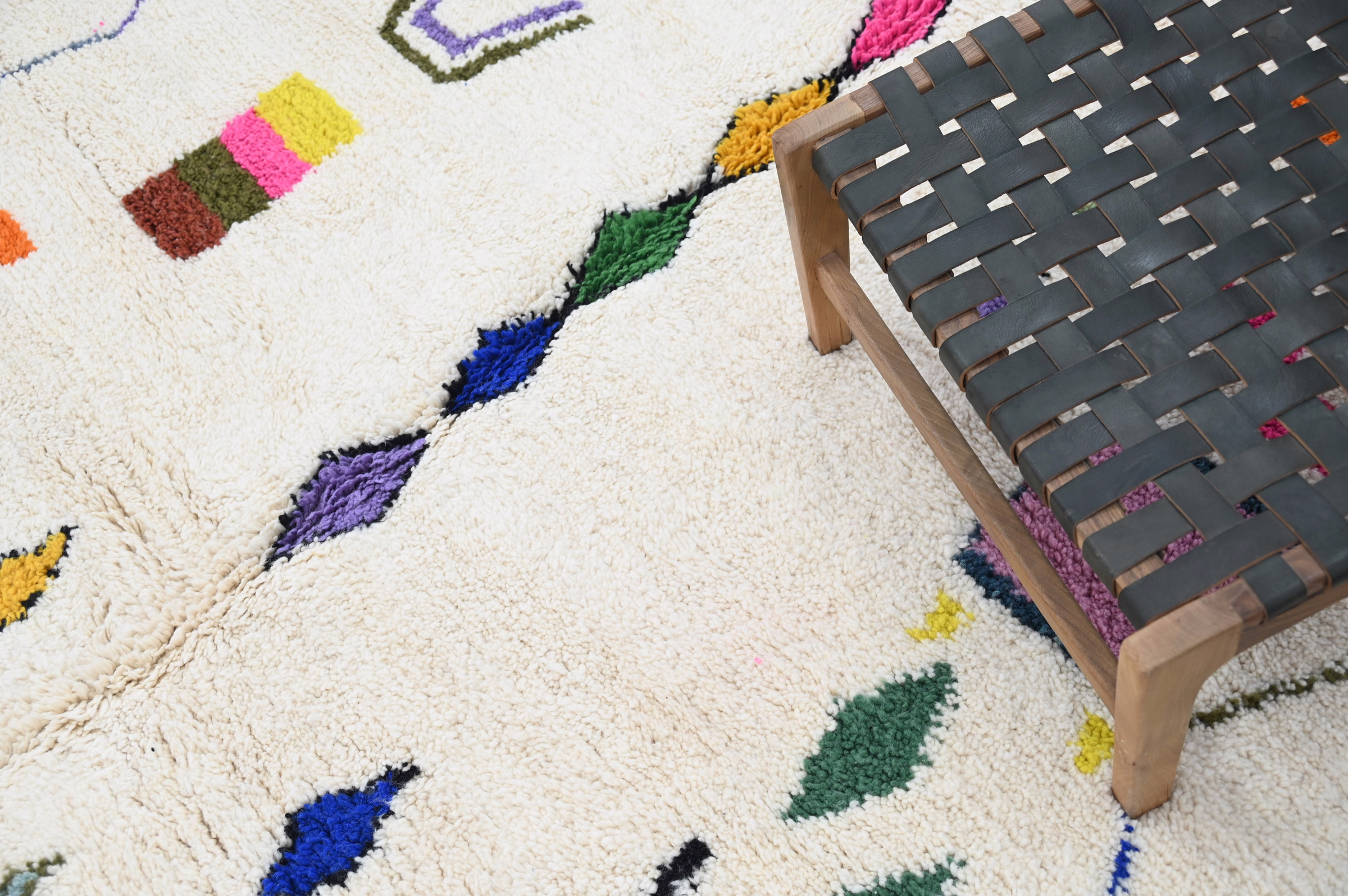 The Azilal handwoven piece showcases scattered tribal symbols and geometric forms in magenta, cobalt blue, emerald green, golden yellow, and coral across a cream ground. The playful asymmetric composition and vibrant palette create spontaneous visual rhythm characteristic of Azilal weaving traditions.
