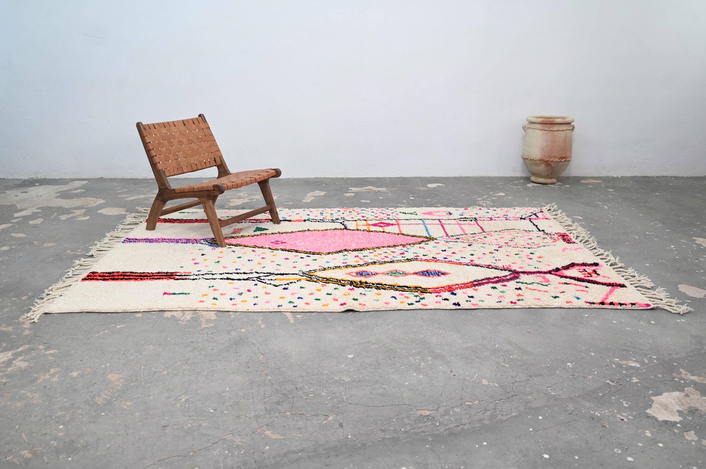 The Azilal handwoven piece celebrates bold abstract composition with scattered tribal figures and diamond medallions in magenta pink, emerald green, and charcoal across a cream ground with scattered dot motifs. The exuberant composition and vibrant palette create spontaneous visual rhythm characteristic of contemporary Azilal aesthetic.