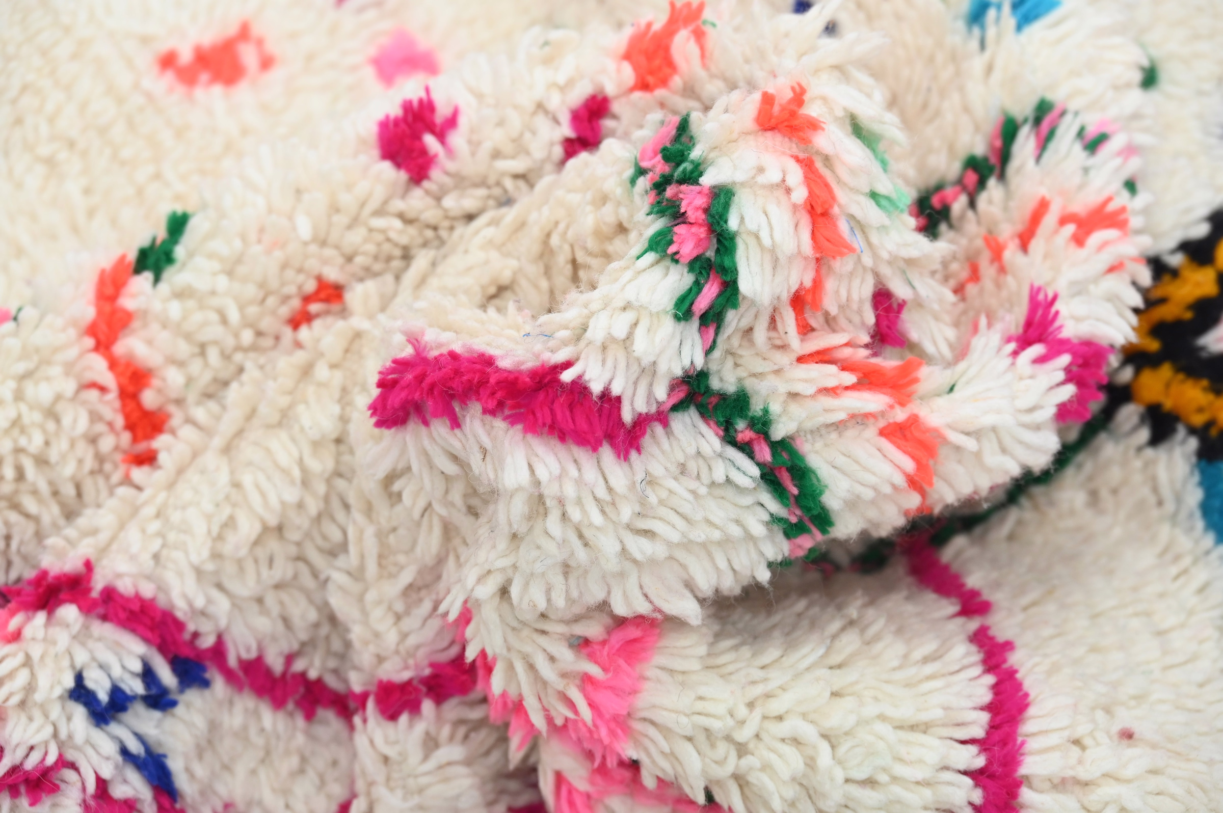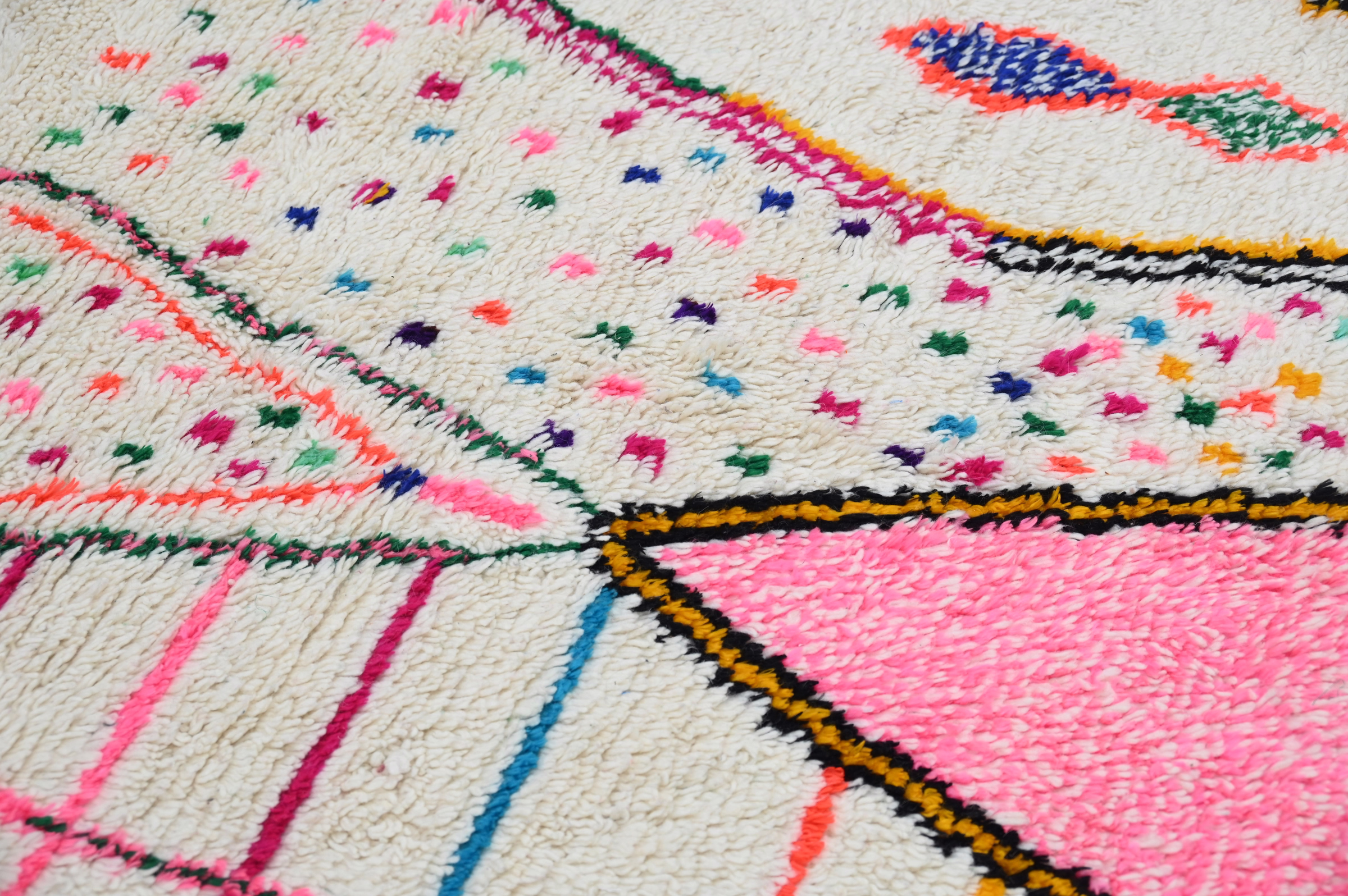 Measuring 310 × 190 cm, this substantial wool rug originates from the Azilal region of Morocco's Atlas Mountains, where Berber artisans weave playful compositions. The generous proportions suit living rooms, bedrooms, or creative studios, while the vibrant scattered pattern energizes modern interiors. The high-pile construction delivers acoustic softening and tactile comfort. Free international delivery.