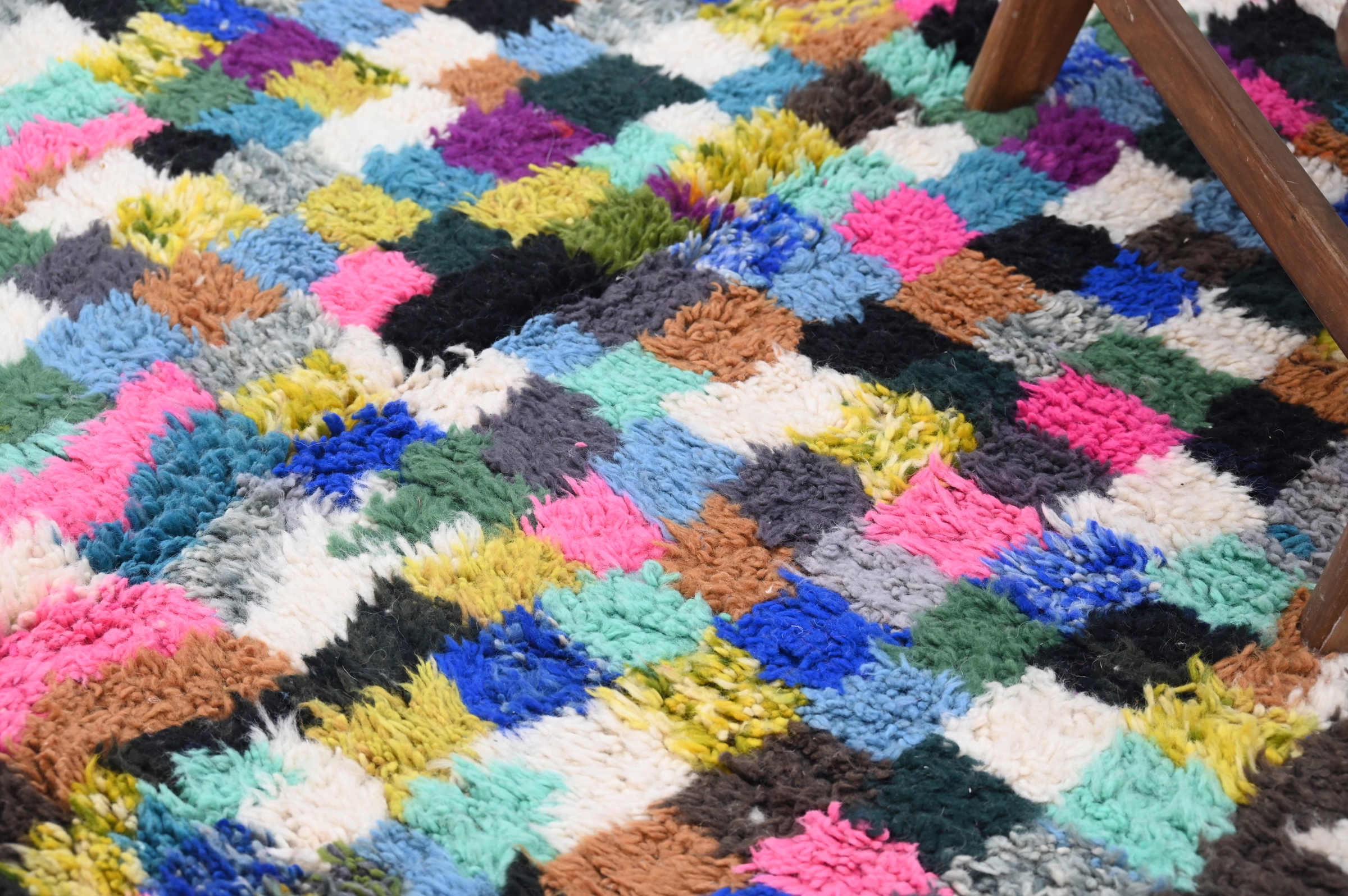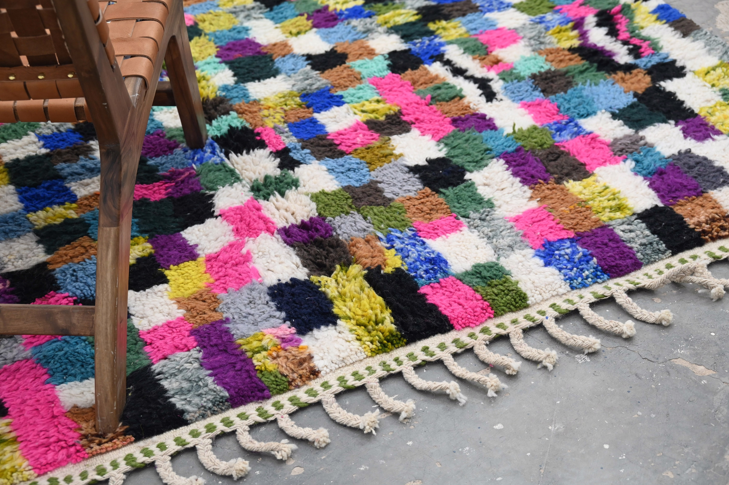 The Azilal handwoven piece celebrates chromatic maximalism through bold checkerboard composition in magenta, cobalt blue, golden yellow, emerald green, charcoal, and coral. The exuberant color distribution creates kaleidoscopic visual impact characteristic of contemporary Azilal aesthetic.