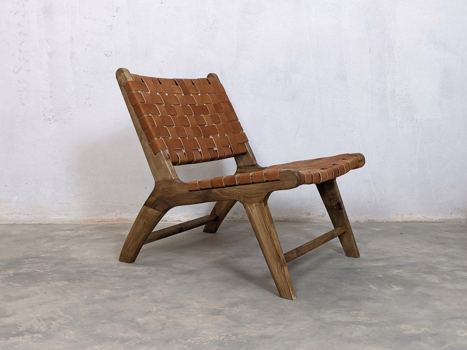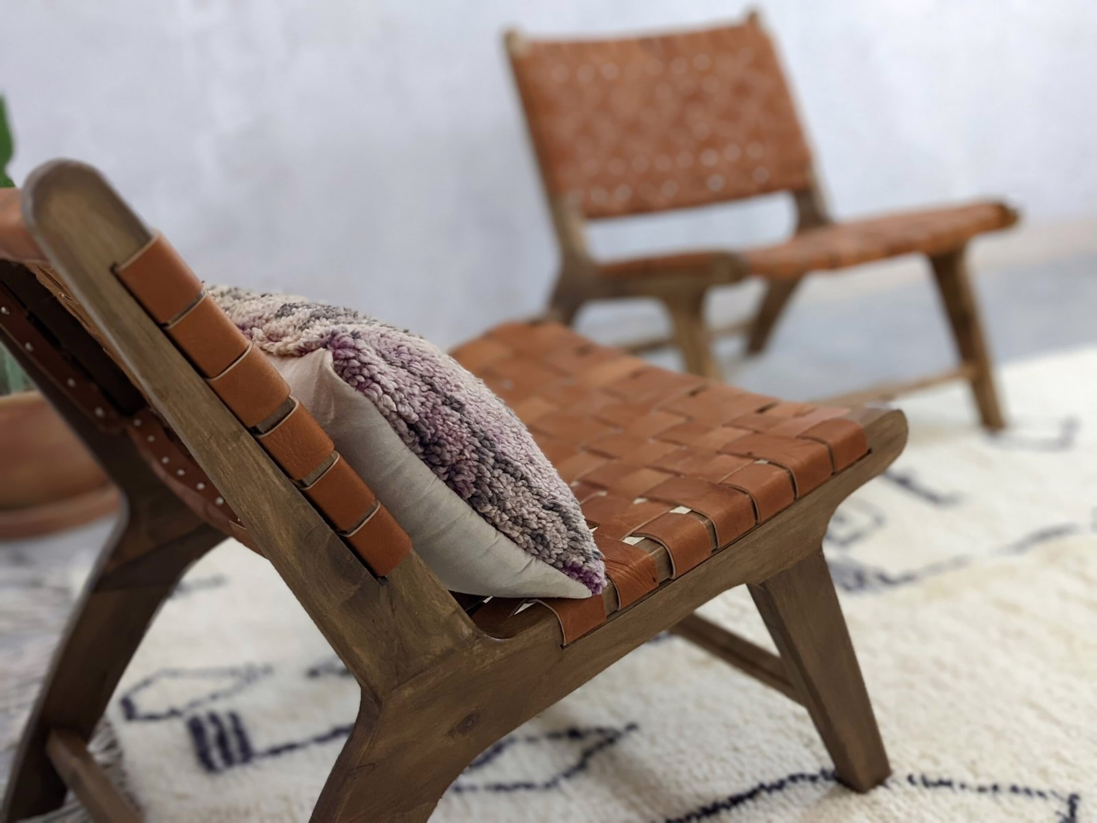 يقدّم طقم الكراسي بذراعين من الجلد والجوز المصنوع يدوياً أشكال صالة مصقولة بأشرطة جلدية منسوجة بدرجات كراميل دافئة عبر أطر جوز نحتية. يوازن التصميم المعاصر بين الجمالية الحديثة لمنتصف القرن وتقنيات الحرفة المغربية التقليدية، خالقاً مجموعة جلوس خالدة براحة استثنائية ورقي بصري.