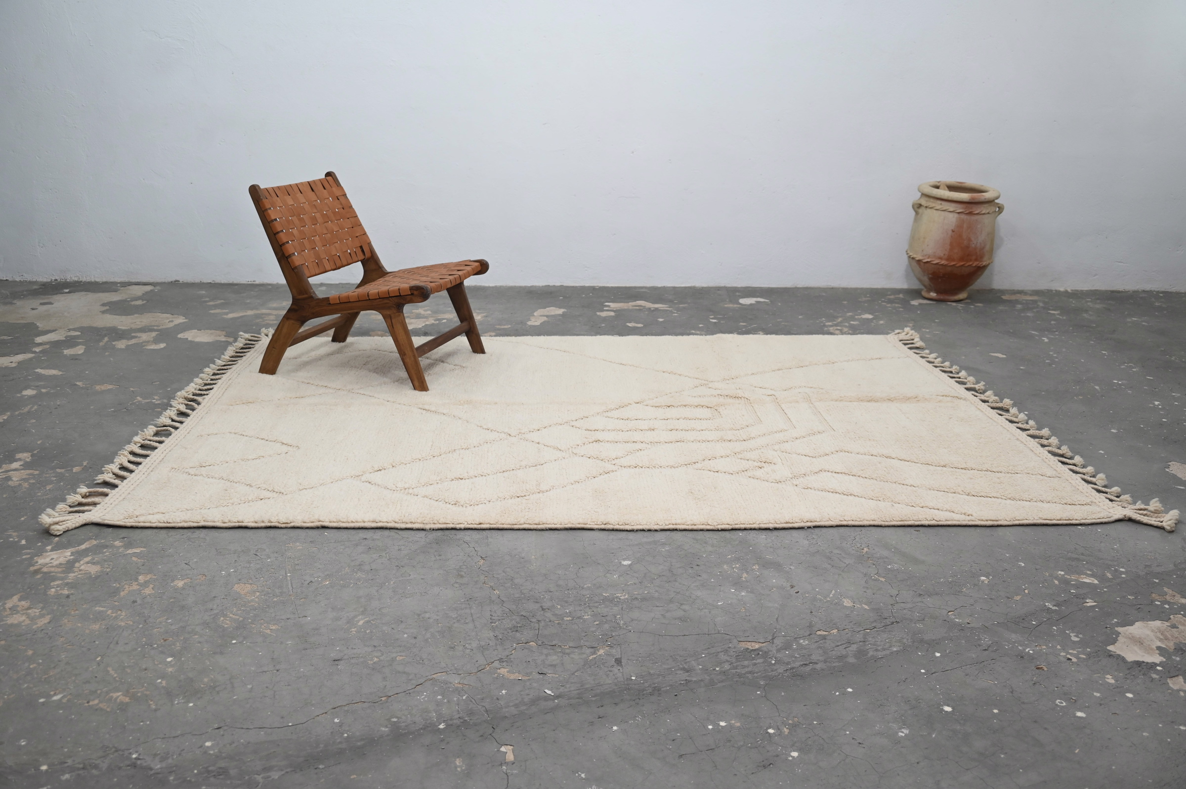 Measuring 300 × 210 cm, the substantial wool rug originates from the Middle Atlas Mountains where Beni Ouarain tribes have refined thick-pile weaving techniques over generations. The generous proportions anchor primary living spaces and bedrooms with grounded presence, while the neutral palette ensures versatility across interior styles. The luxurious pile delivers exceptional warmth and acoustic softening. Free international delivery.