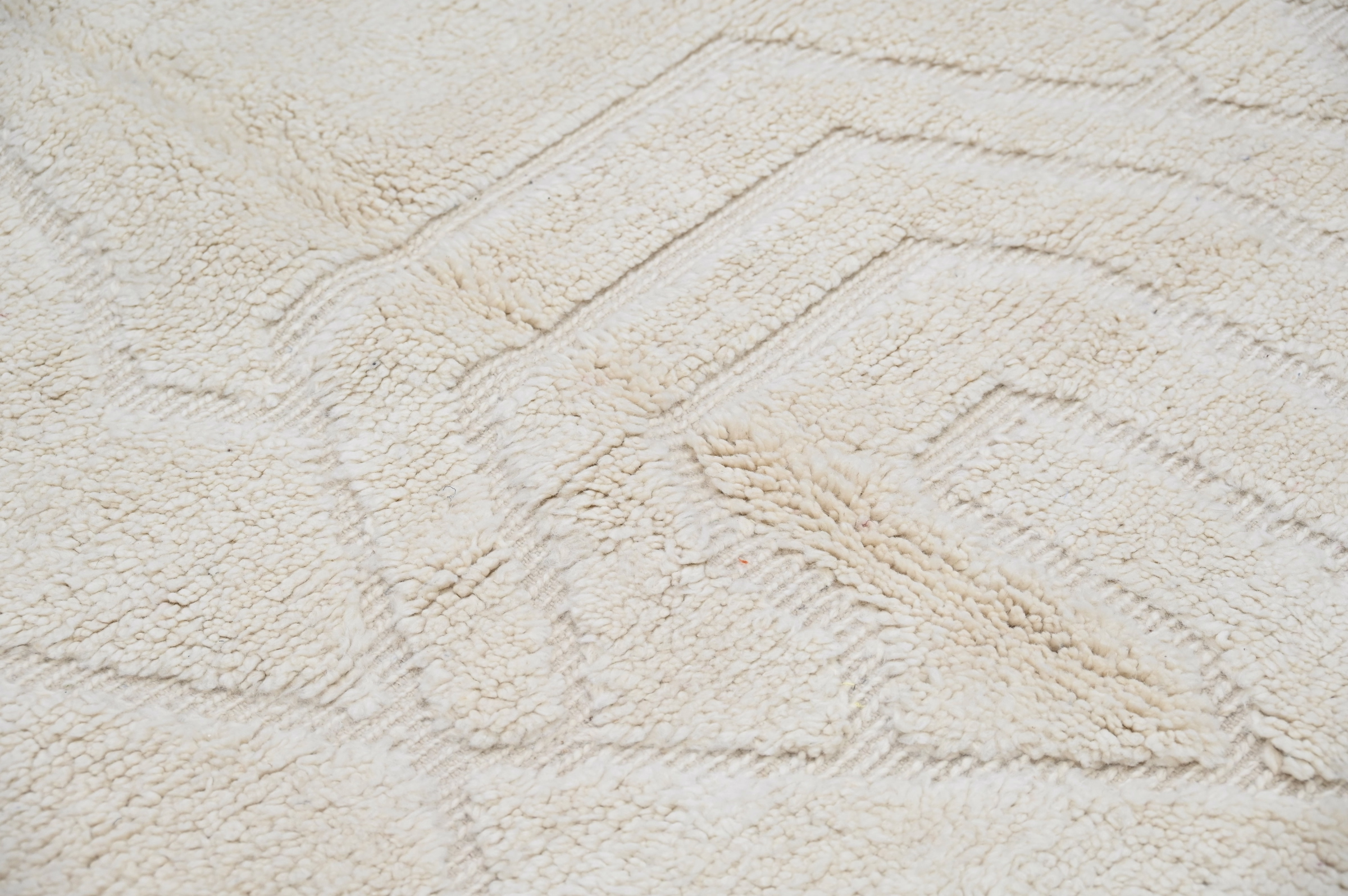 This Beni Ouarain handwoven piece presents a subtle diamond lattice in tonal cream with ghosted charcoal outlines. The restrained geometric framework and monochromatic palette create contemplative visual interest that emphasizes texture and material quality over graphic contrast.