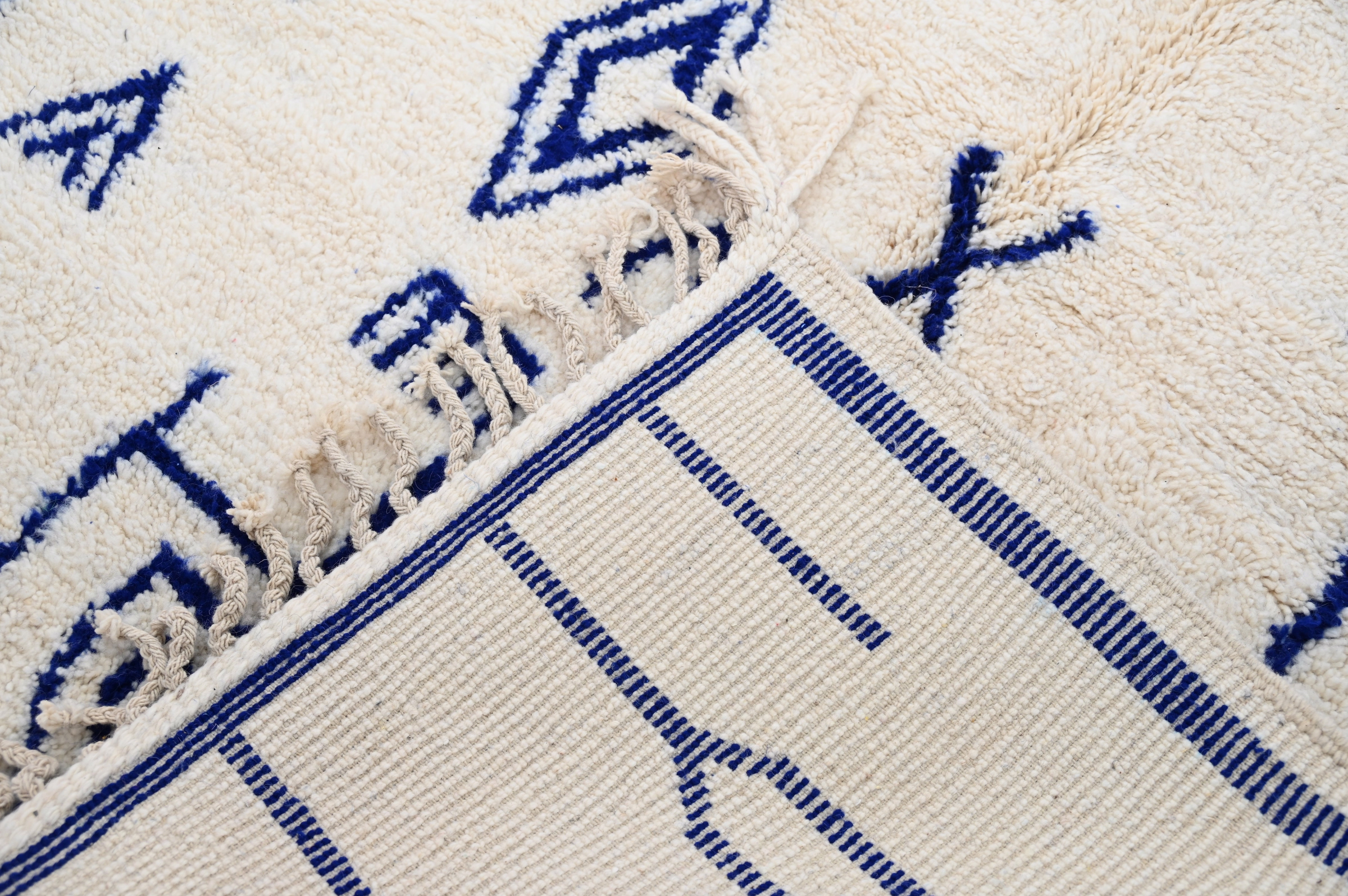 Dette traditionelle Azilal-tæppe fremviser spredte stamme-symboler i marineblå mod en cremet baggrund, indrammet af dristige marineblå kanter. Den grafiske klarhed og symbolske mønstring skaber struktureret visuelt interesse, mientras den højflorete tekstur inviterer til taktilt engagement karakteristisk for Azilal-vævning.