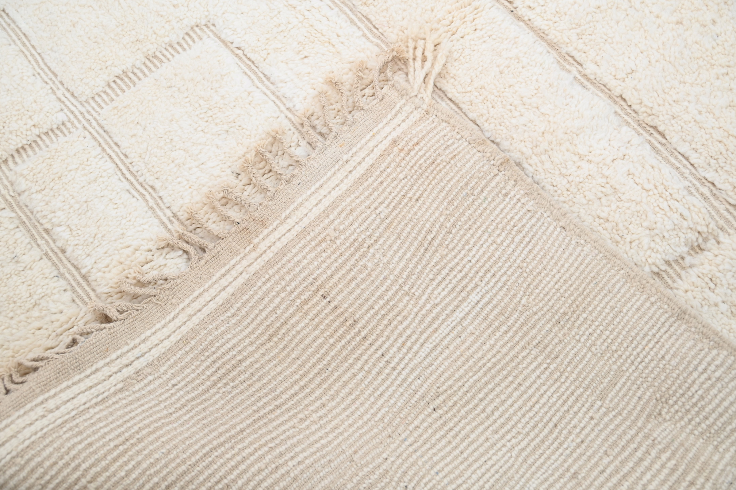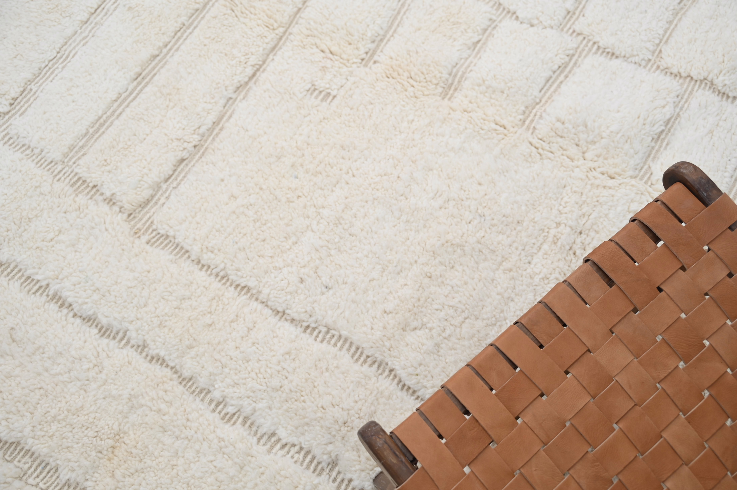 The Beni Ouarain handwoven piece presents geometric architectural framework in charcoal creating structured visual composition across a plush cream field. The minimalist composition emphasizes architectural precision through linear abstraction, while the high-pile texture delivers luxurious underfoot comfort.