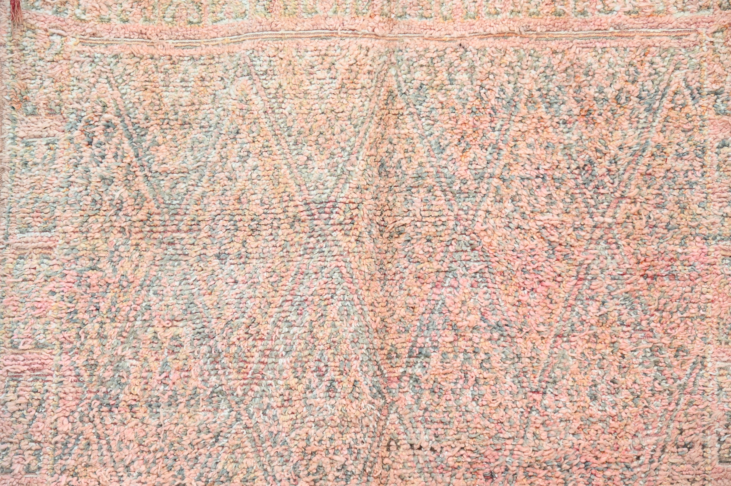 Dieser traditionelle Vintage-Teppich präsentiert komplexe Allover-Tapisserie von Rautenmedaillons in verblasstem Korallenrosa und Salbeigrün über sonnengebleichtem beigem Feld. Jahrzehnte der Nutzung haben die natürlichen Farbstoffe zu harmonischen Pastelltönen gemildert, während das komplexe geometrische Gerüst außergewöhnliche Berber-Webpräzision zeigt.