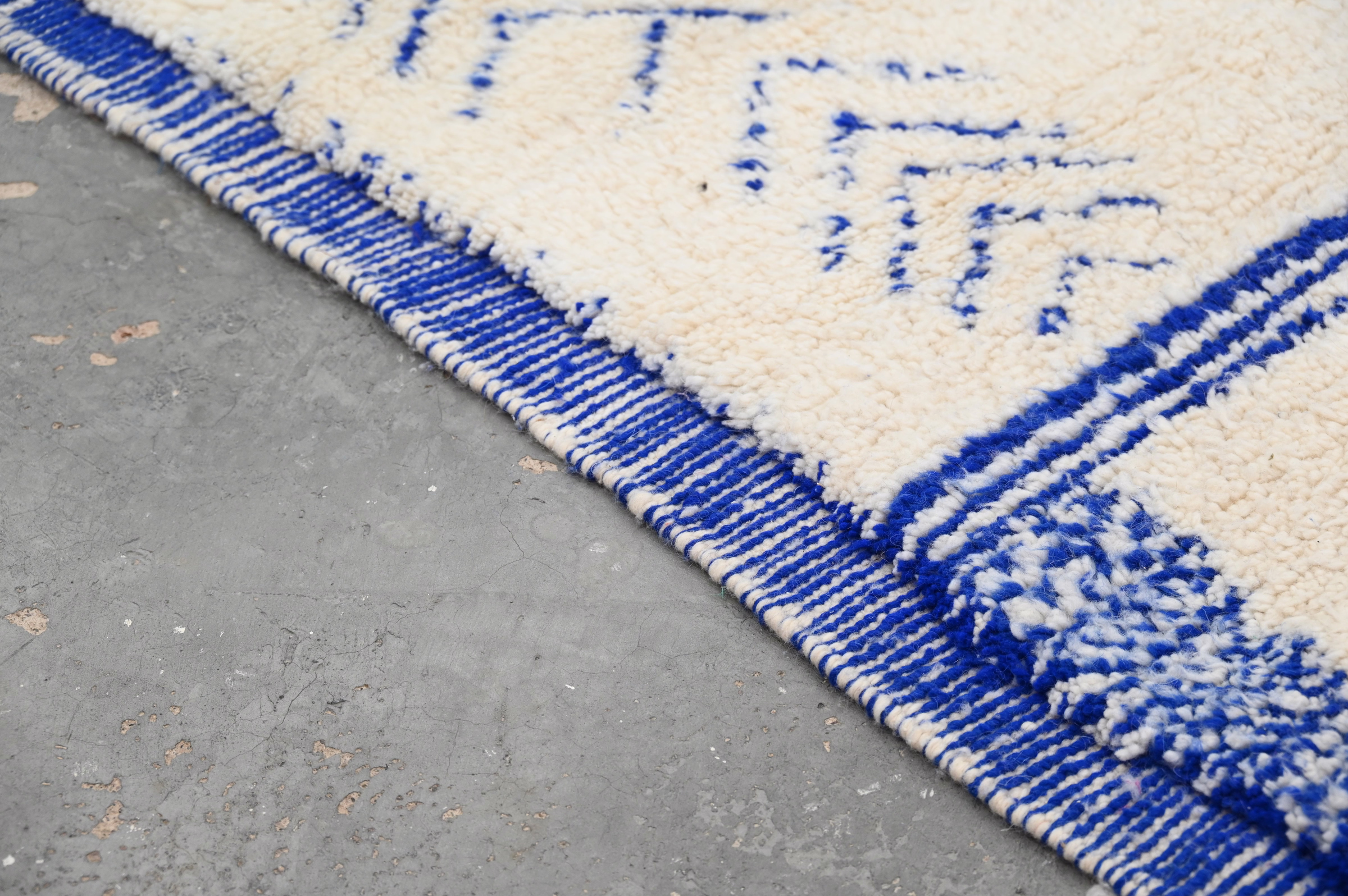 Measuring 240 × 160 cm, this wool rug originates from the Azilal region of Morocco's Atlas Mountains, where Berber artisans weave intuitive compositions without predetermined patterns. The medium proportions suit bedrooms, studios, or layered living arrangements, while the bold blue border adds structural clarity. The high-pile construction delivers acoustic softening and tactile comfort. Free international delivery.