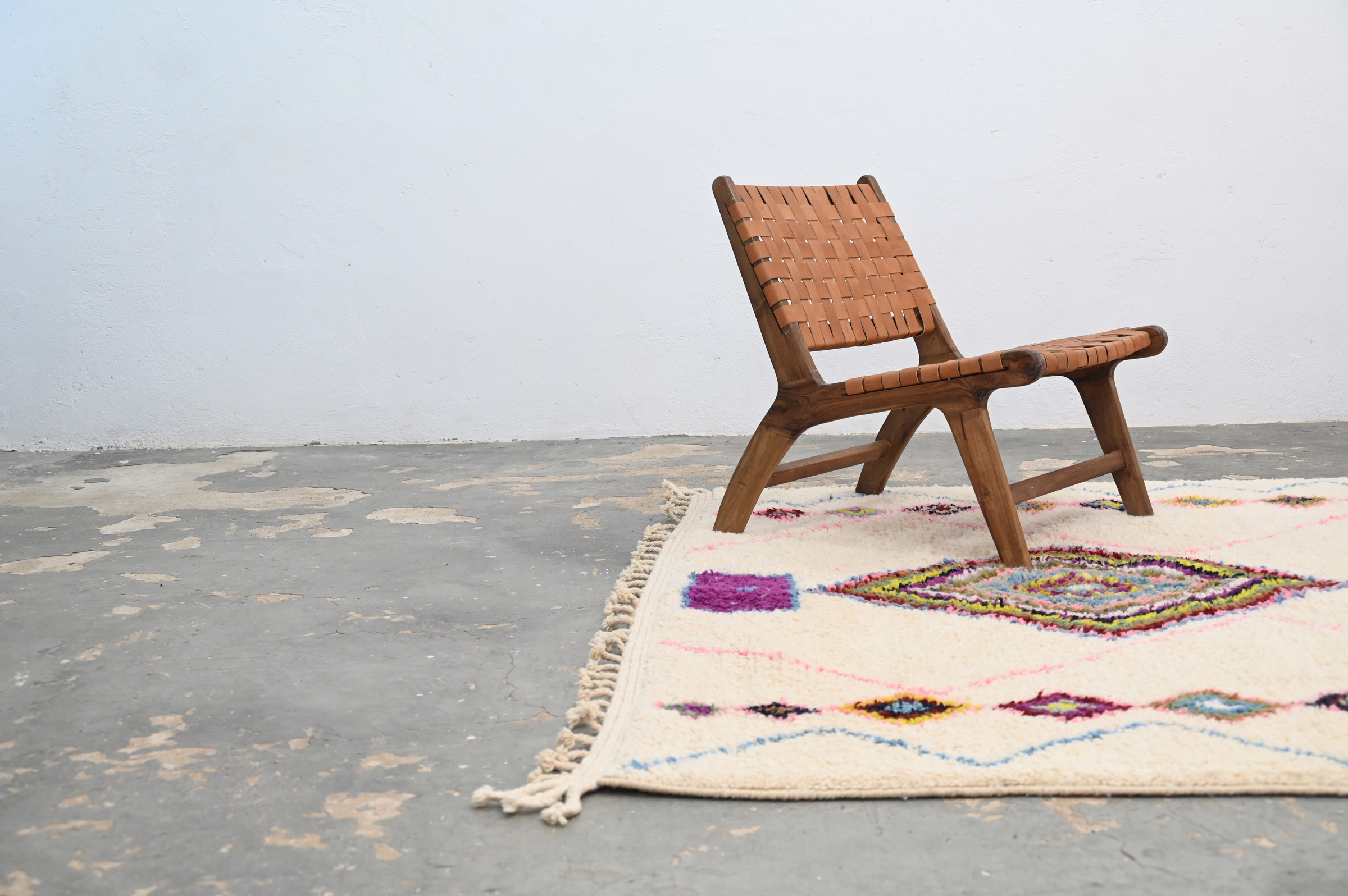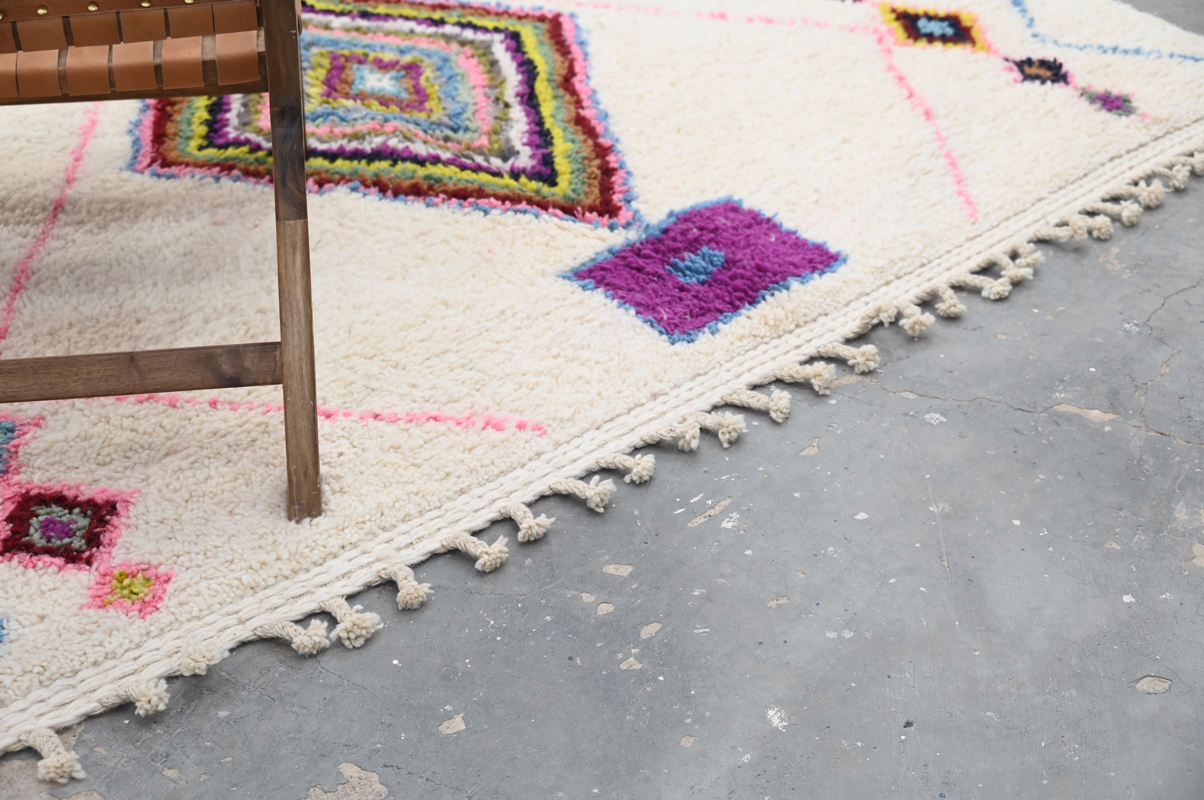 Measuring 300 × 215 cm, the substantial wool rug emerges from Morocco's Atlas Mountains where Berber weavers balance traditional motifs with personal expression. The generous proportions suit living rooms and bedrooms requiring visual anchor, while the vibrant yet harmonious palette energizes neutral interiors. The high-pile construction delivers acoustic softening and underfoot luxury. Free international delivery.
