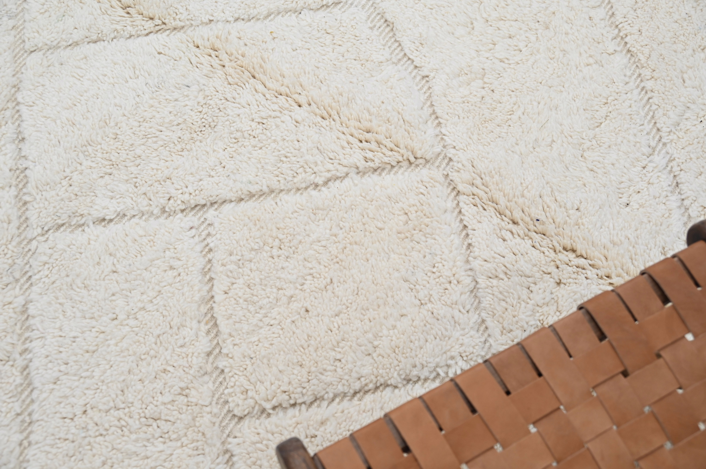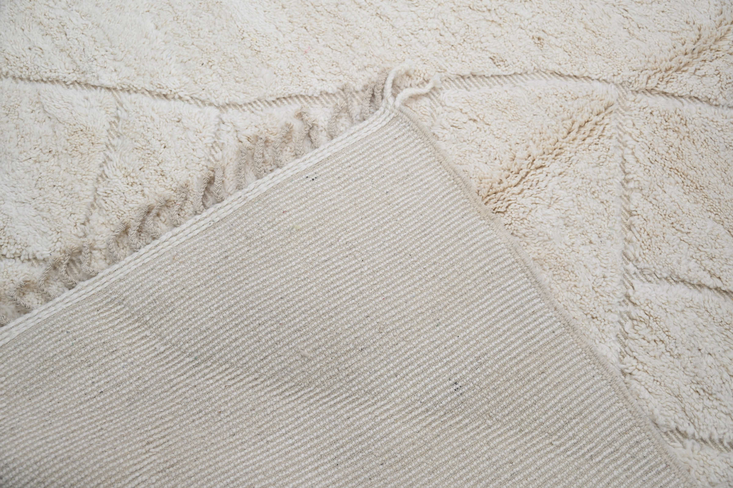 Measuring 300 × 200 cm, the substantial wool rug originates from the Middle Atlas Mountains where Beni Ouarain tribes have perfected thick-pile weaving techniques over generations. The generous proportions anchor living rooms and bedrooms with grounded presence, while the monochromatic palette ensures versatility across interior styles. The luxurious pile height delivers exceptional warmth and acoustic softening. Free international delivery.