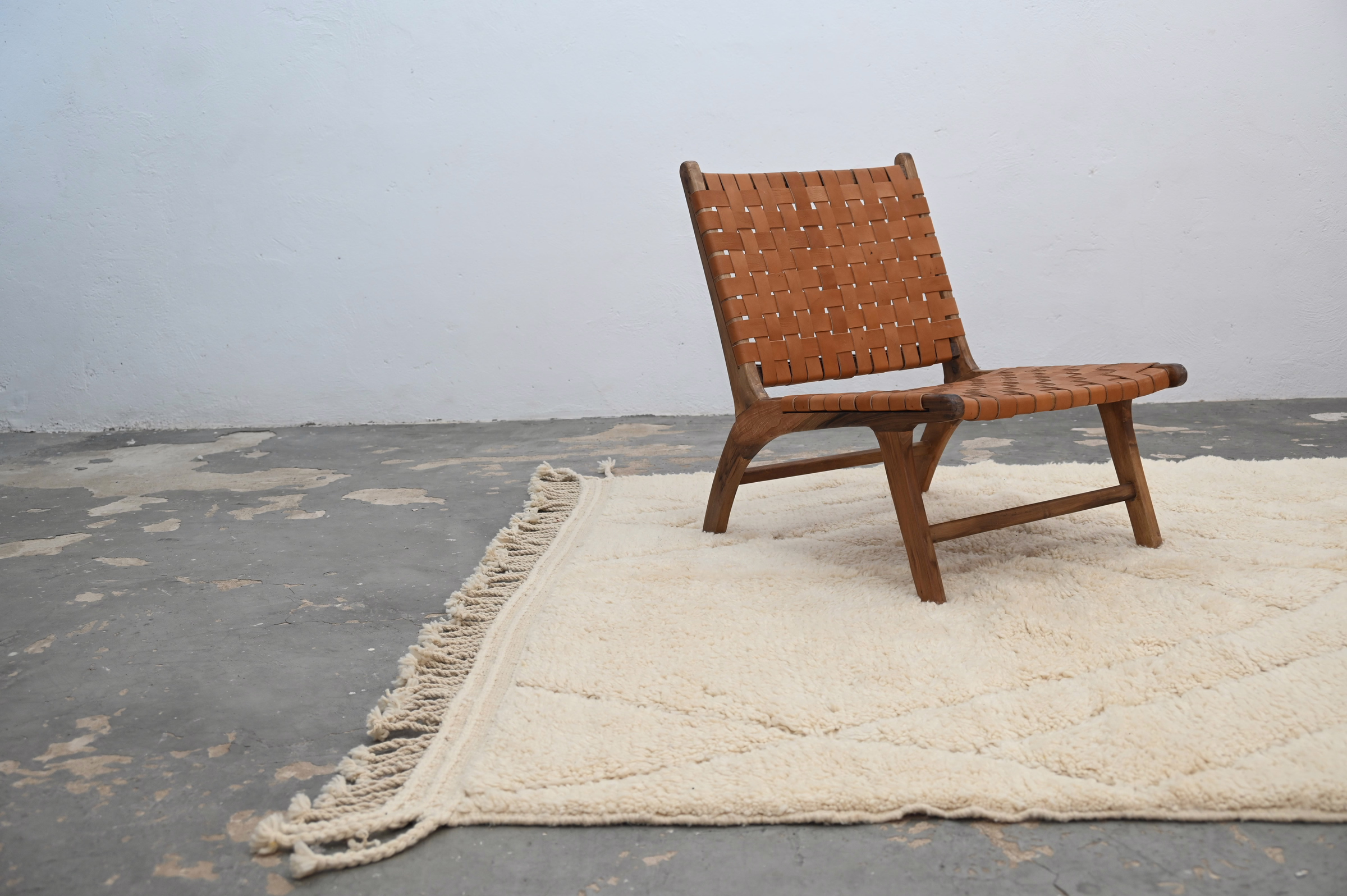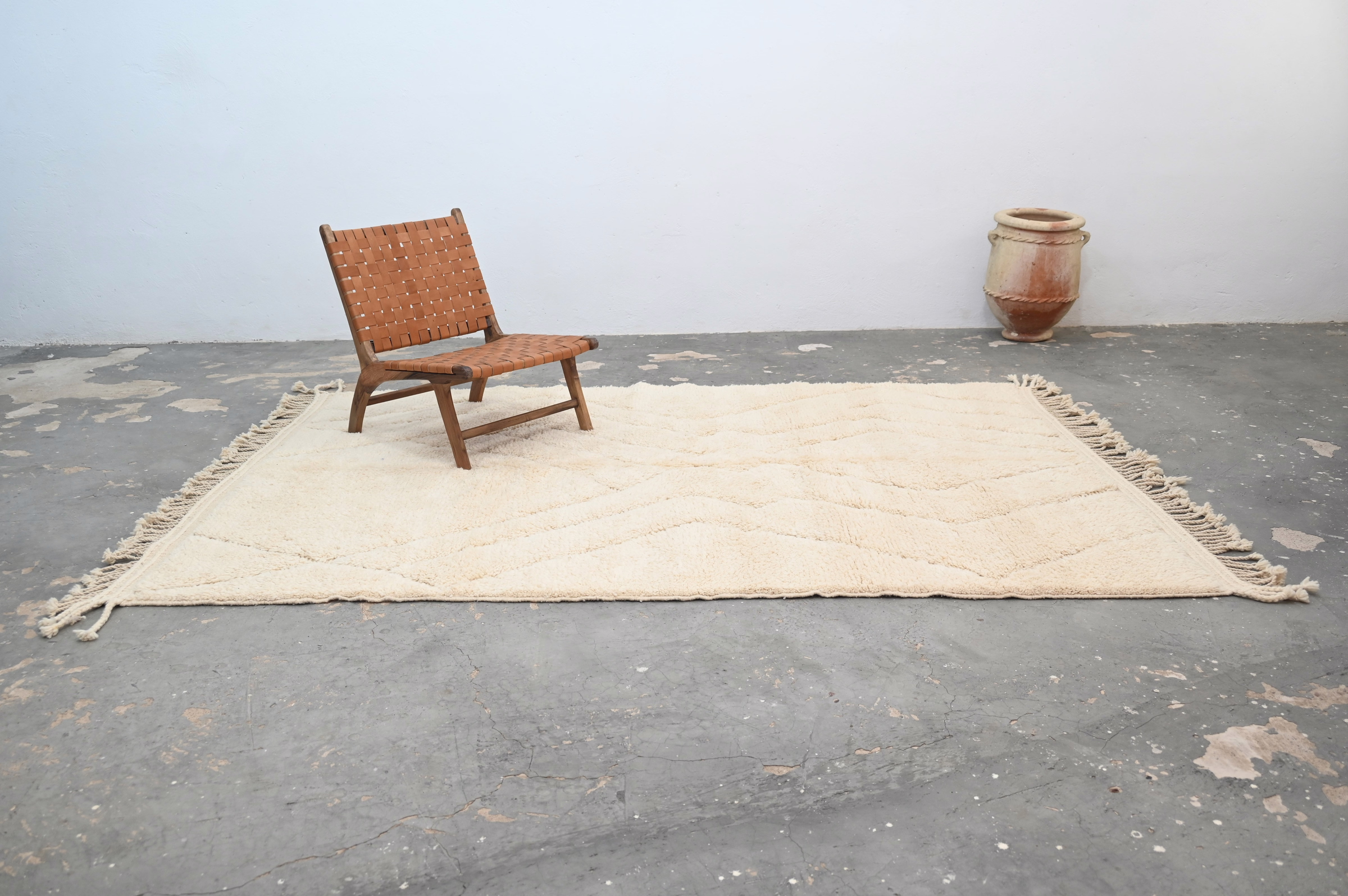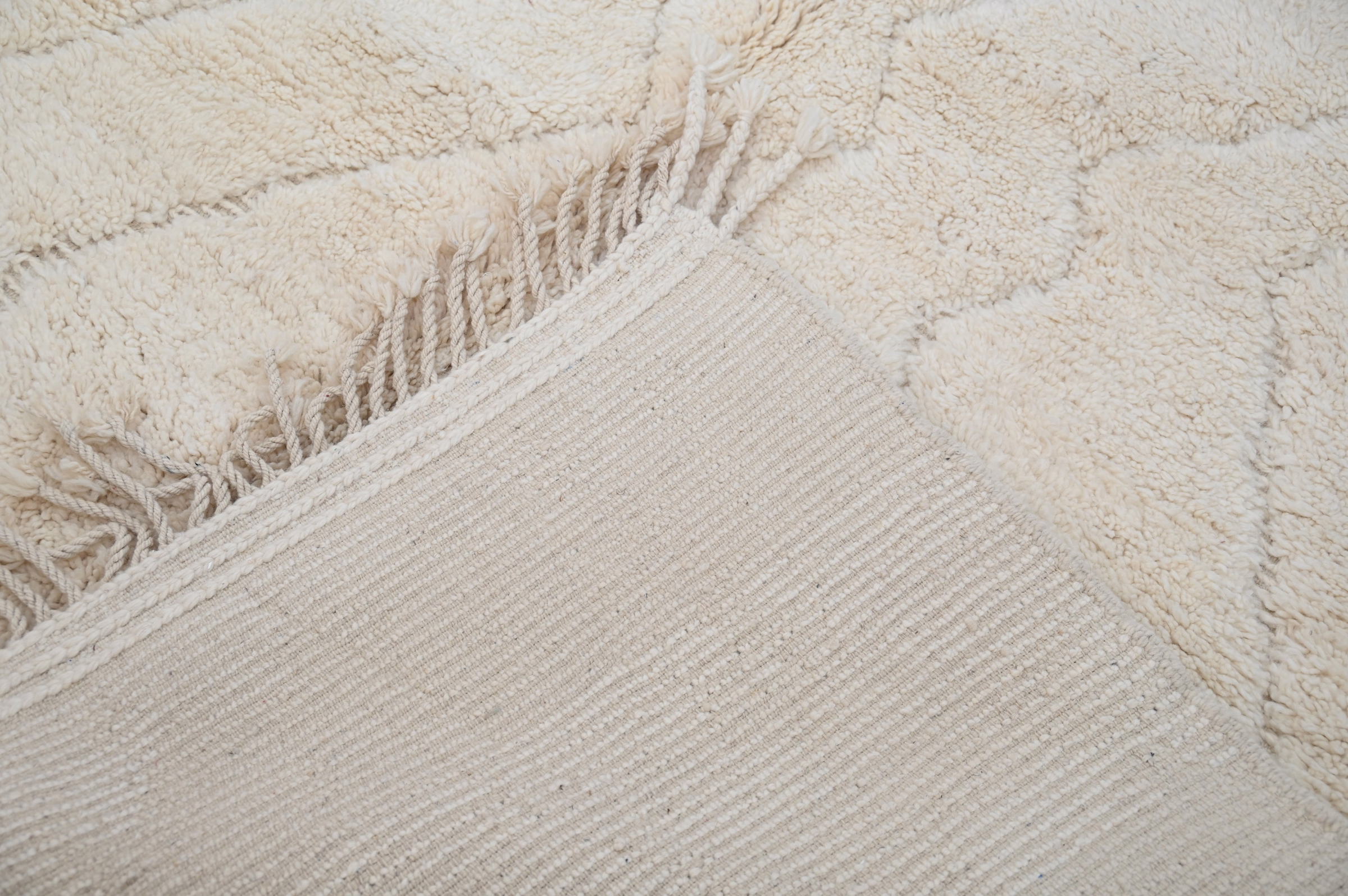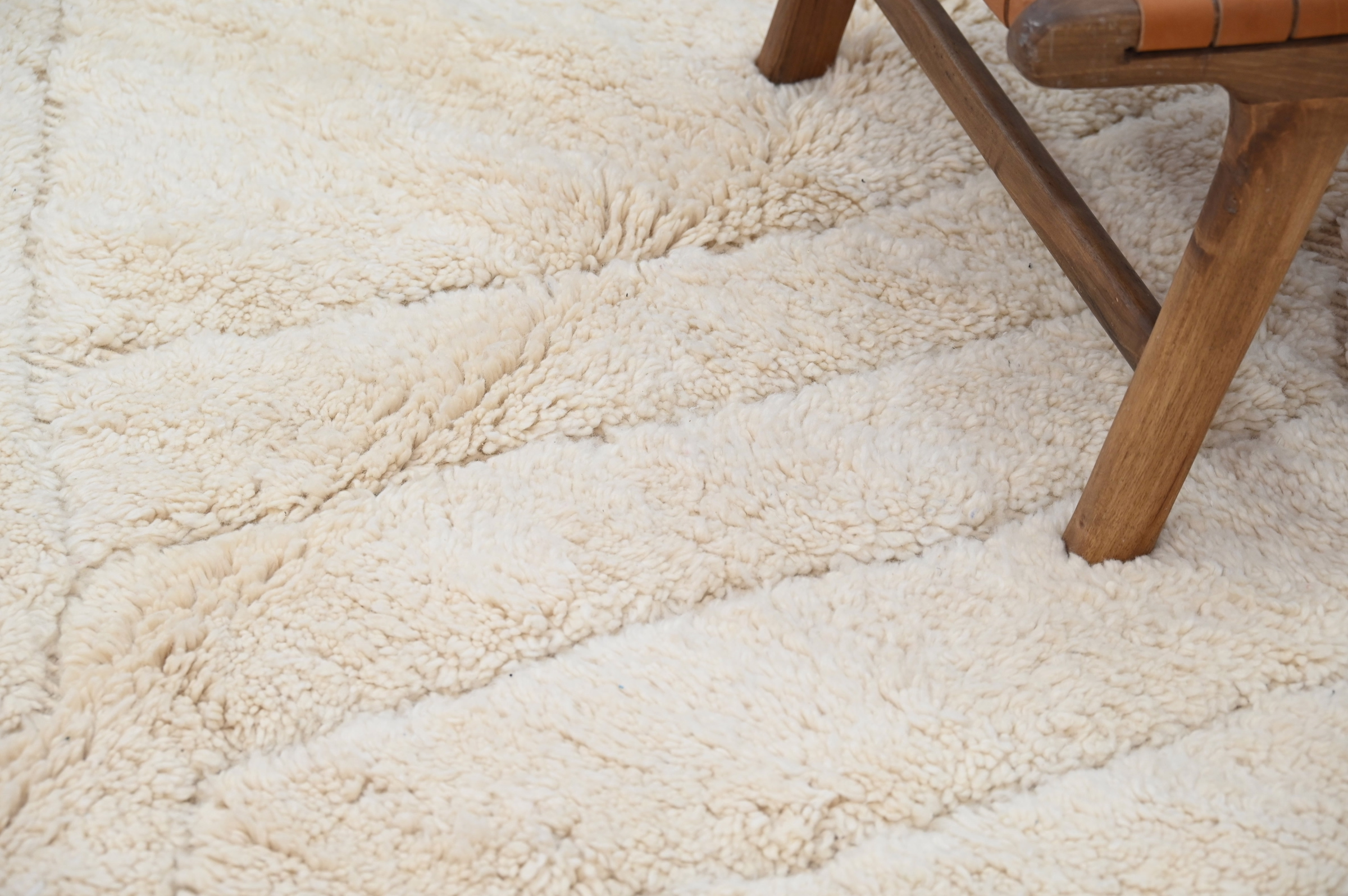 Measuring 300 × 203 cm, the substantial wool rug originates from the Middle Atlas Mountains where Beni Ouarain tribes balance traditional motifs with spontaneous expression. The generous proportions anchor living rooms and bedrooms with grounded presence, while the monochromatic palette integrates seamlessly with varied interior styles. The exceptional pile height delivers warmth and acoustic softening. Free international delivery.