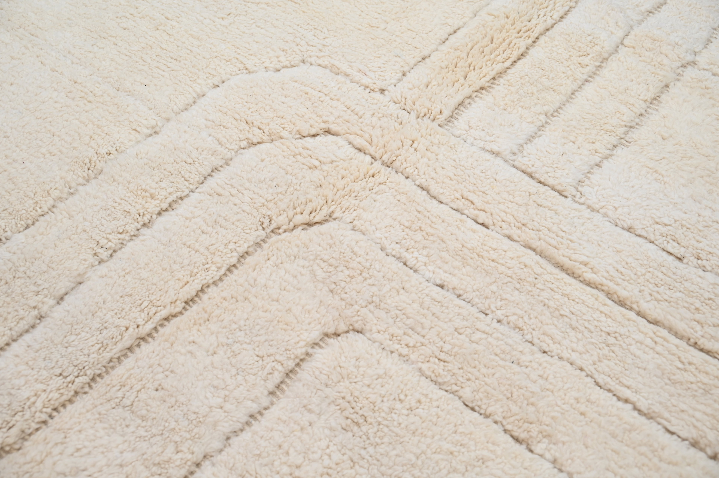 The Beni Ouarain handwoven piece presents subtle geometric labyrinth patterns in charcoal creating contemplative architectural framework across a plush cream field. The minimalist composition emphasizes textural depth, while the high-pile texture delivers luxurious underfoot comfort.