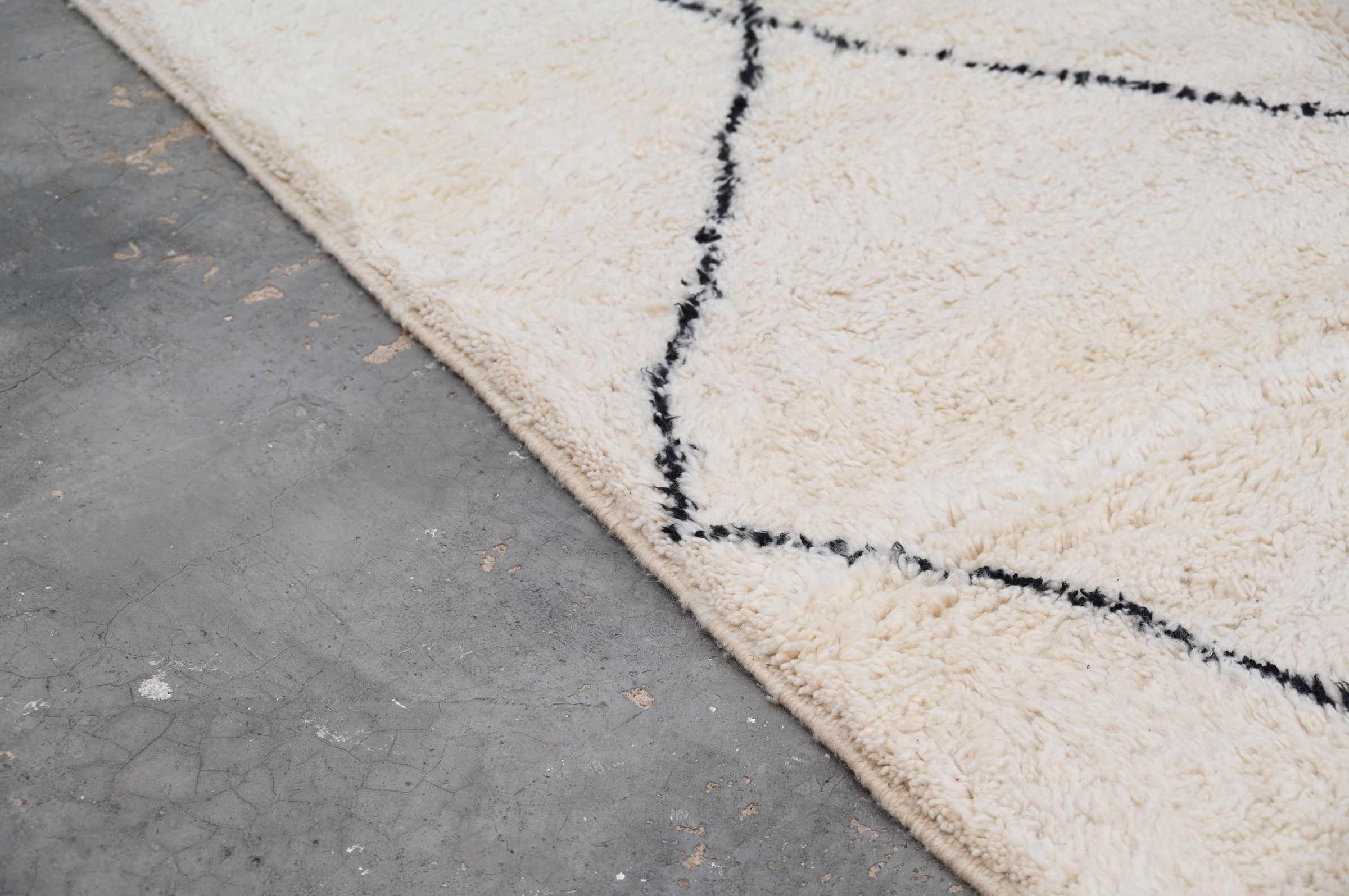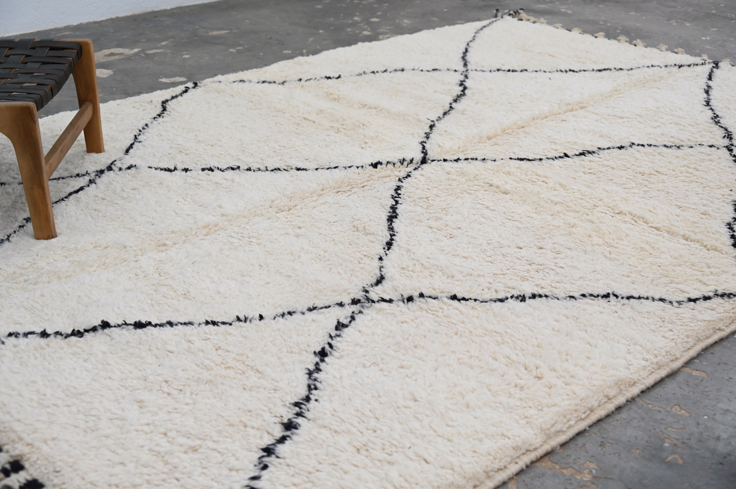 The Beni Ouarain handwoven piece presents bold diamond lattice in charcoal against a plush cream ground. The graphic geometry achieves visual balance through measured spacing and clean line work, embodying the restrained aesthetic of this celebrated Berber weaving tradition.