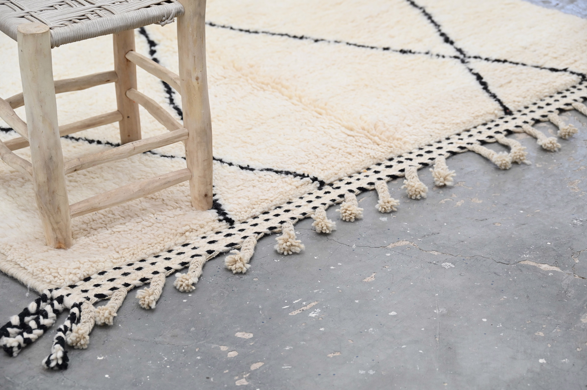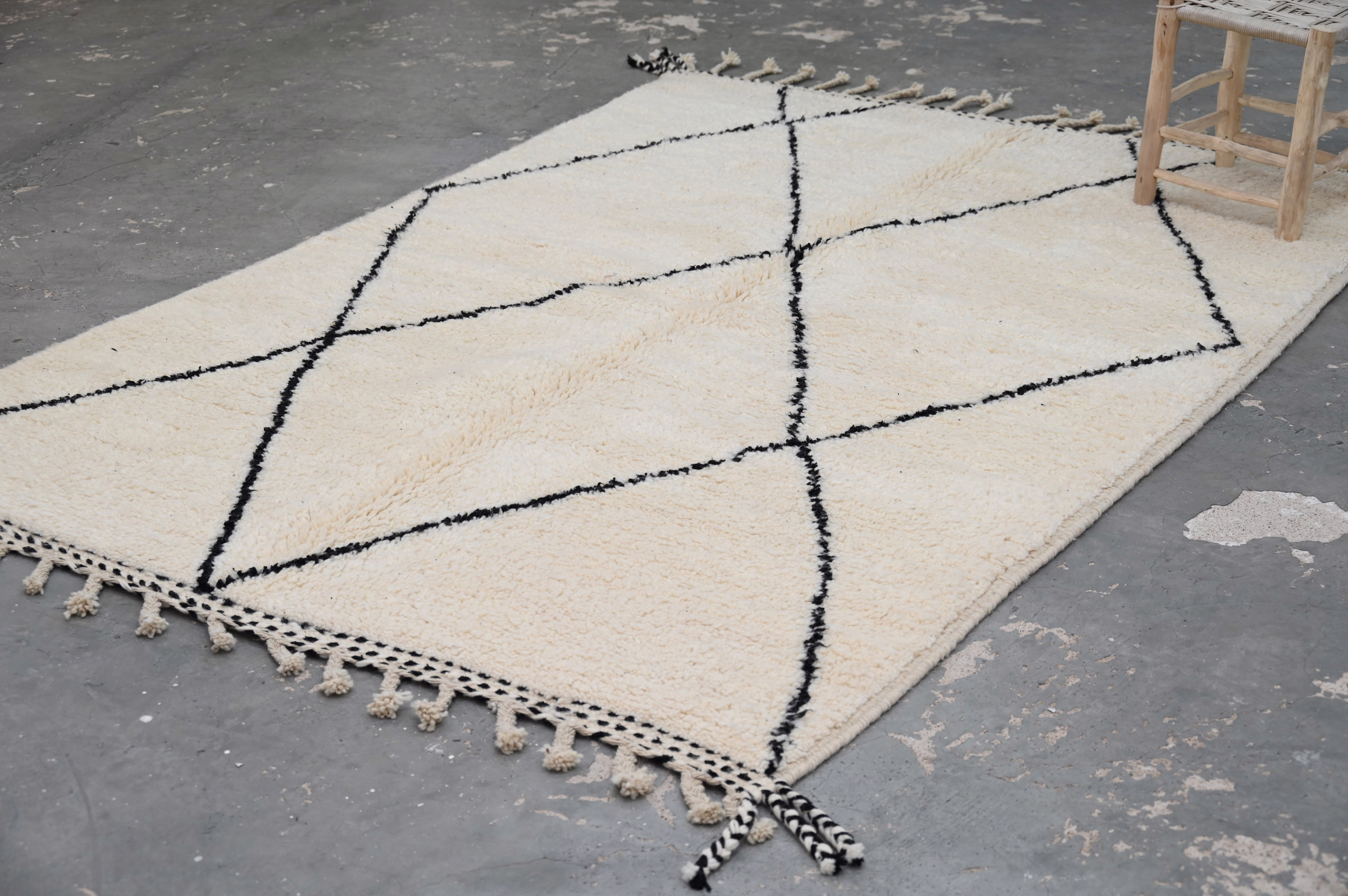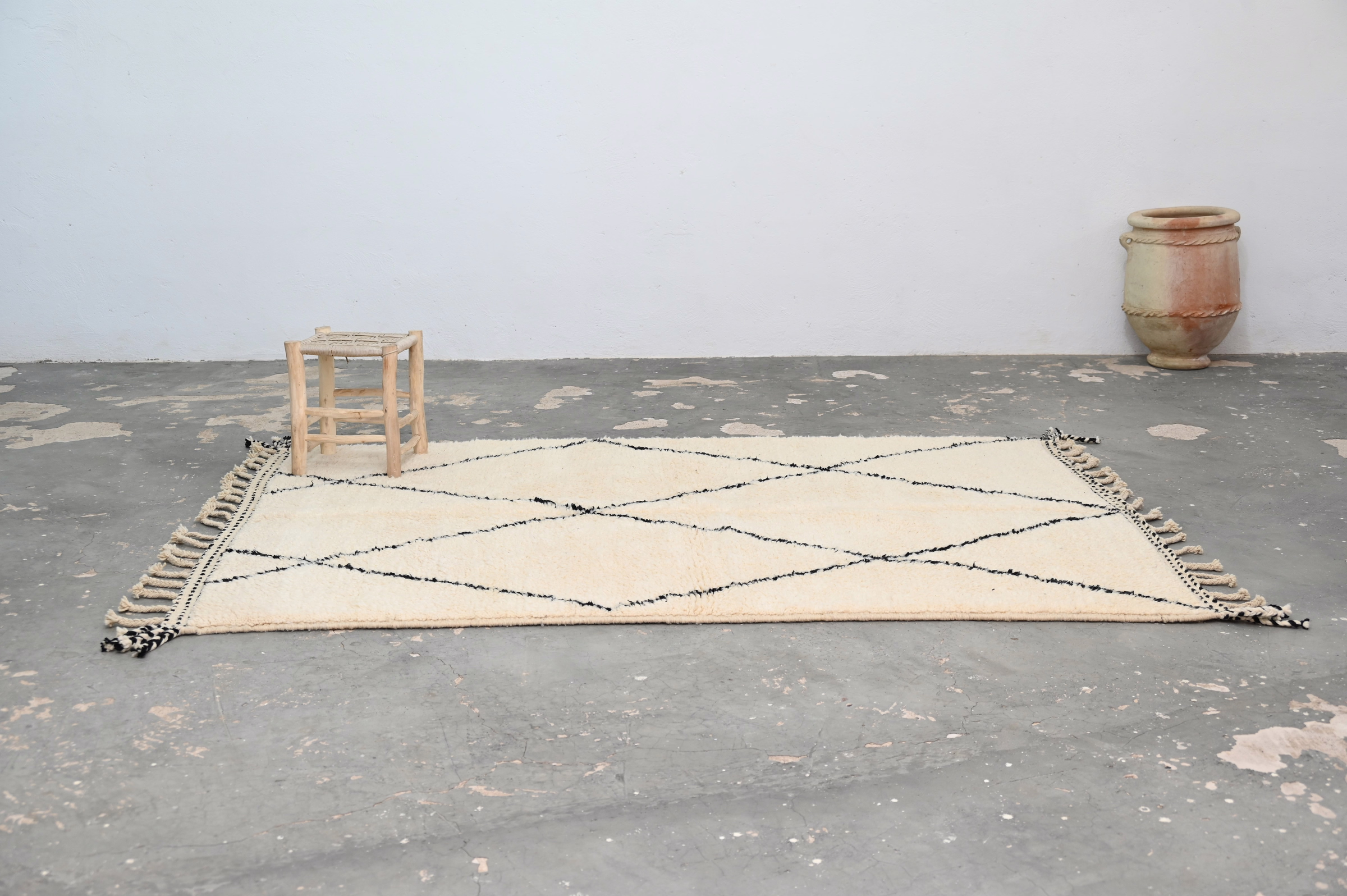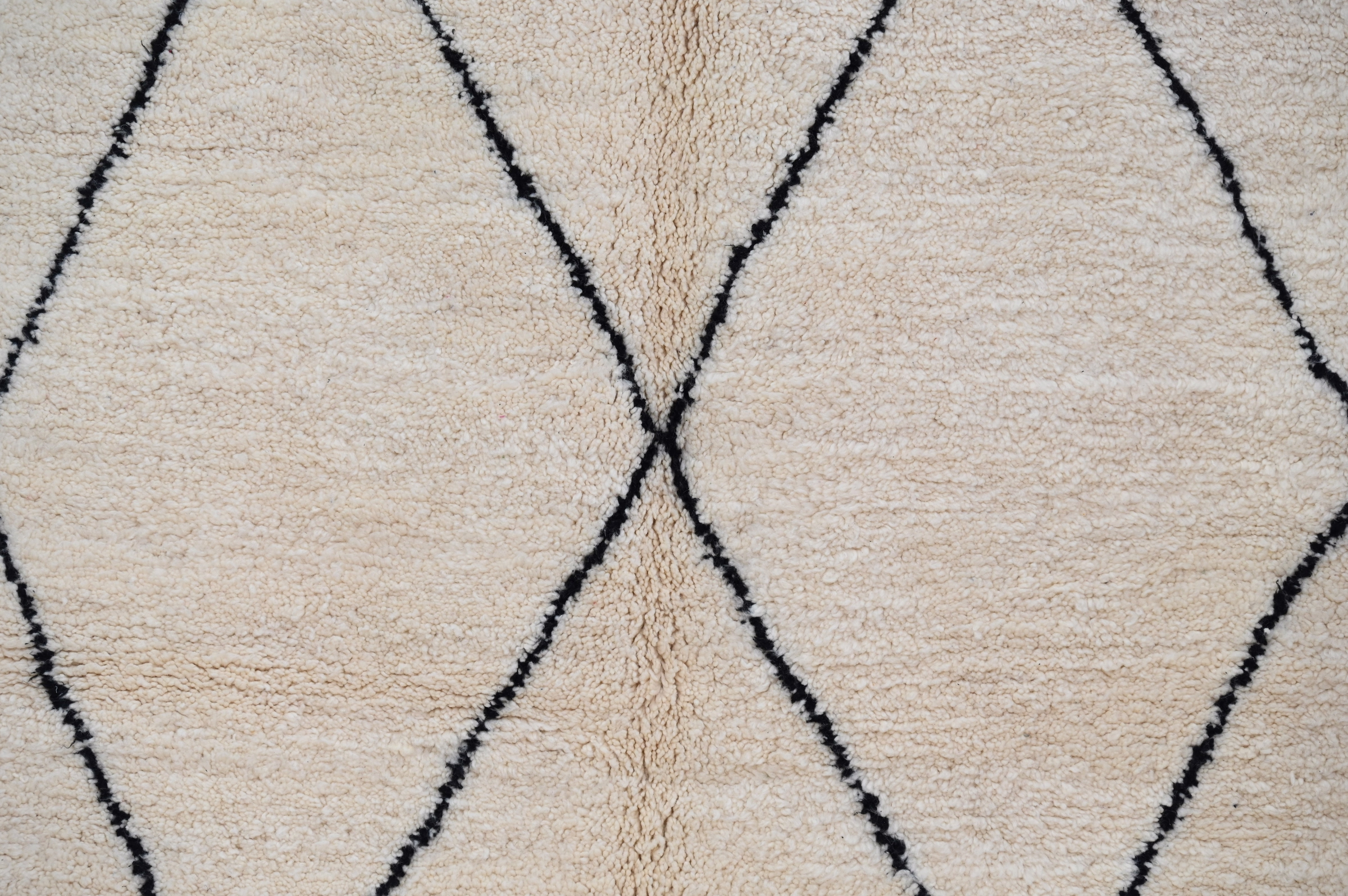 This traditional Beni Ouarain rug presents bold diamond lattice in charcoal against a plush cream ground. The graphic clarity and monochromatic palette create structured visual interest, while the high-pile texture delivers luxurious underfoot comfort.