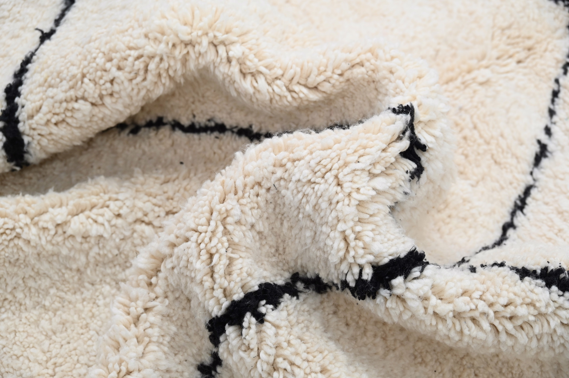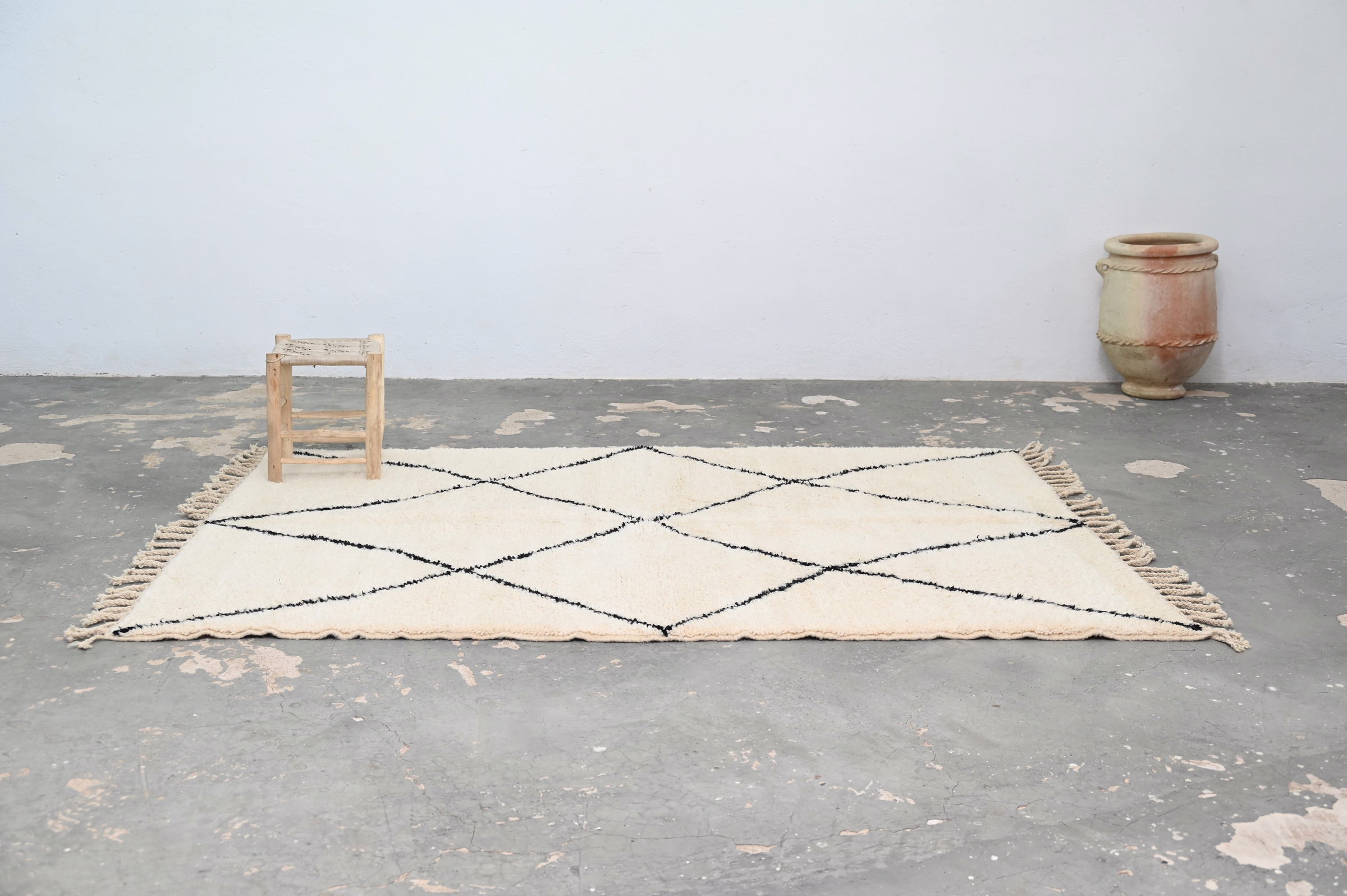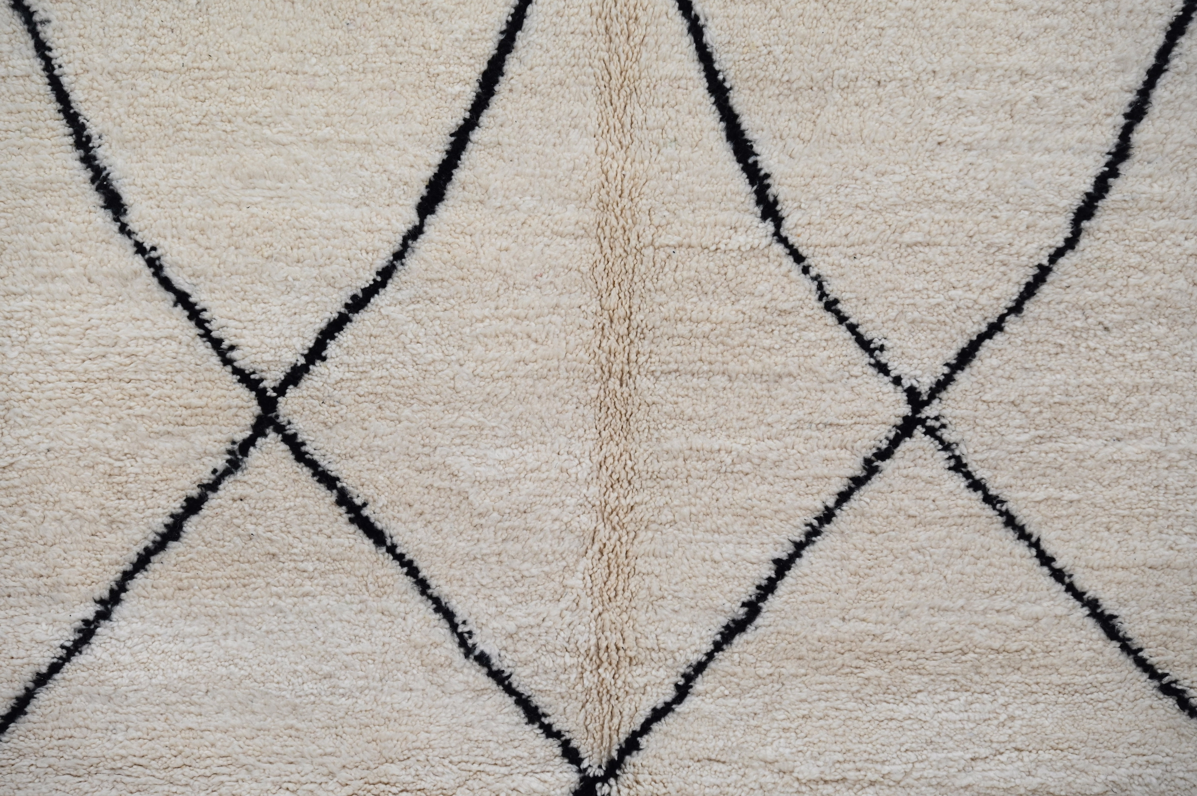 This traditional Beni Ouarain rug presents bold diamond lattice in charcoal creating graphic visual framework across a plush cream field. The minimalist composition emphasizes geometric clarity through structured abstraction, while the high-pile texture delivers luxurious underfoot comfort.