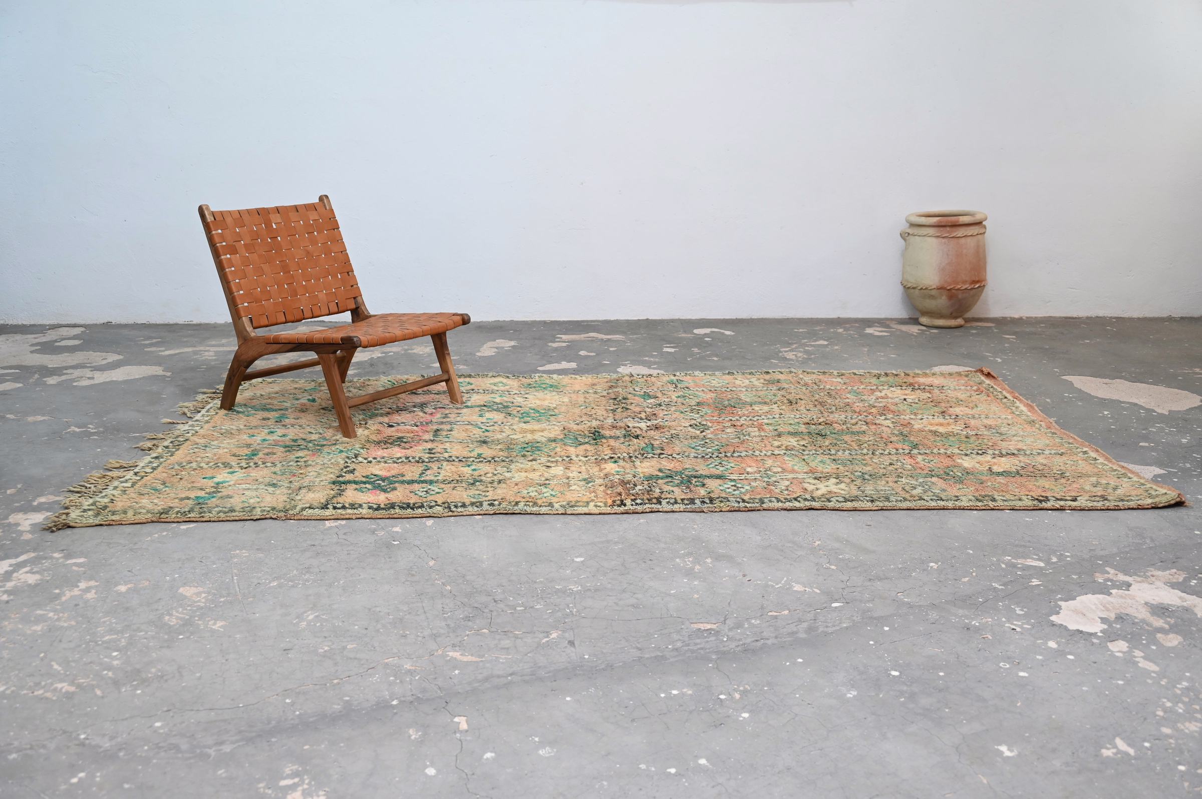 Measuring 323 × 168 cm, this virgin wool rug from Morocco's Atlas Mountains demonstrates enduring craft quality through authentic patina. The generous proportions suit living rooms and bedrooms, while the time-softened emerald palette integrates beautifully with both vintage-inspired and contemporary interiors. The intricate geometric framework delivers exceptional visual depth. Free international delivery.