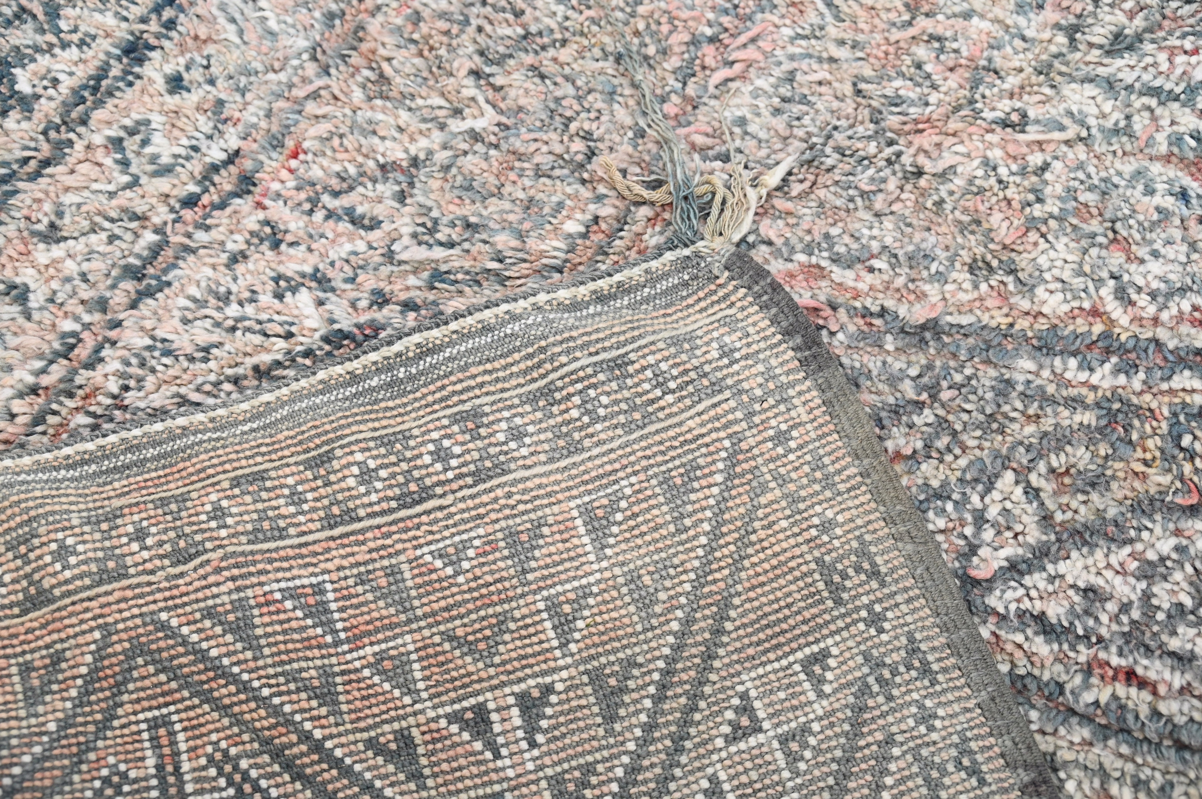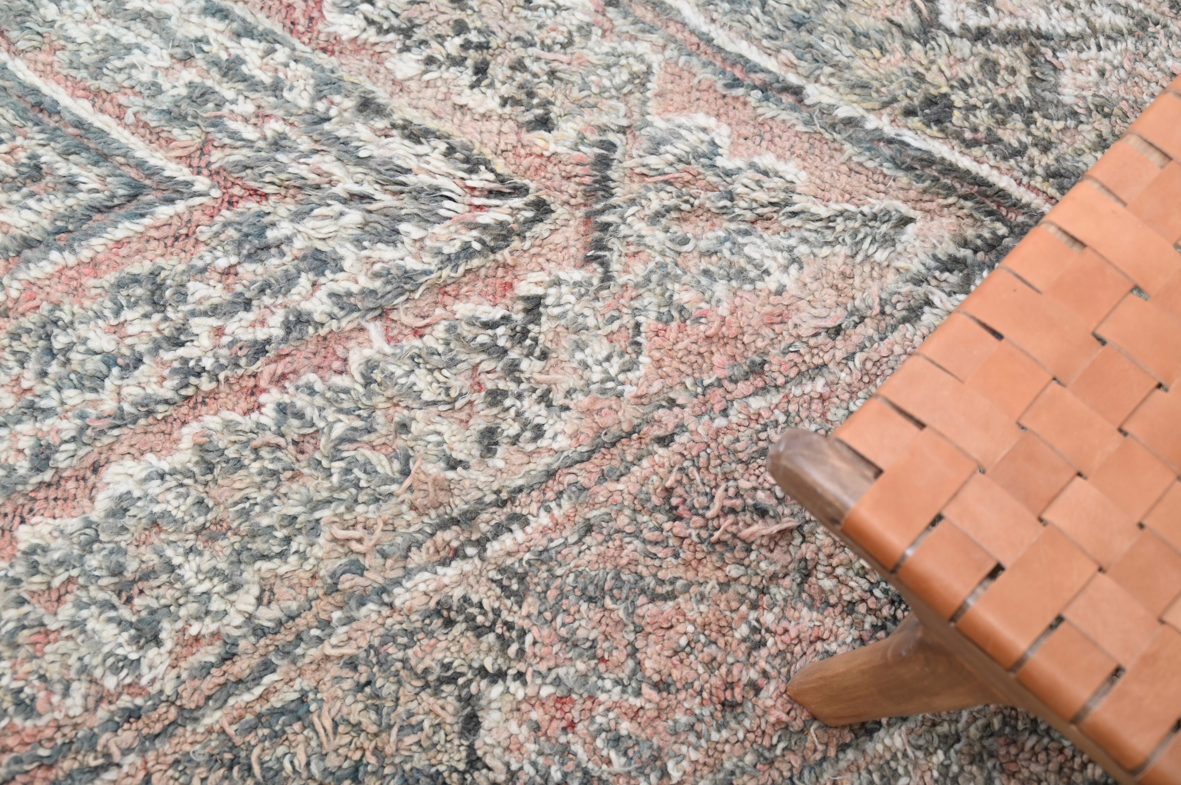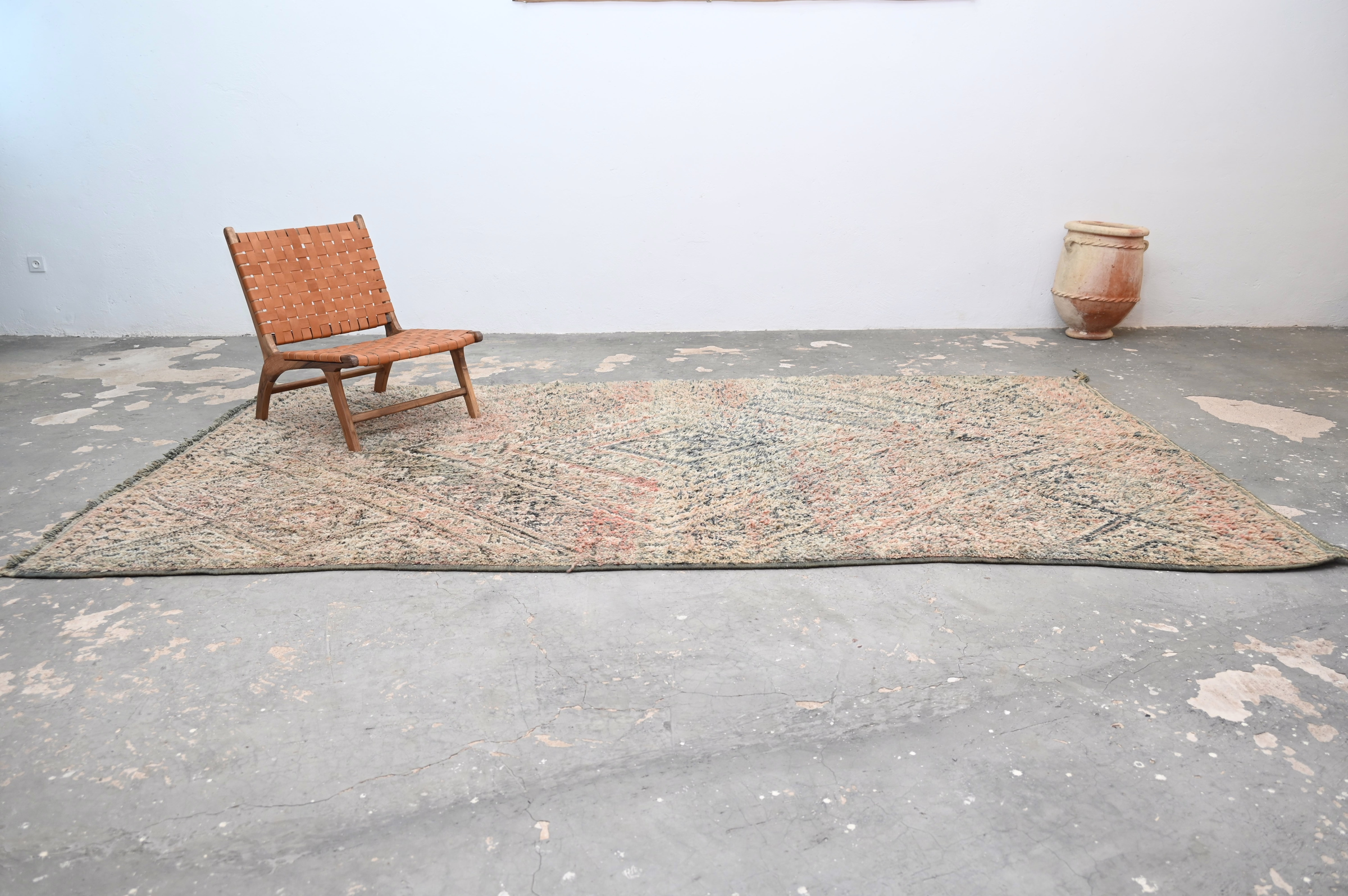 Measuring 374 × 205 cm, the substantial virgin wool rug from Morocco's Atlas Mountains demonstrates enduring craft quality through authentic patina. The generous proportions suit large living rooms and bedrooms, while the time-softened neutral palette integrates seamlessly with serene contemporary interiors. The intricate diamond framework delivers contemplative visual depth. Free international delivery.