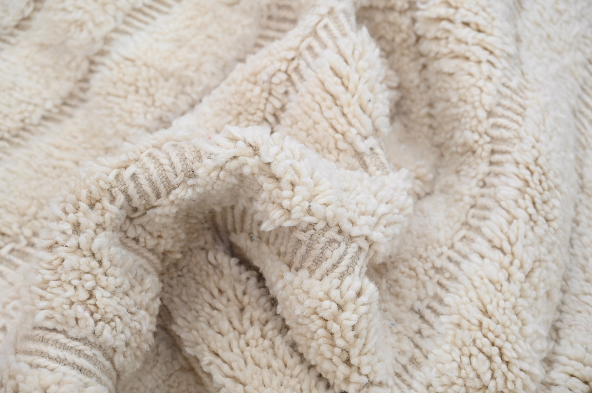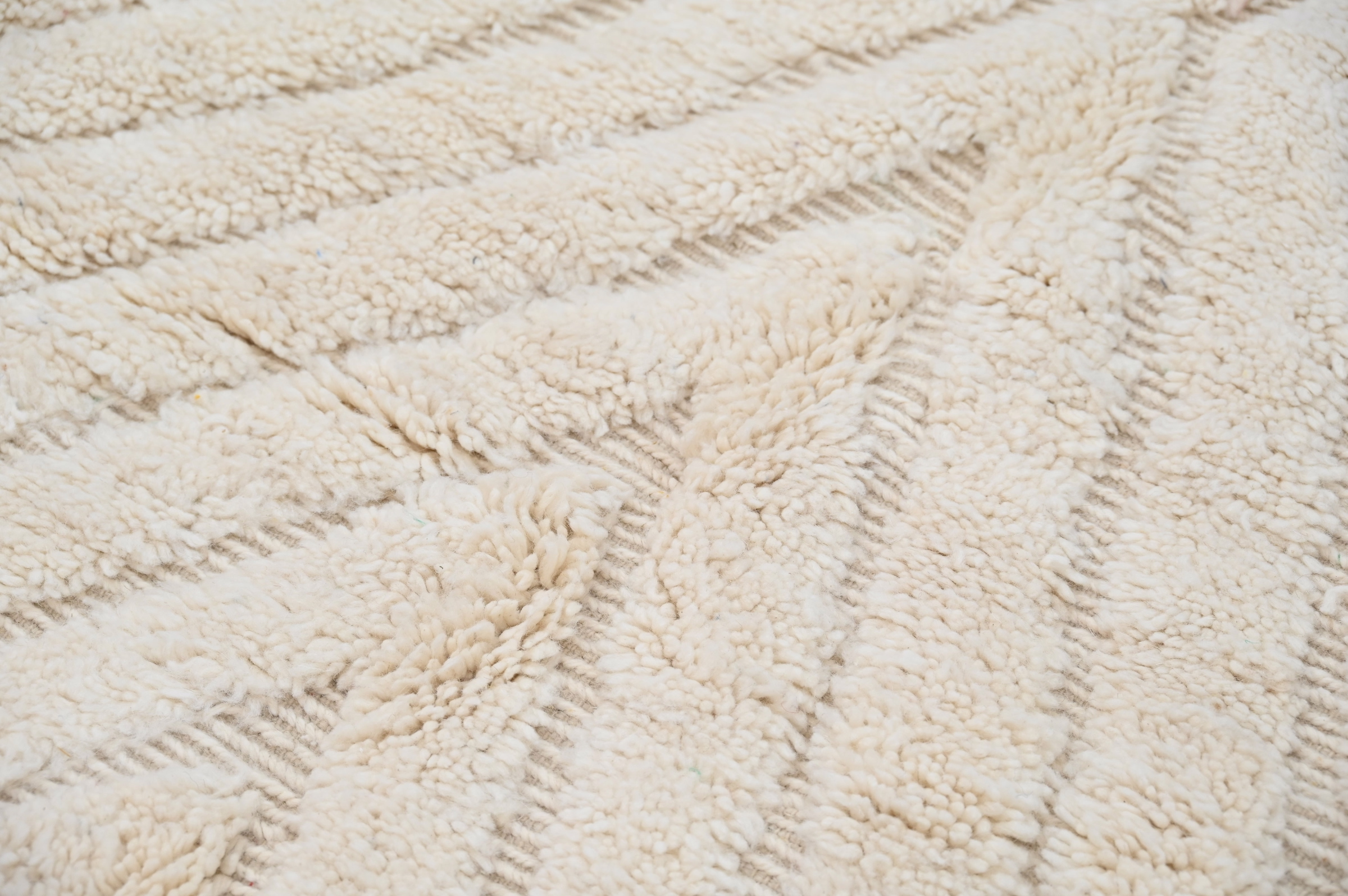 This Beni Ouarain handwoven piece presents subtle chevron patterns embossed into a luxurious cream ground. The tonal composition emphasizes textural relief and sculptural depth over graphic contrast, creating contemplative visual interest through light and shadow play across the high-pile surface.
