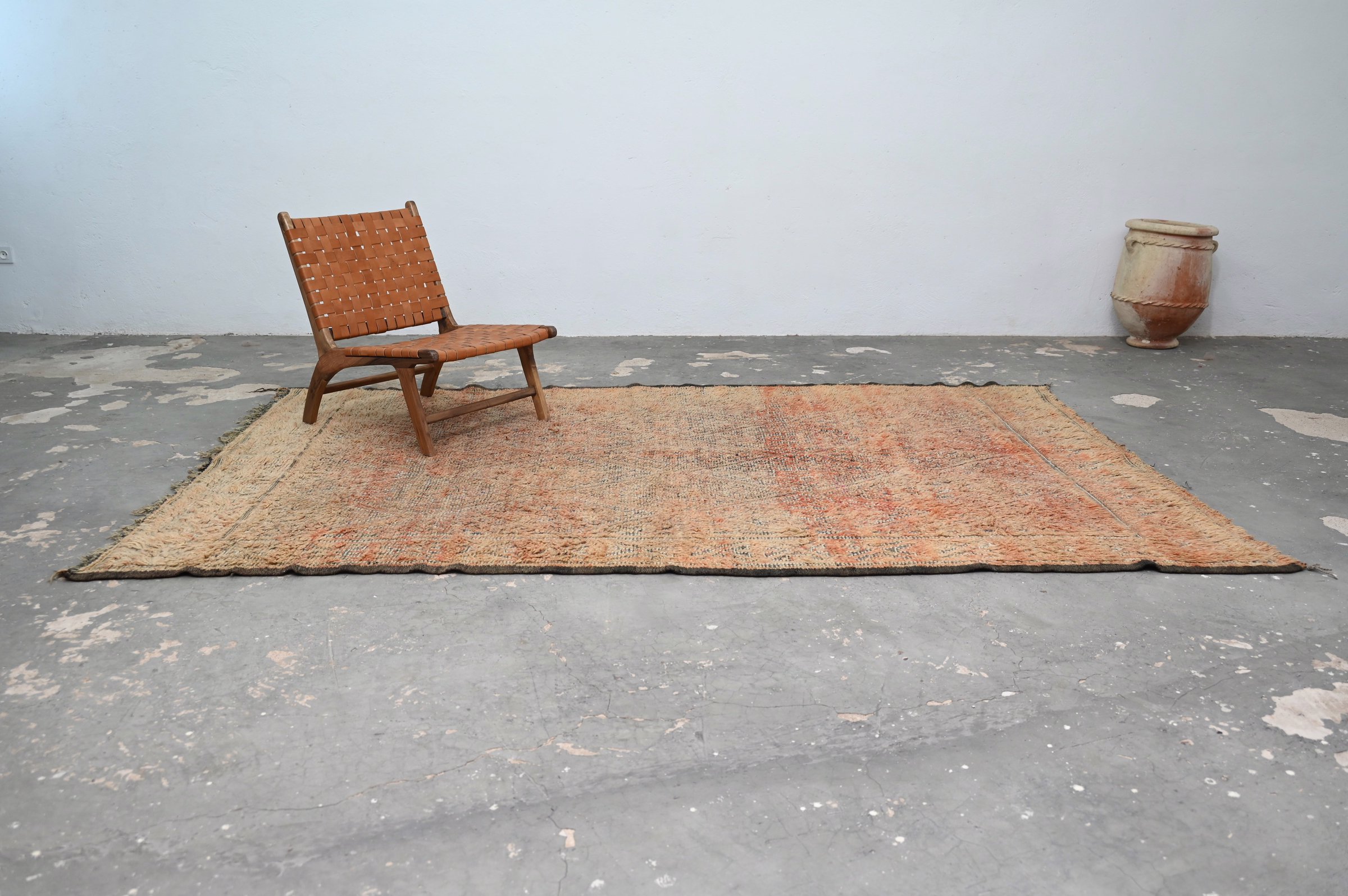 Mesurant 310 × 208 cm, le tapis substantiel en laine vierge des montagnes de l'Atlas marocain démontre une qualité artisanale durable par une patine authentique. Les proportions généreuses conviennent aux salons et chambres, tandis que la palette terracotta adoucie par le temps s'intègre parfaitement aux intérieurs d'inspiration vintage et contemporains. Le cadre de diamants complexe offre une profondeur visuelle contemplative. Livraison internationale gratuite.