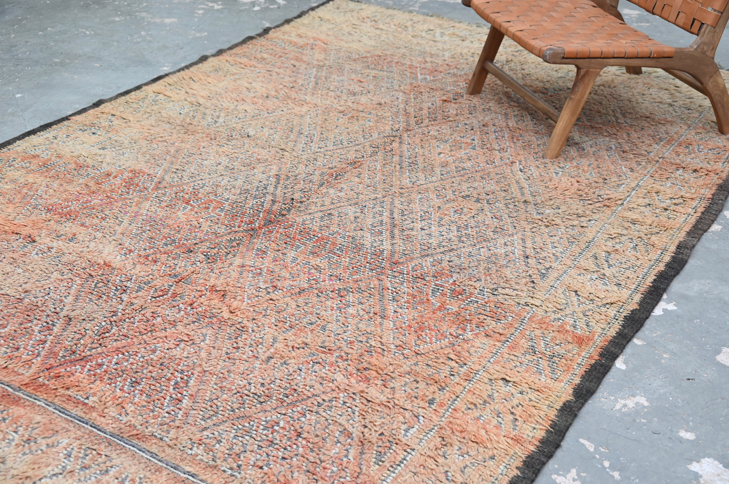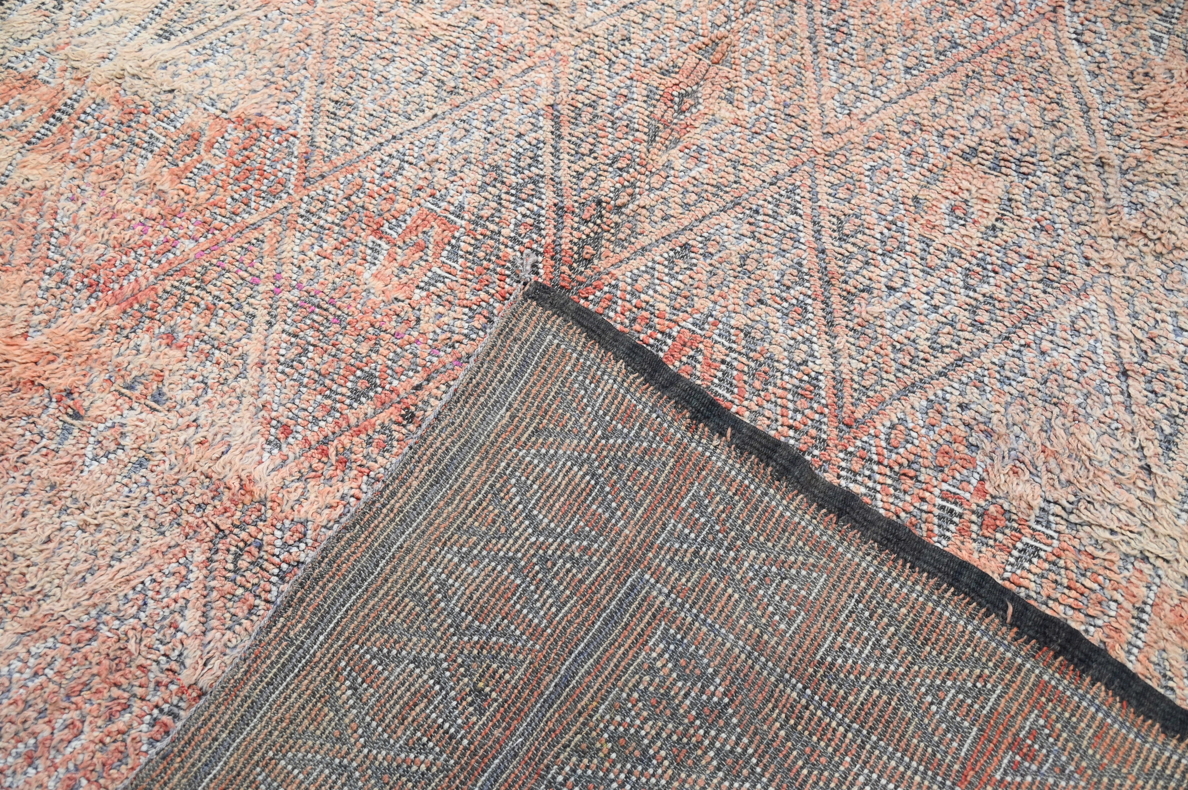 Ce tapis vintage traditionnel présente un cadre de treillis de diamants complexe en terracotta délavé et anthracite sur fond corail-beige. Des décennies d'utilisation ont adouci les motifs en contraste doux comme un murmure, tandis que la composition géométrique complexe met en valeur une précision de tissage berbère exceptionnelle par une décoration élaborée.