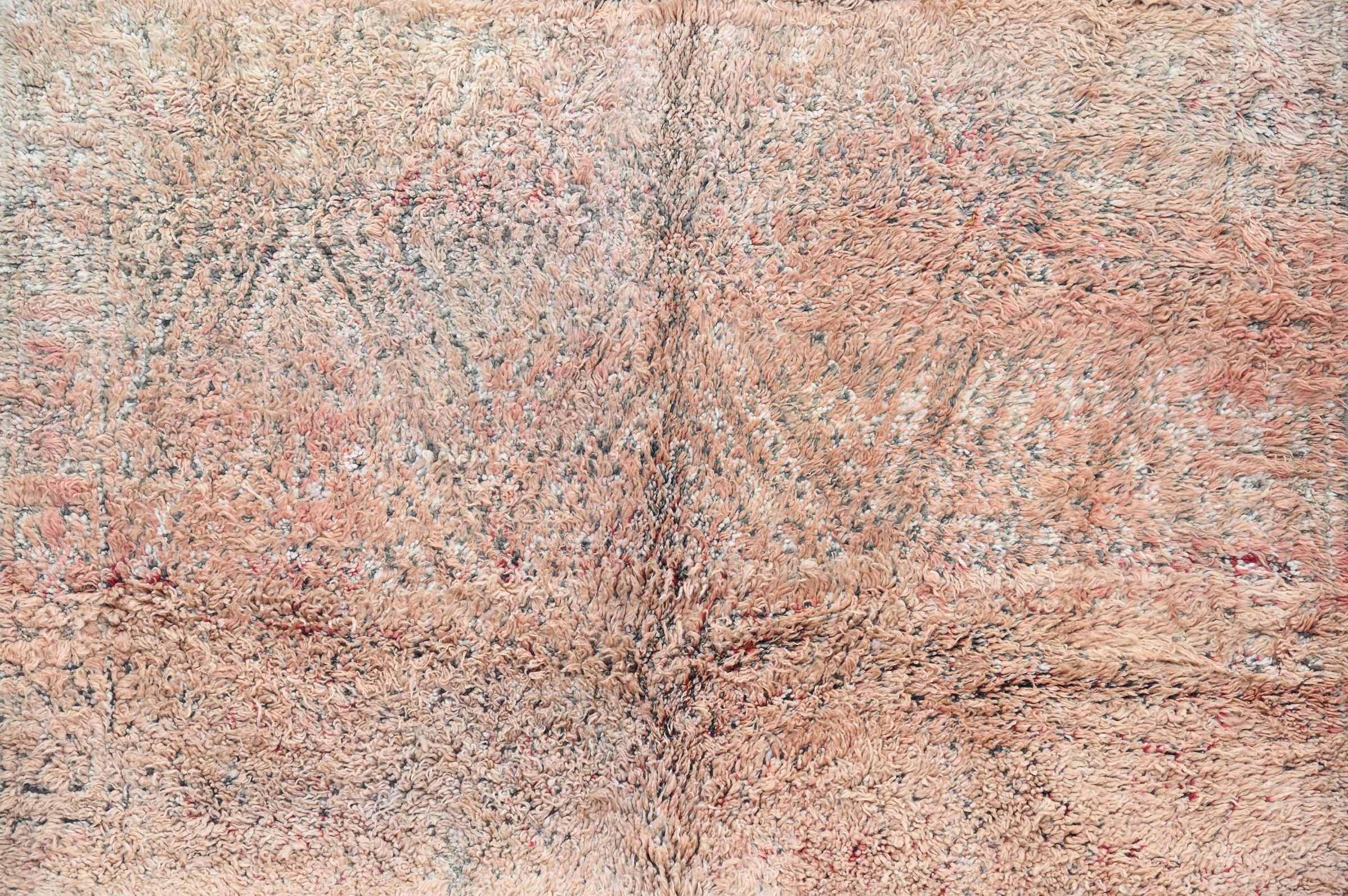 This vintage handwoven piece presents saturated coral pink with subtle scattered tribal symbols barely visible through rich patina. Decades of use have created exceptional material depth across the wool, while the minimalist patterning showcases restraint and color saturation.