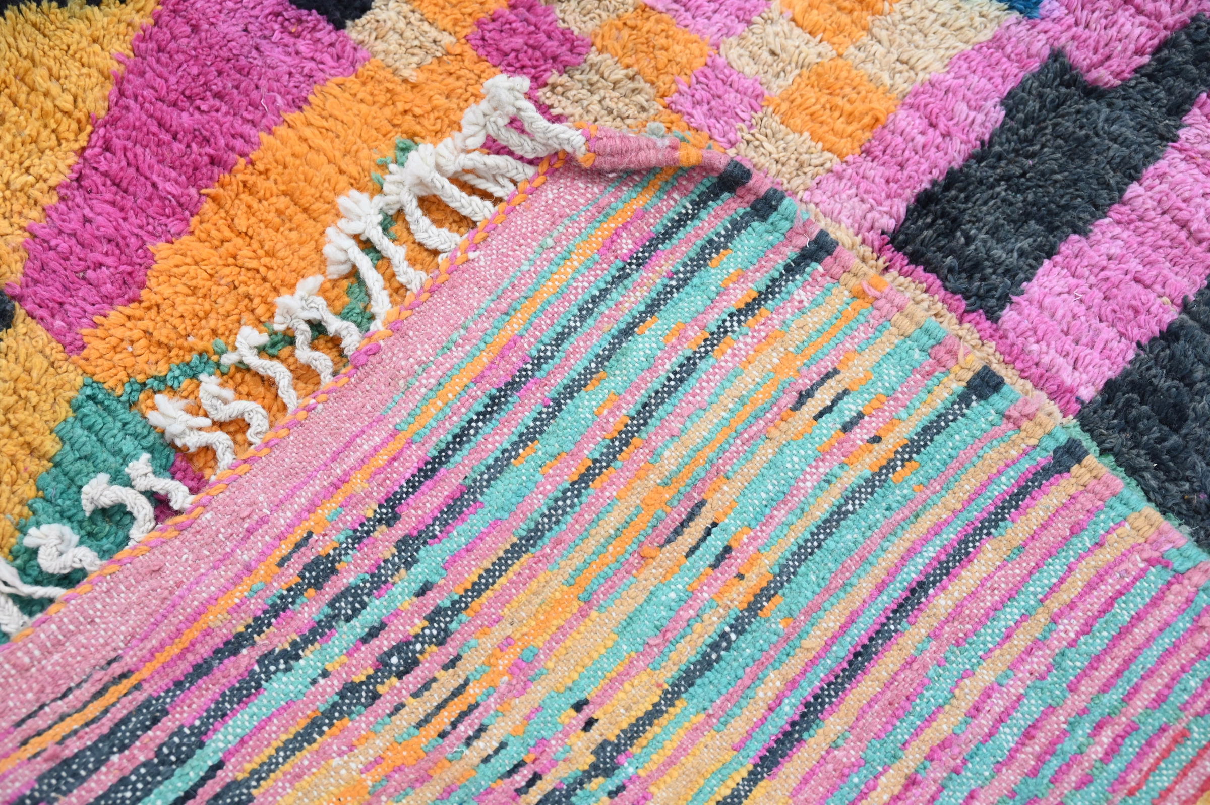 The Azilal handwoven piece celebrates chromatic maximalism through horizontal banded composition with geometric symbols in magenta, turquoise, coral, emerald green, golden yellow, and charcoal. The exuberant composition and vibrant palette create spontaneous visual rhythm characteristic of contemporary Azilal aesthetic.