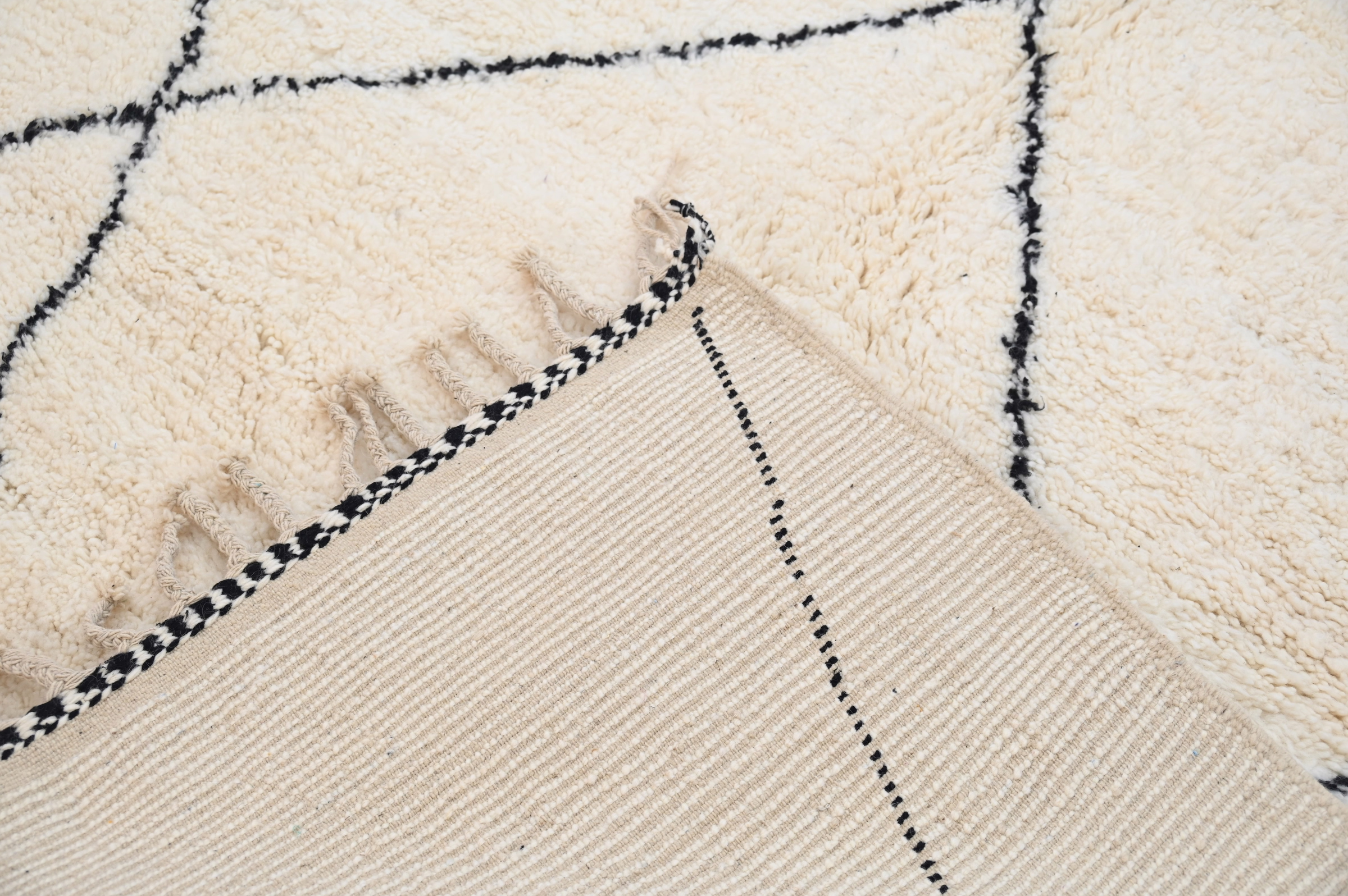 This Beni Ouarain handwoven piece presents a minimalist diamond lattice in charcoal against a luxurious cream ground. The geometric framework achieves visual balance through measured spacing and consistent line weight, embodying the restrained aesthetic of this celebrated Berber weaving tradition.
