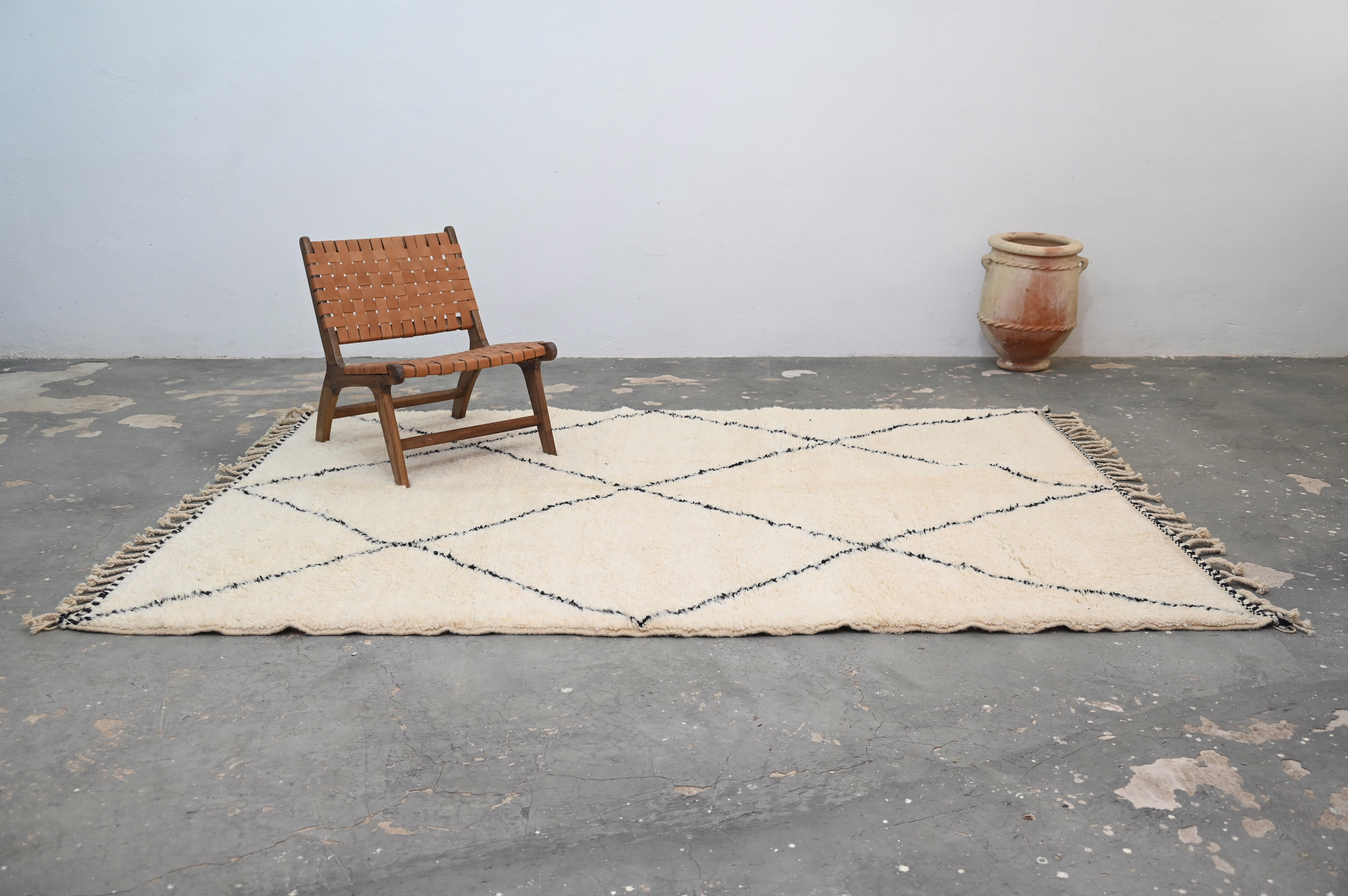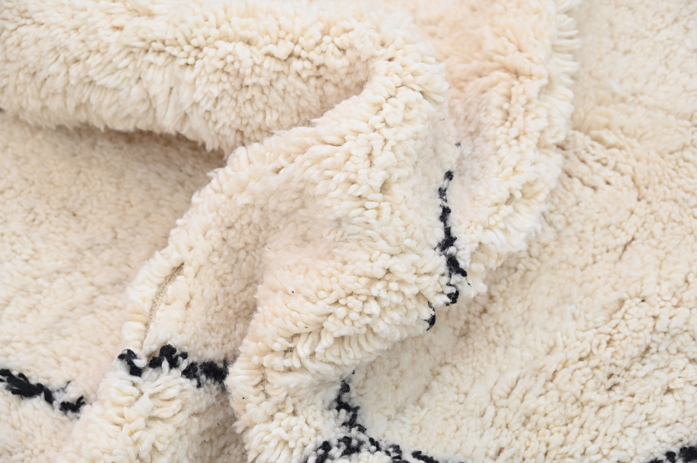 Measuring 300 × 210 cm, the substantial wool rug originates from the Middle Atlas Mountains where Beni Ouarain tribes have refined thick-pile weaving techniques over generations. The generous proportions anchor living rooms and bedrooms with grounded presence, while the monochromatic palette ensures versatility across interior styles. The plush pile height delivers exceptional warmth and acoustic softening, transforming minimalist spaces into tactile sanctuaries. Free international delivery.