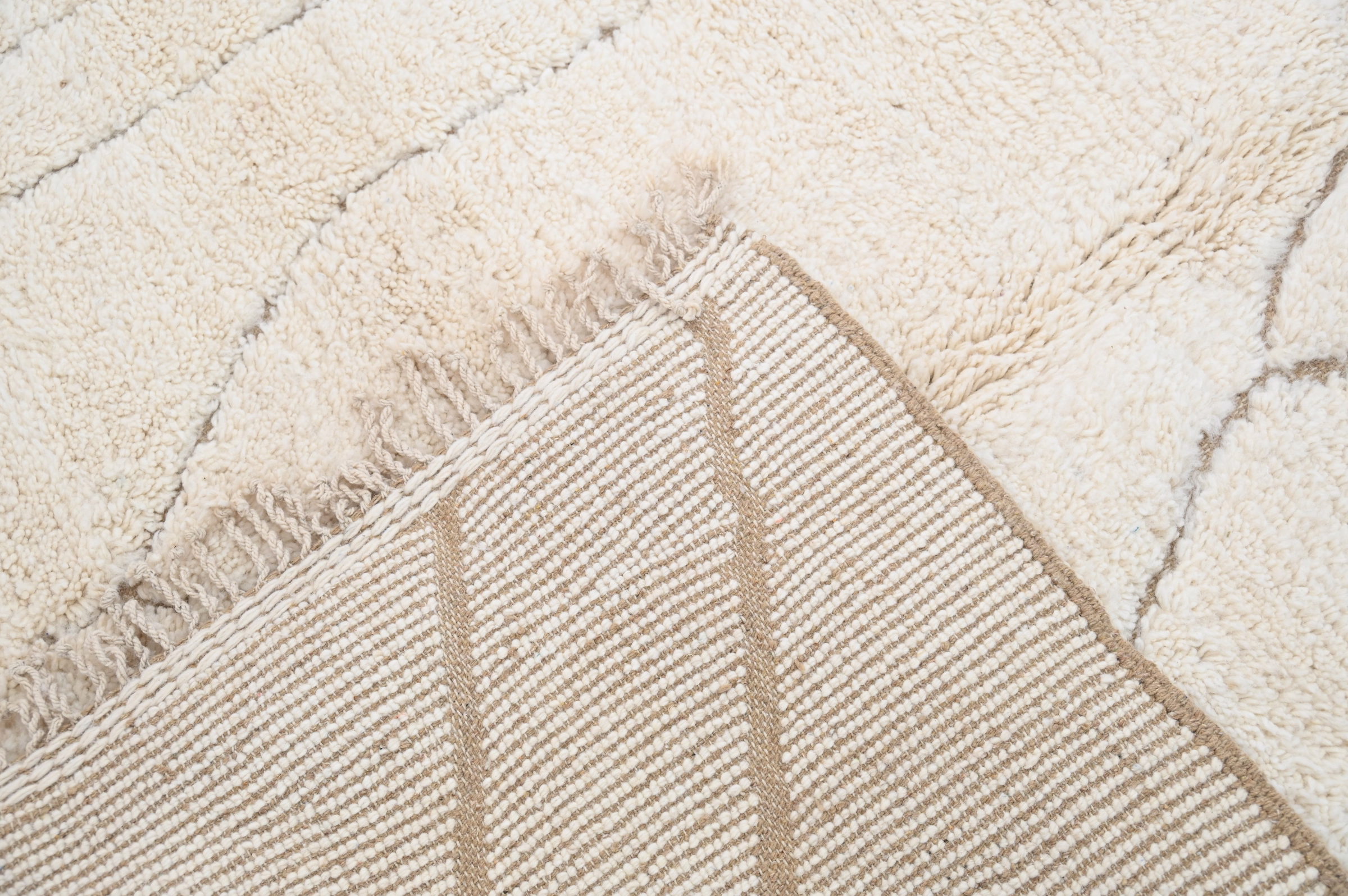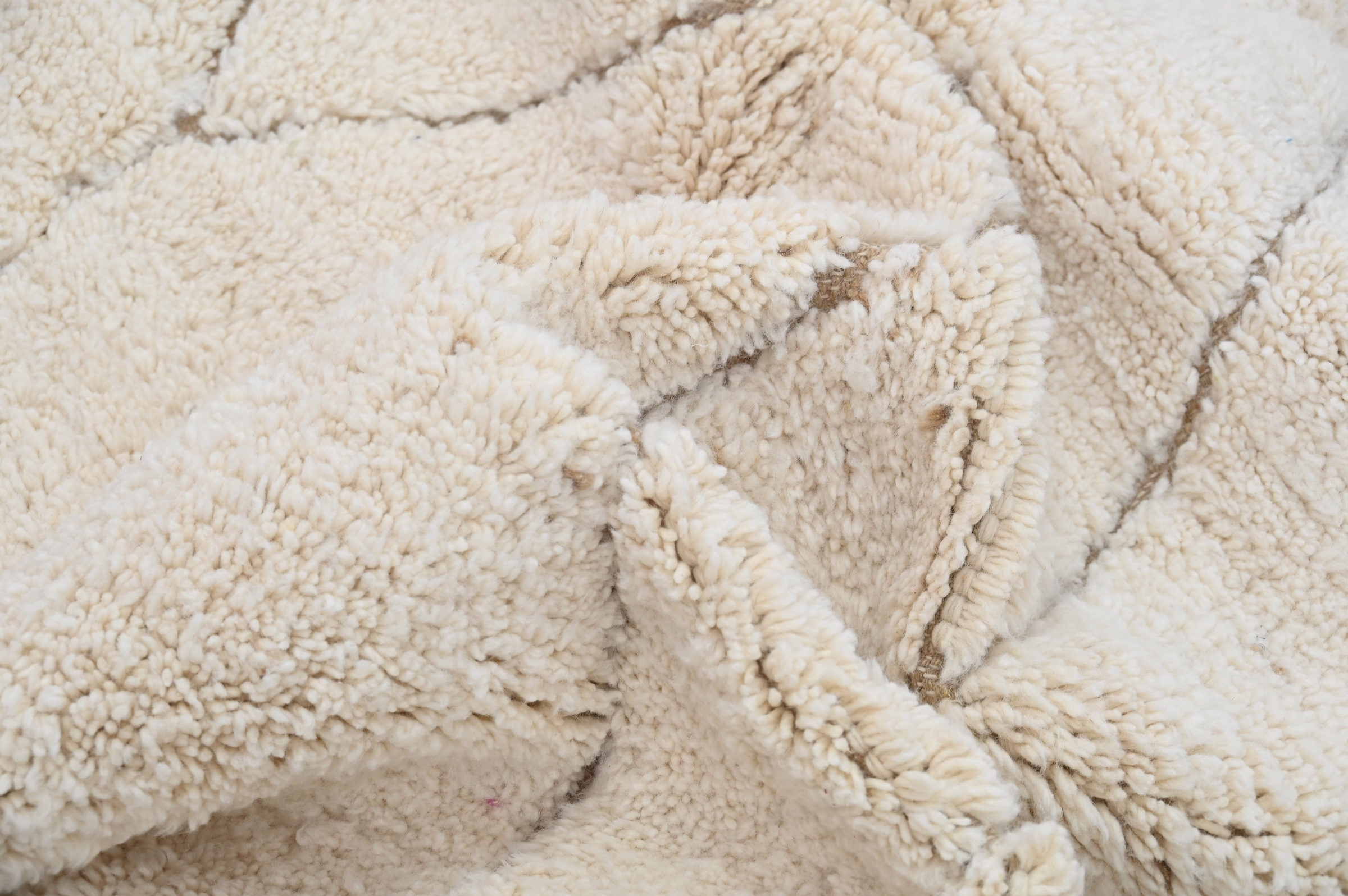 Measuring 306 × 200 cm, this substantial wool piece originates from the Middle Atlas Mountains where Beni Ouarain tribes balance traditional motifs with contemporary expression. The generous proportions anchor living rooms and bedrooms with grounded presence, while the monochromatic palette ensures versatility across interior styles. The exceptional pile height delivers warmth and acoustic softening. Free international delivery.