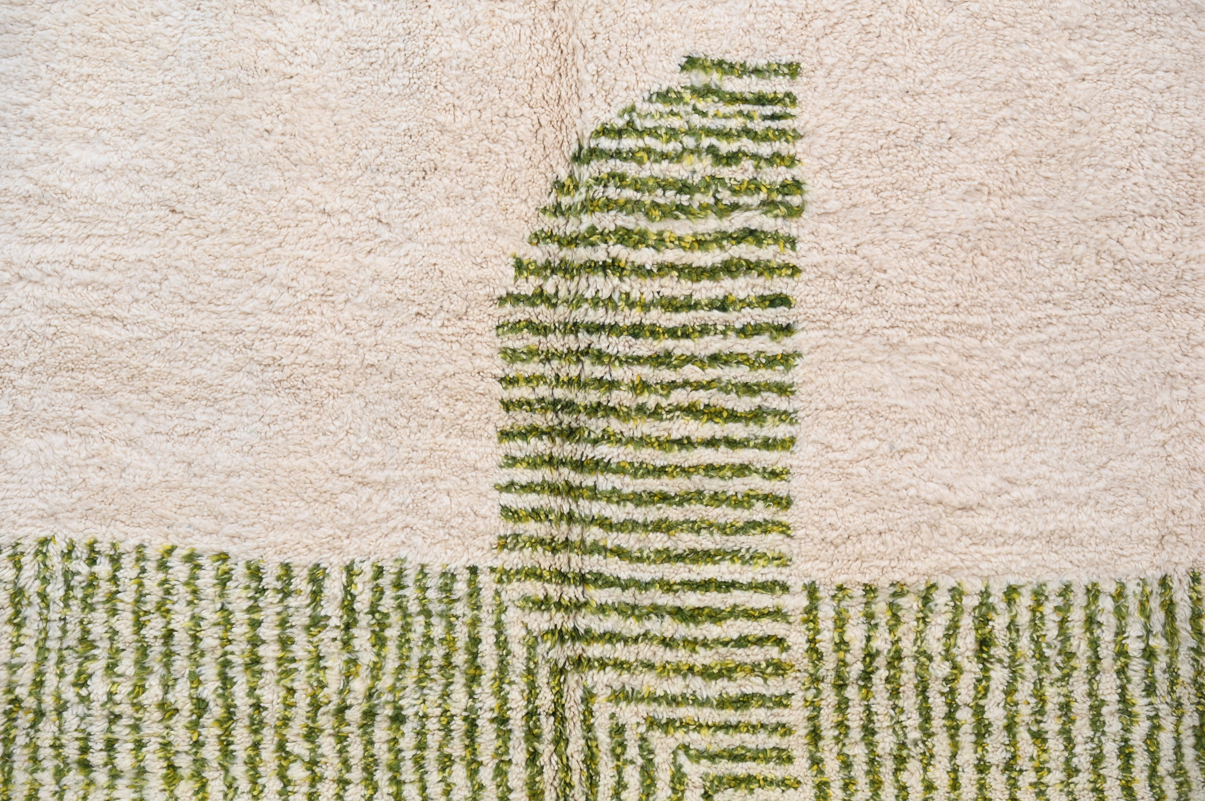 The Azilal handwoven piece presents bold color blocking composition with horizontal banded framework in olive green against cream ground. The contemporary composition and graphic palette create architectural presence characteristic of modern Azilal aesthetic.
