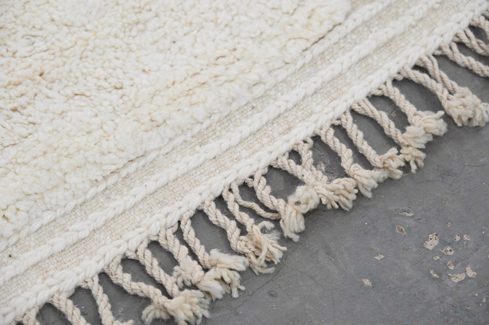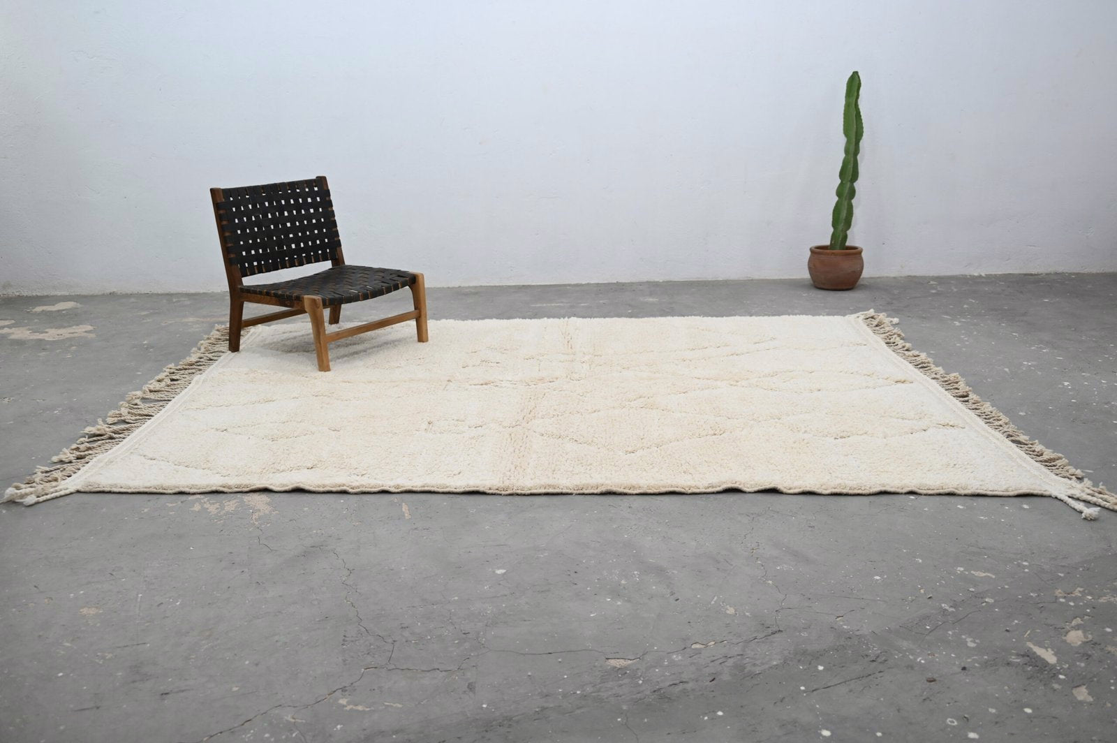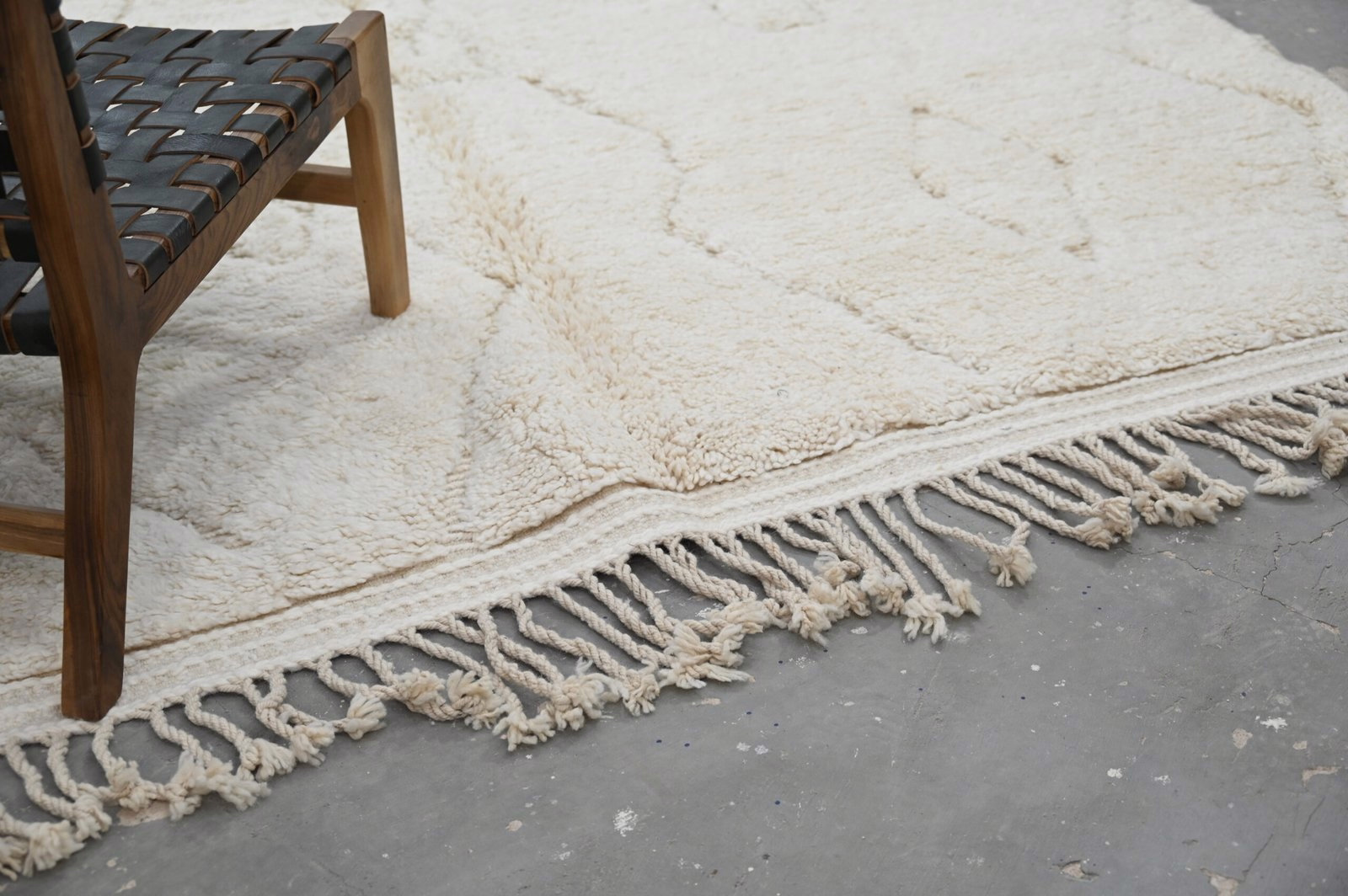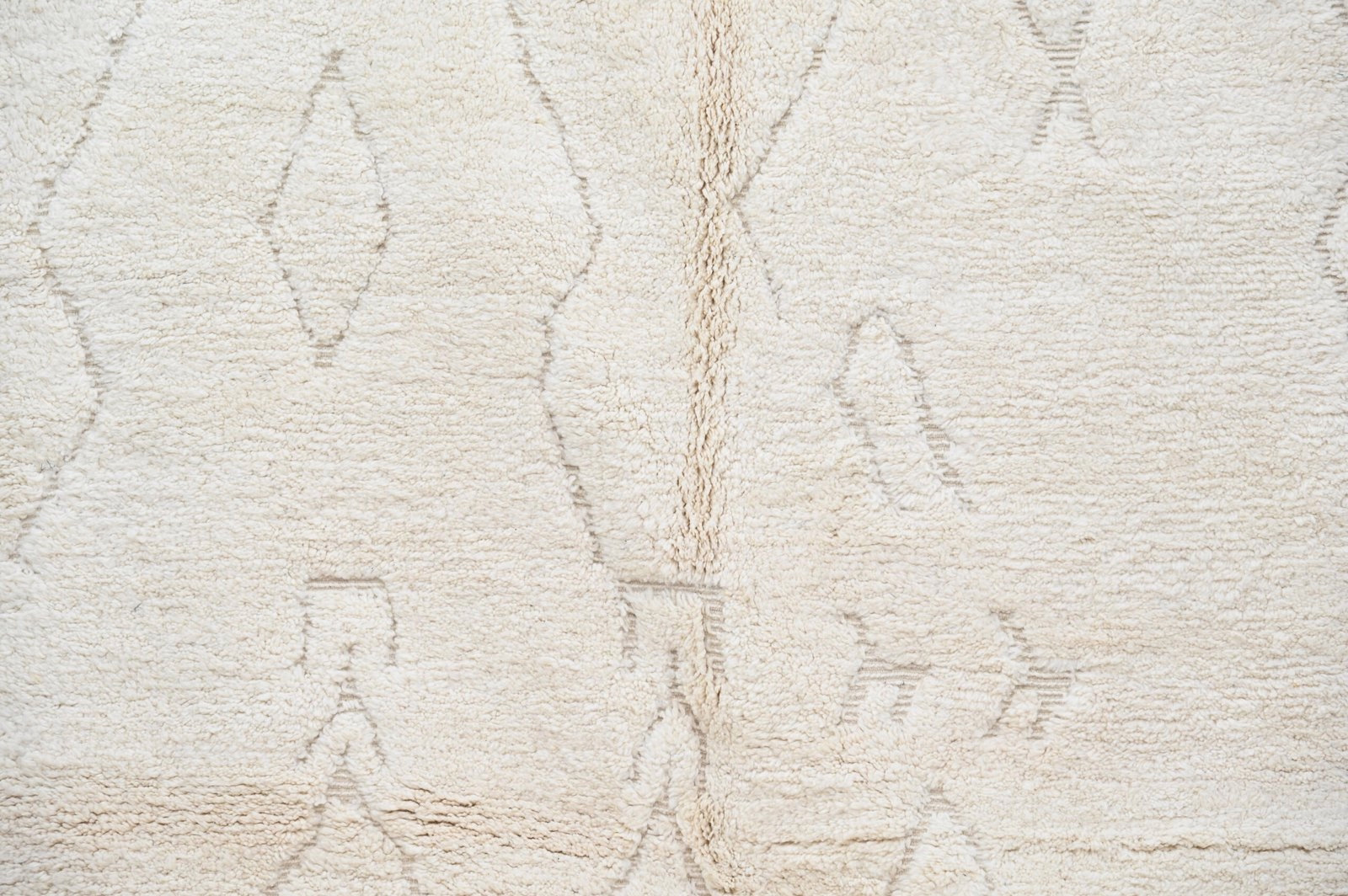 The Beni Ouarain handwoven piece presents subtle asymmetric diamond forms in charcoal that flow across a plush cream field. The organic placement and minimal mark-making create gentle visual rhythm, while the high-pile texture invites tactile engagement and delivers luxurious underfoot comfort.
