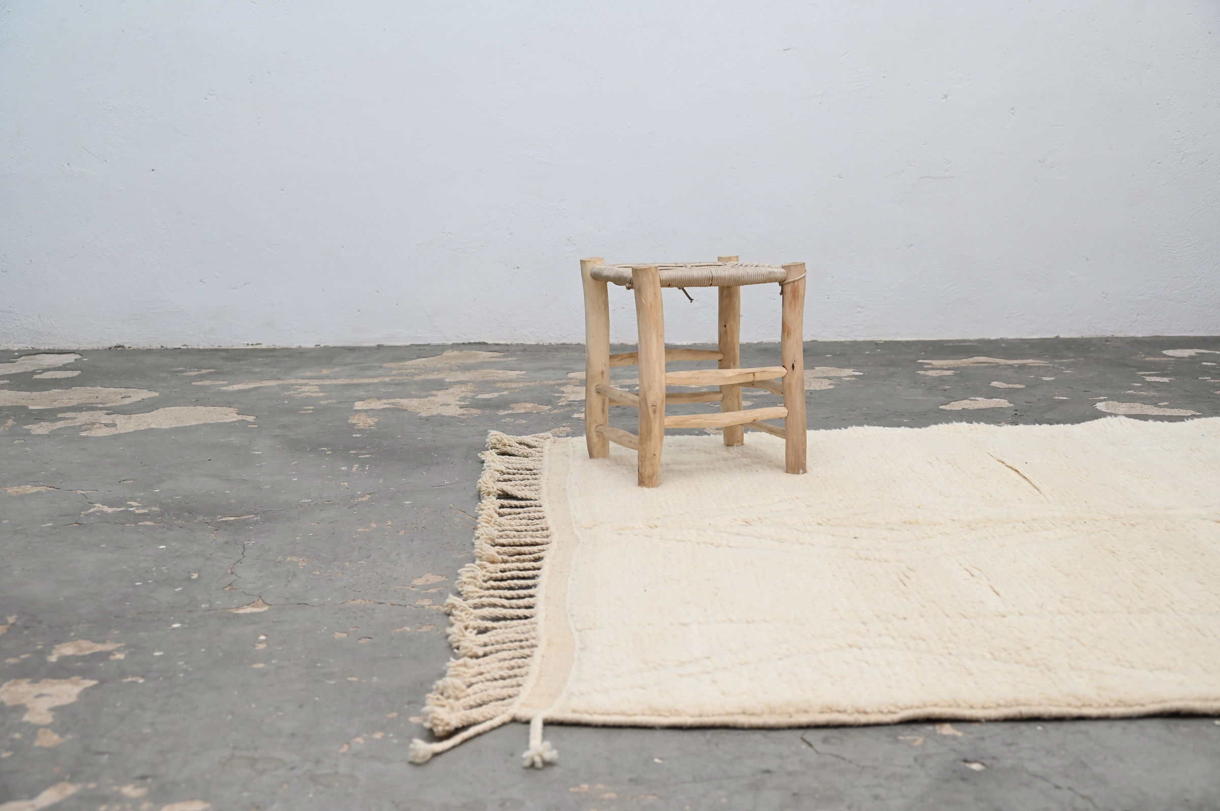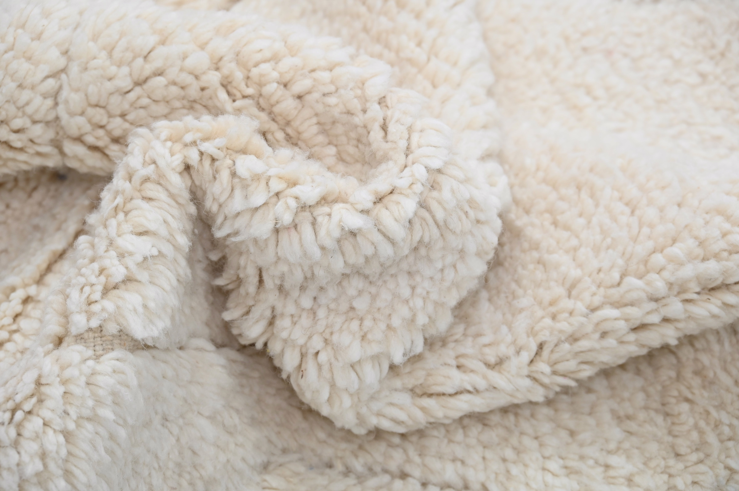 Måler 250 × 165 cm, jomfruullteppet stammer fra Mellerste Atlasfjellet hvor Beni Ouarain-stammer har raffinert tykkflorete vevingsteknikker over generasjoner. De medium proporsjonene forankrer soverom og intime sittesteder med forankret tilstedeværelse, mens den monokromatiske paletten sikrer allsidighet på tvers av interiørstiler. Den plysje flohøyden leverer eksepsjonell varme og akustisk demping. Gratis internasjonal levering.