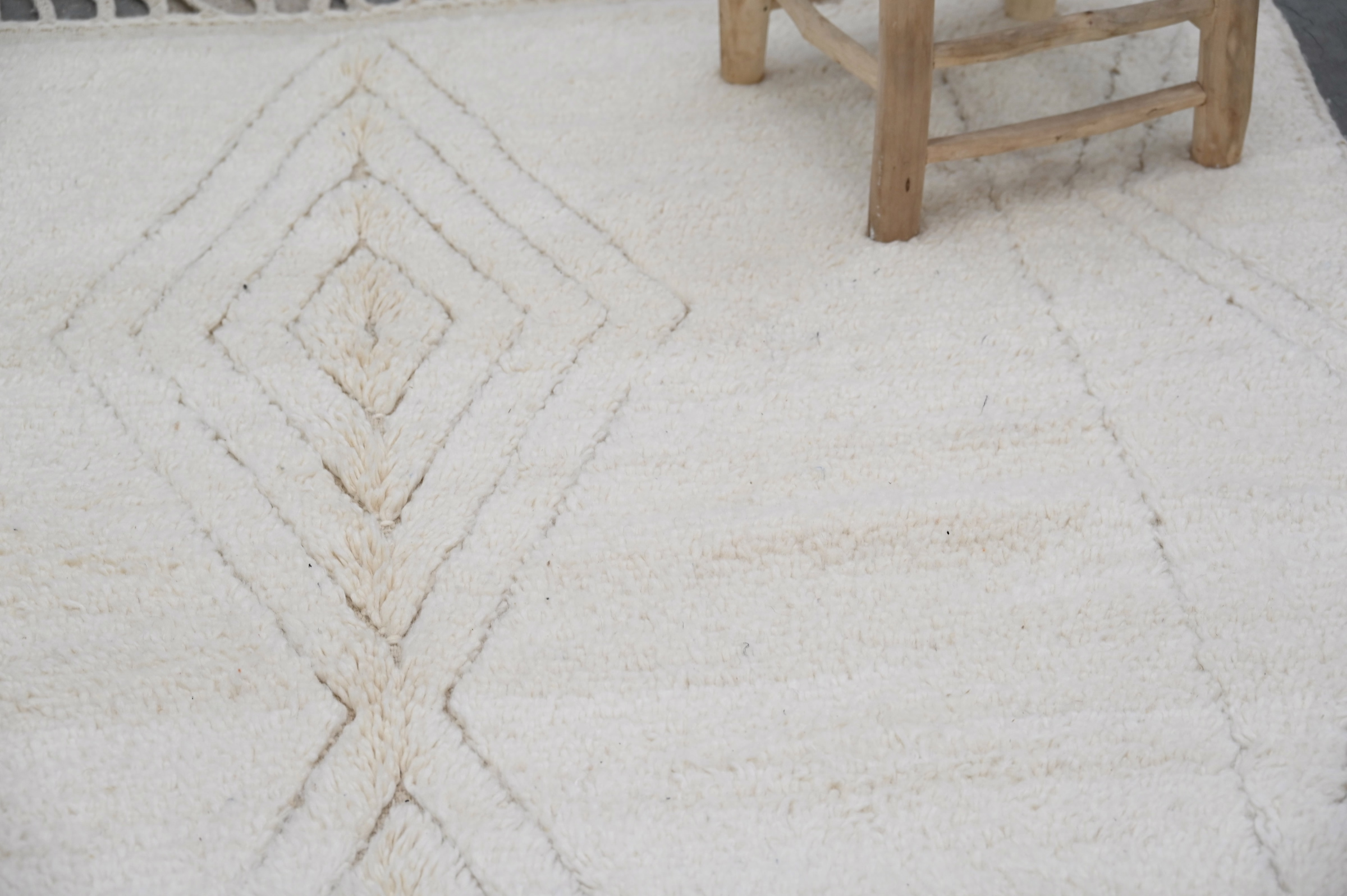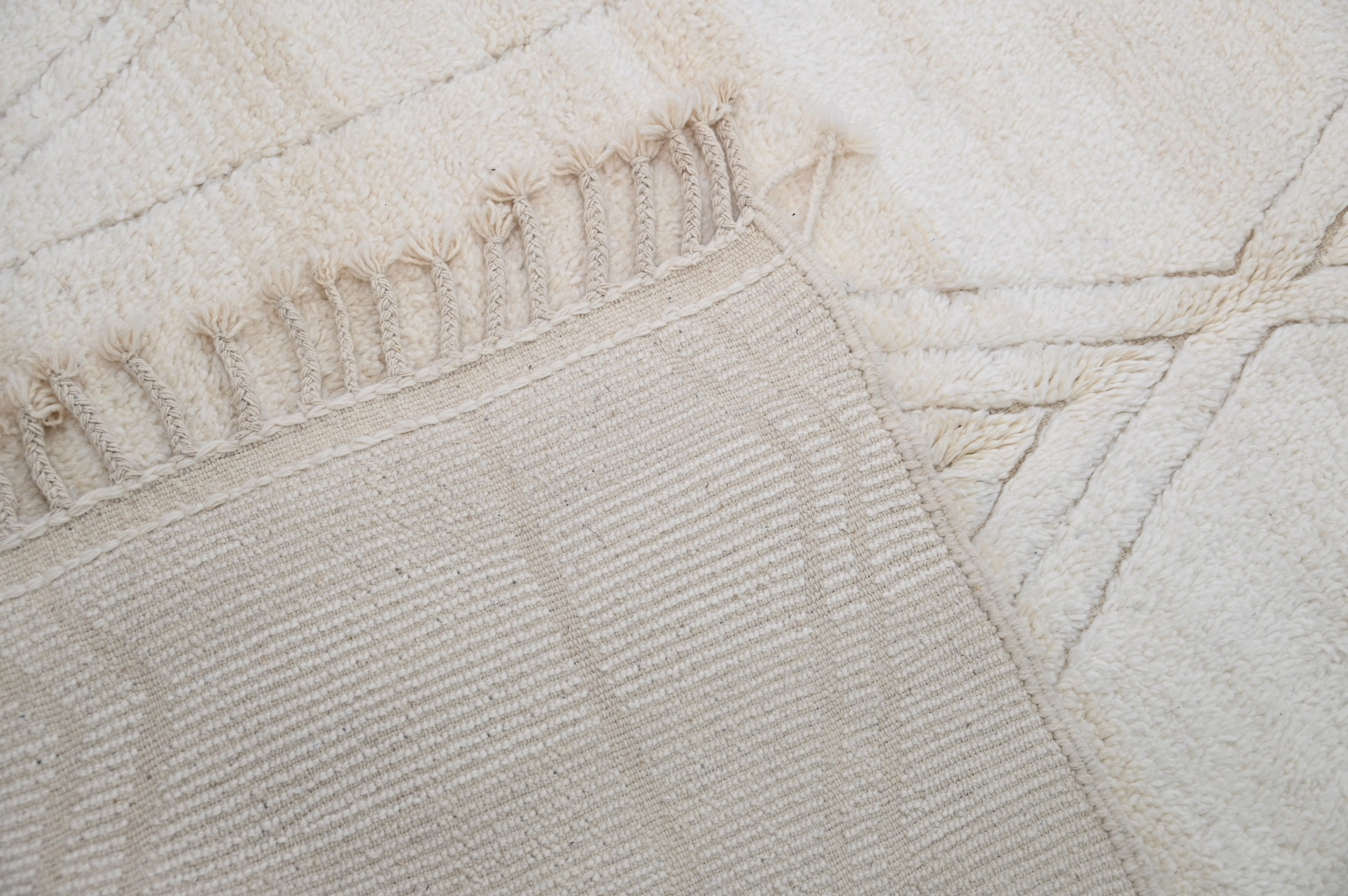 Dette tradisjonelle Beni Ouarain-teppet presenterer et raffinert diamantgitter i kullsort mot en luksuriøs kremhvit bakgrunn. Det geometriske rammeverket oppnår visuell balanse gjennom målt avstand og konsistent linjevekt, og legemliggjør den tilbakeholdne estetikken til denne feirede berber-vevningstradisjonen.
