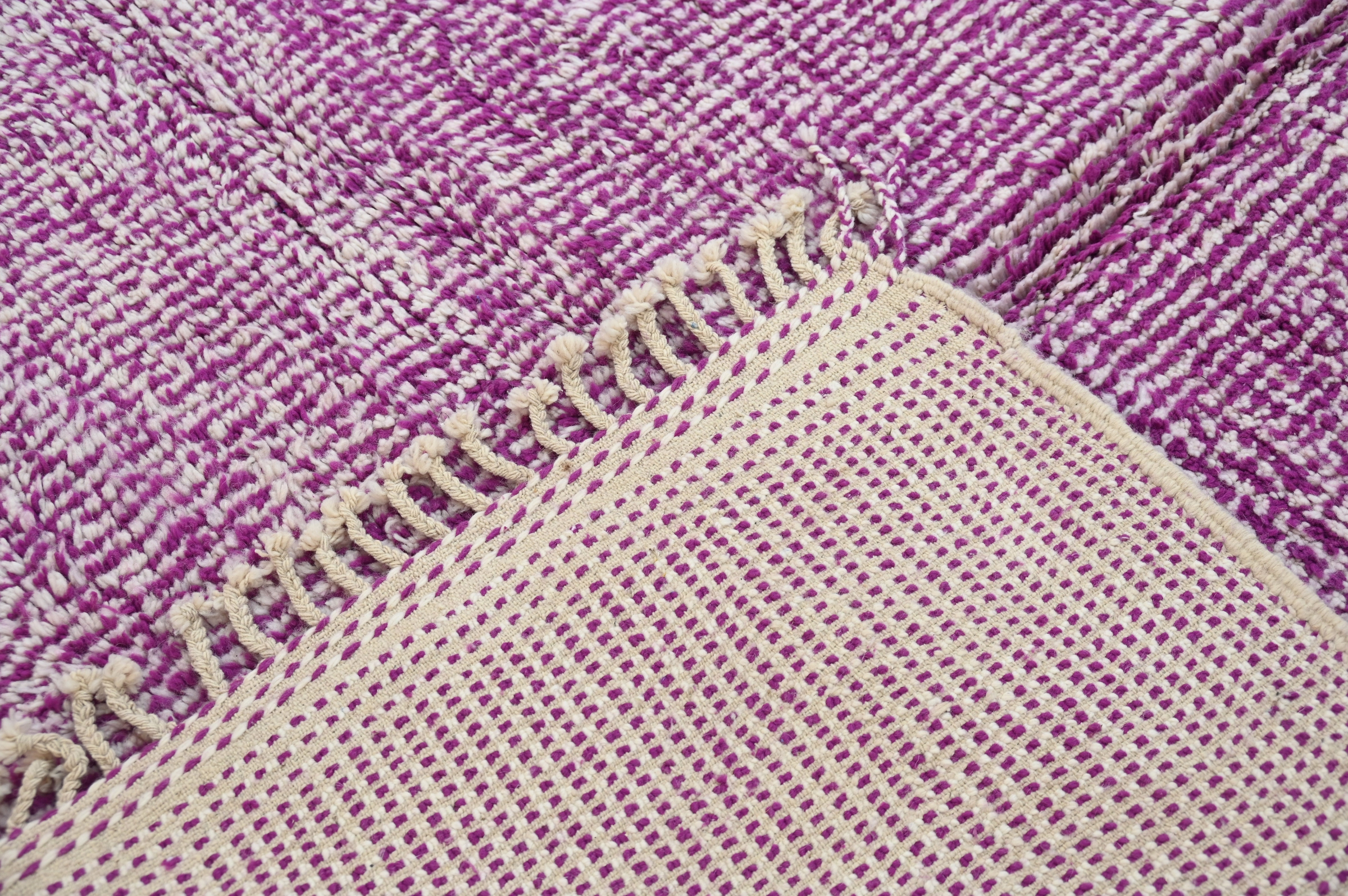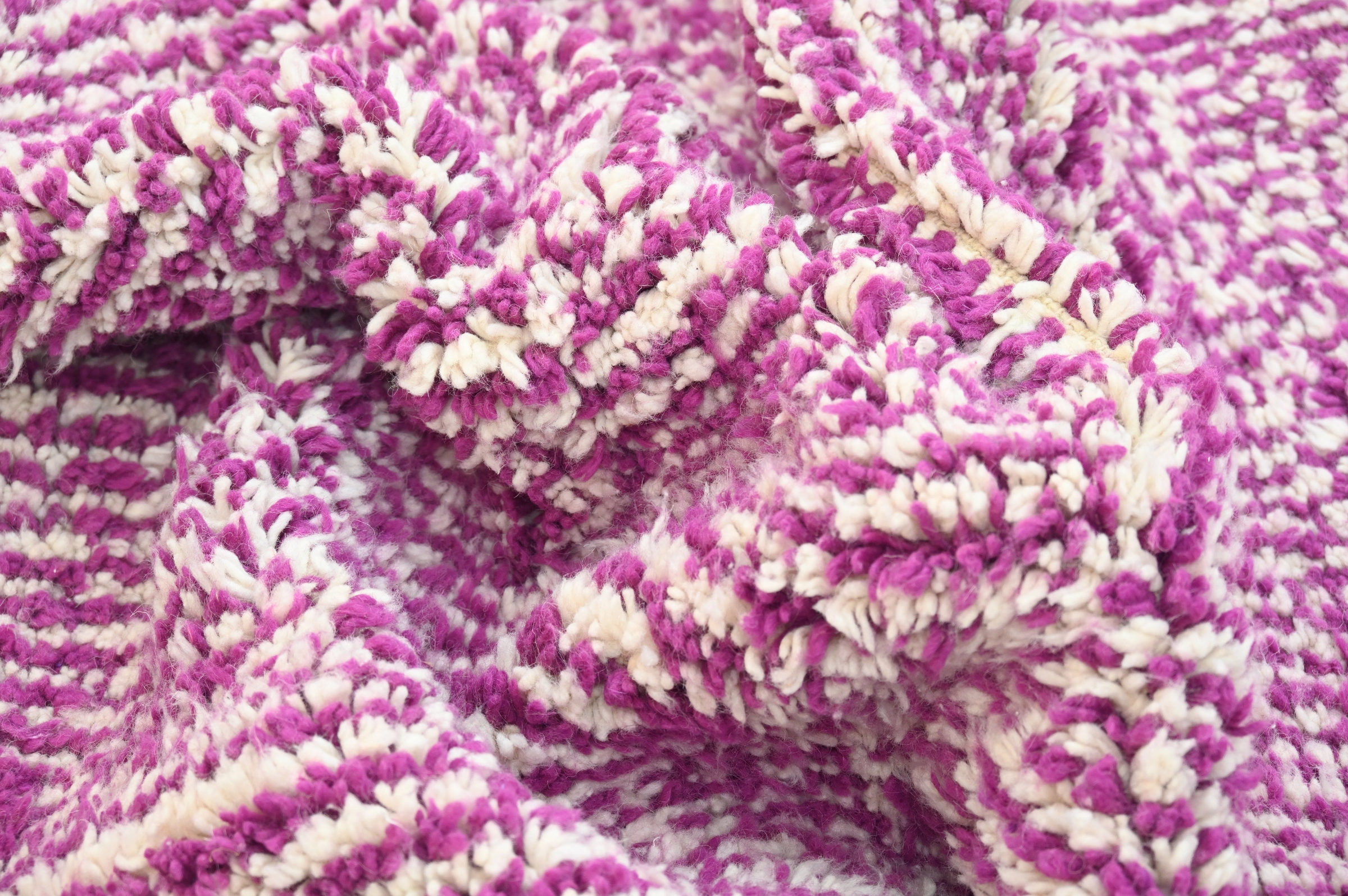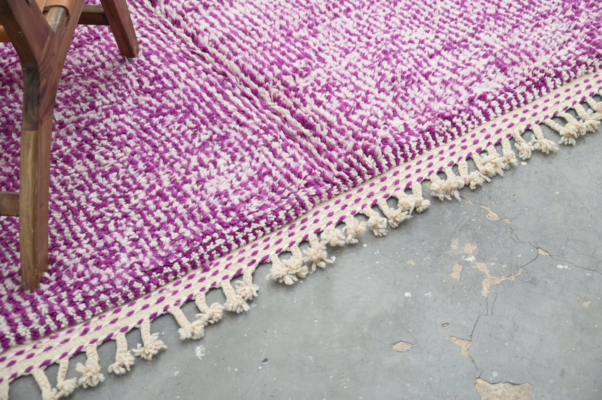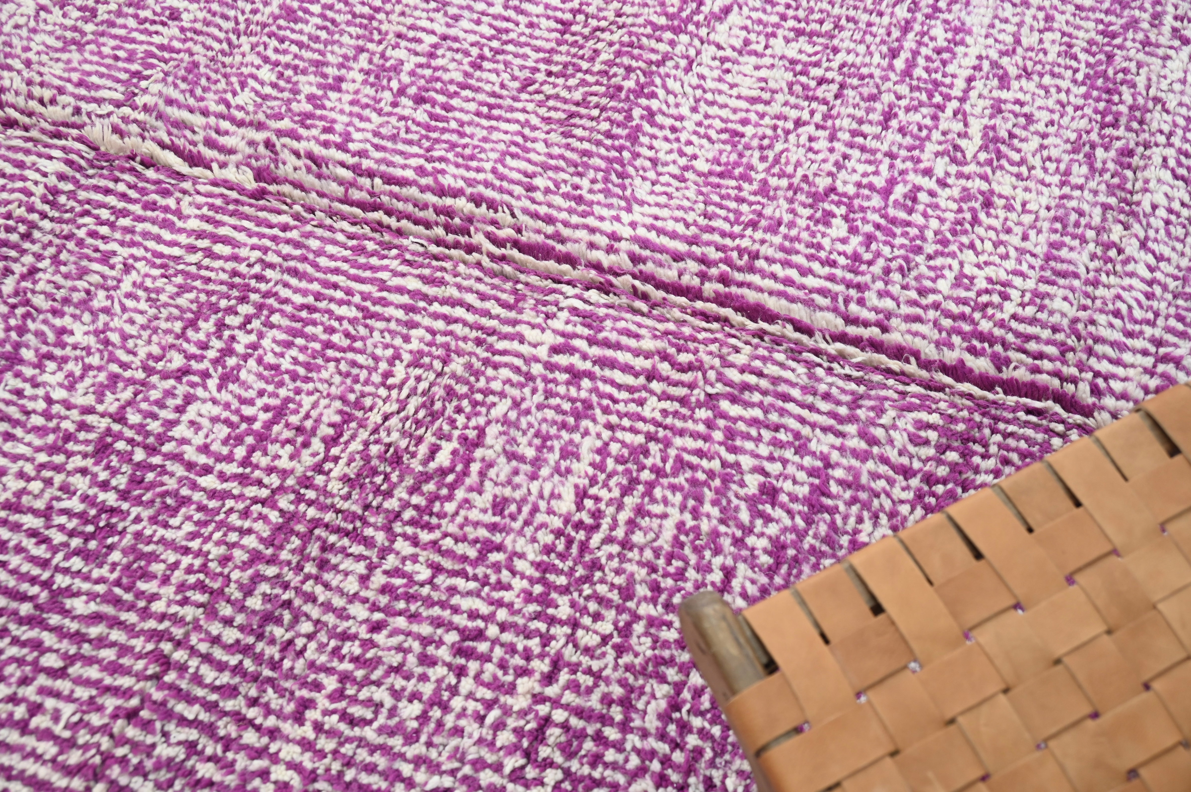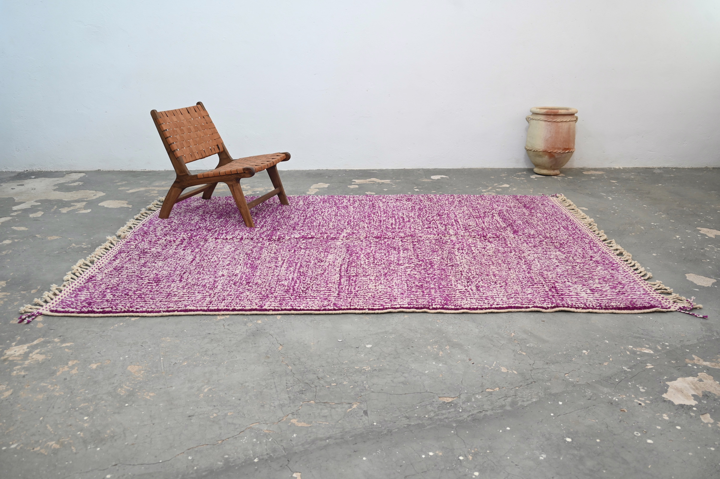 The Azilal handwoven piece delivers chromatic celebration through saturated magenta pink with subtle textural variation. The minimalist monochromatic approach emphasizes rich color saturation and pile depth over graphic pattern, creating vibrant presence through material quality.