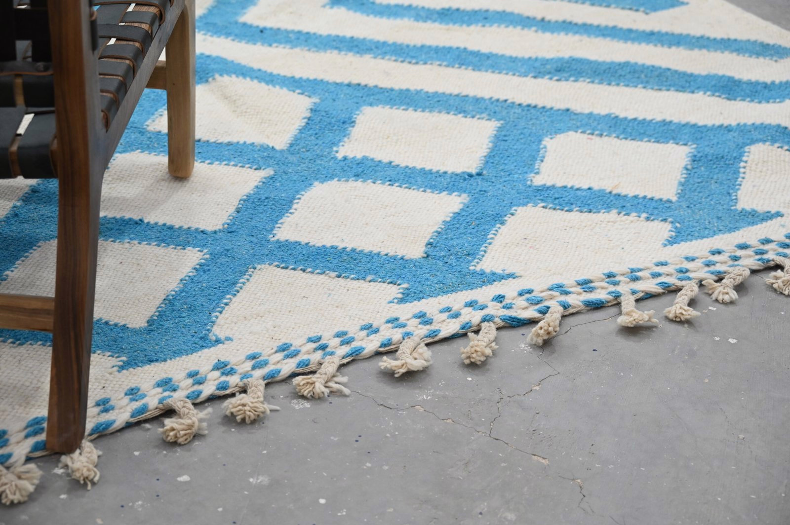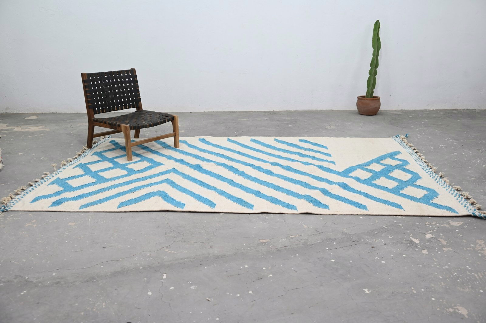 The Azilal handwoven piece presents bold geometric chevron and striped composition in turquoise creating dramatic visual impact. The contemporary composition and graphic clarity create architectural presence characteristic of modern Azilal aesthetic.