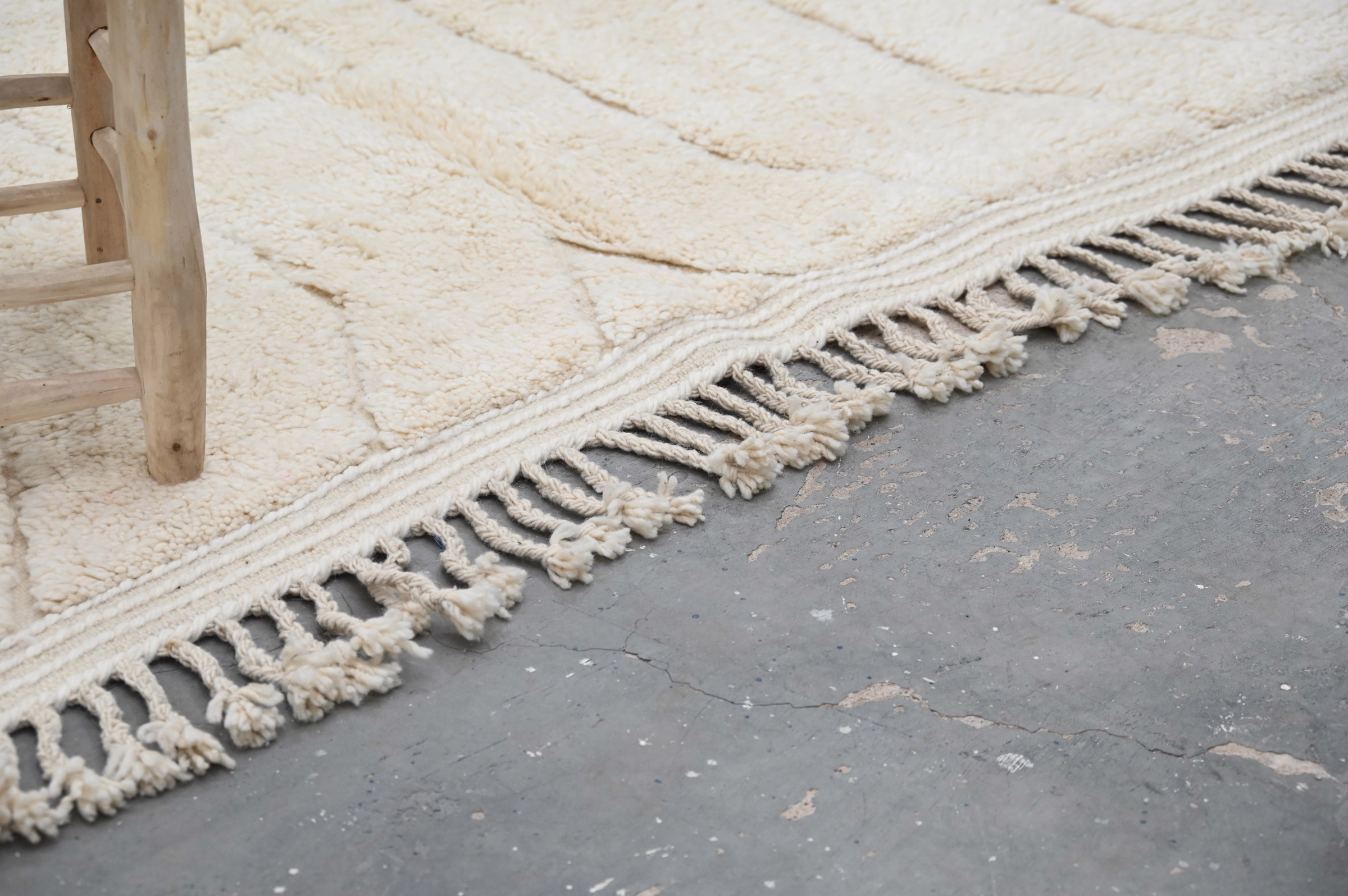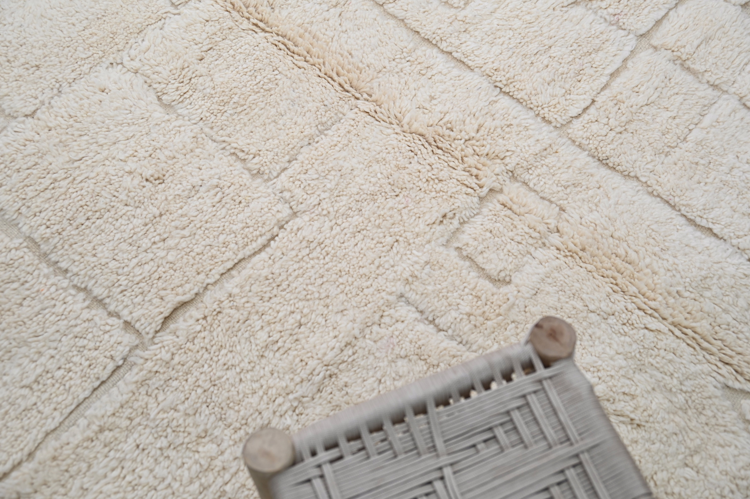 Dit traditionele Beni Ouarain tapijt presenteert een subtiel geometrisch rooster in tonaal crème en beige met lineaire verdeling die rustig ruimtelijk ritme creëert. Het monochromatische palet en ingetogen patronering exemplificeren de minimalistische esthetiek van deze gevierde Berber weeftraditie.