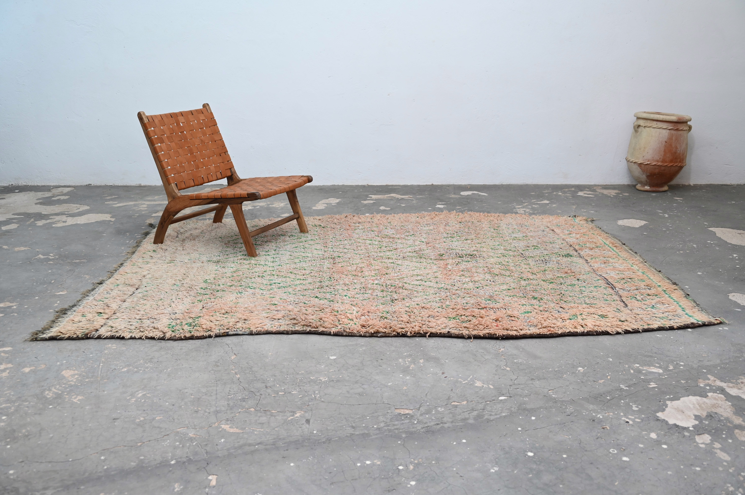 Met afmetingen van 290 × 200 cm demonstreert dit substantiële maagdelijke wollen tapijt uit het Marokkaanse Atlasgebergte blijvende ambachtskwaliteit door authentieke patina. De royale proporties passen bij woonkamers en slaapkamers, terwijl het door tijd verzachte pastelpalet naadloos integreert met serene hedendaagse interieurs. Het ingewikkelde ruitkader biedt contemplatieve visuele diepte binnen verfijnde esthetiek. Gratis internationale levering.