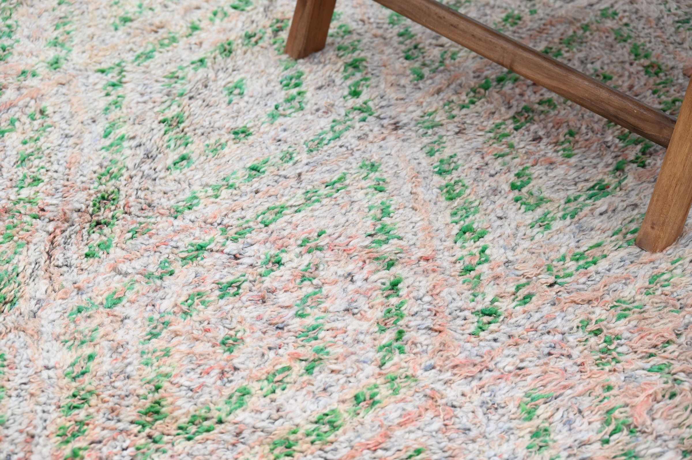 Dit traditionele vintage tapijt presenteert ingewikkeld ruitroosterkader in vervaagd koraalpink en saliegroen over een zongebleekte beige ondergrond. Decennia gebruik hebben de patronen getemperd tot fluisterzacht contrast, terwijl de complexe geometrische compositie uitzonderlijke Berber weefprecisie toont door subtiele patronering.