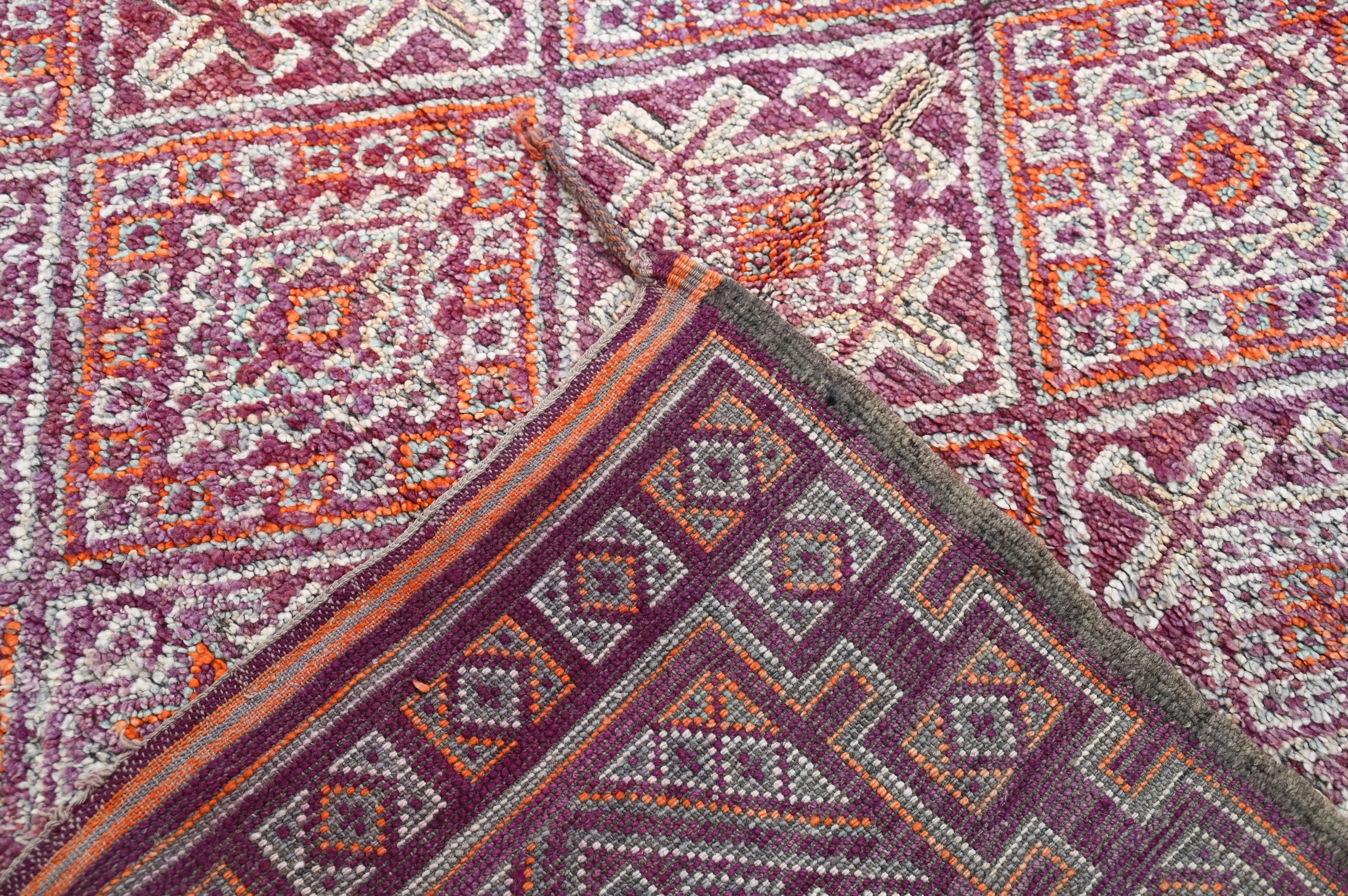 Dit traditionele vintage tapijt gebiedt uitzonderlijke aanwezigheid door ingewikkeld all-over ruitroosterkader in vervaagd bourgondisch en crème over een koraalpink ondergrond. Decennia gebruik hebben de natuurlijke kleurstoffen getemperd tot harmonieuze aardetinten, terwijl de complexe geometrische compositie uitzonderlijke Berber weefprecisie toont door sierlijke patronering.