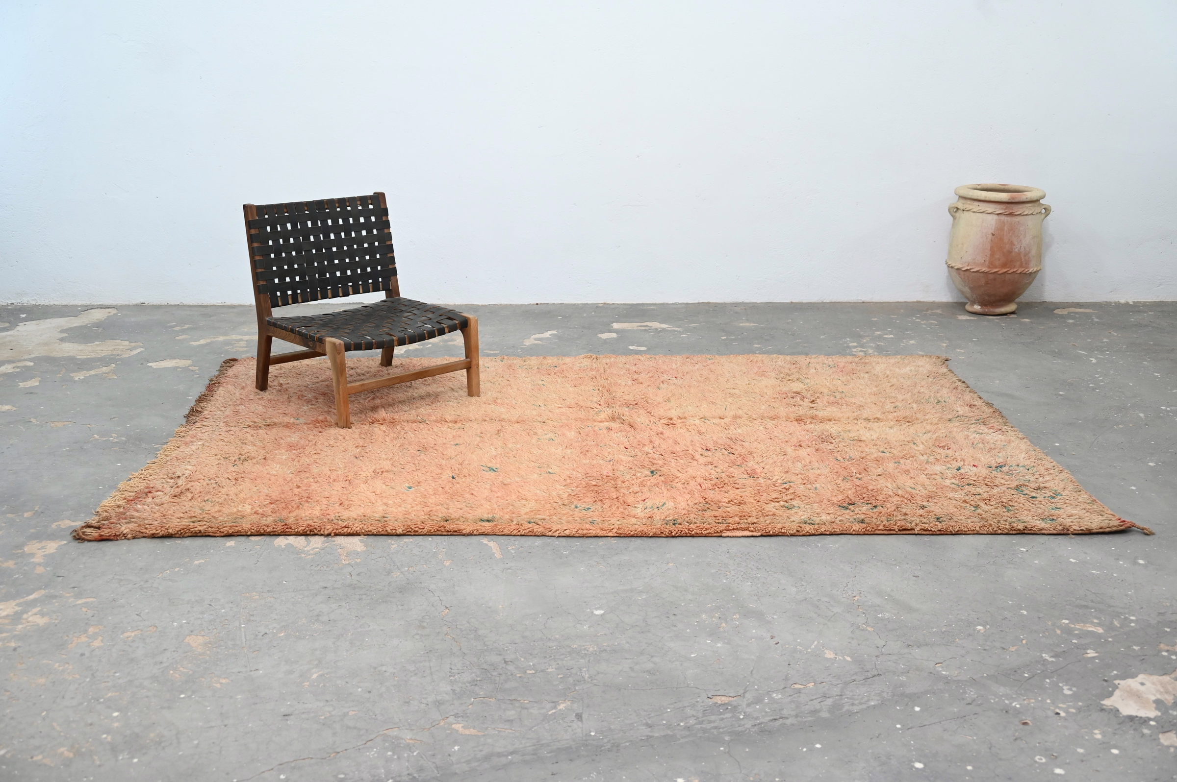 Measuring 290 × 196 cm, the substantial vintage rug from Morocco's Atlas Mountains demonstrates enduring craft quality through authentic age. The generous proportions suit living rooms and bedrooms, while the vibrant coral hue energizes bohemian and eclectic interiors. The subtle patterning delivers contemplative visual interest within bold chromatic statement. Free international delivery.