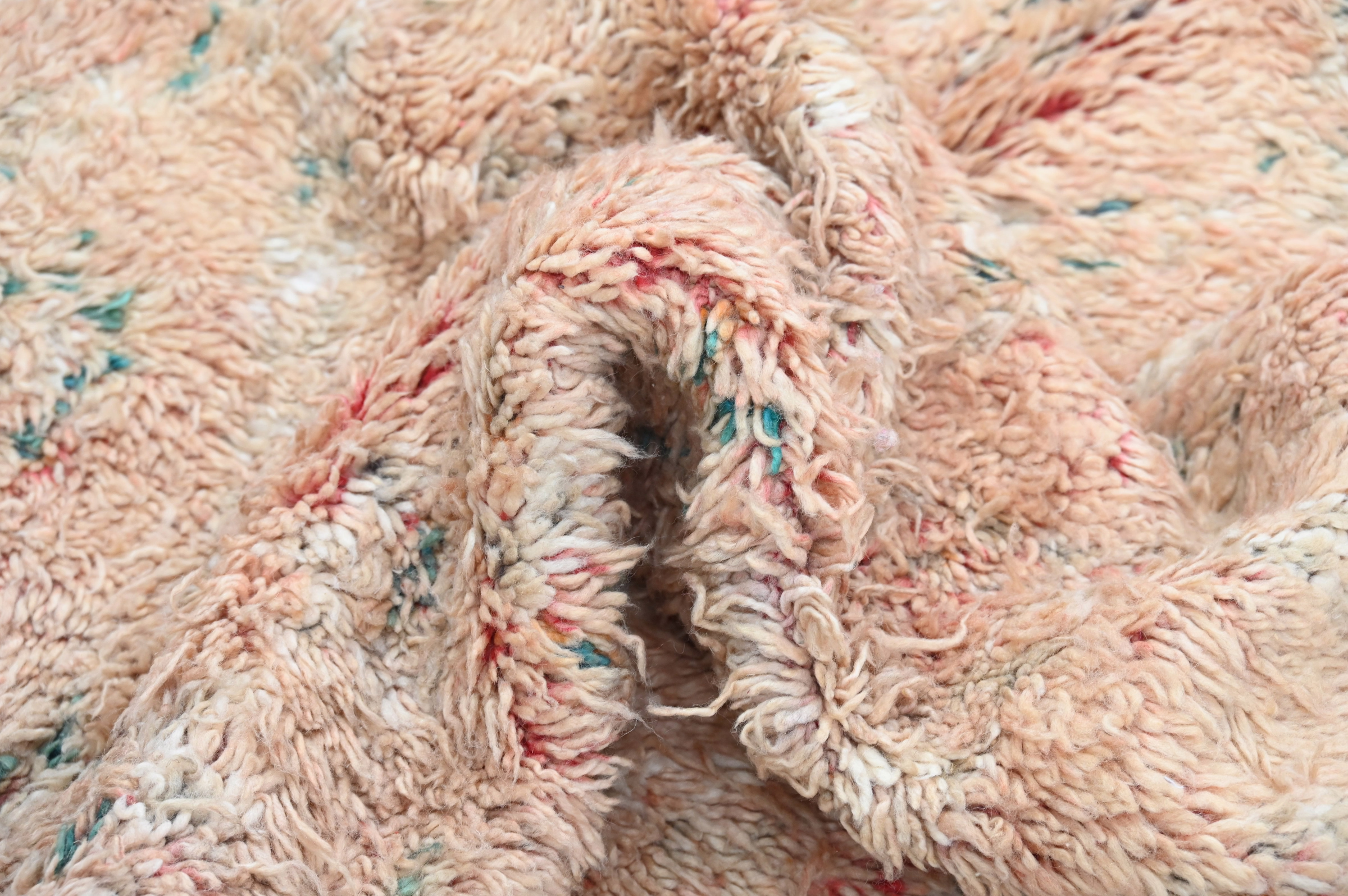 This vintage handwoven piece presents saturated coral pink with subtle scattered tribal symbols in sage green across a textured ground. Decades of use have created rich patina across the wool, while the minimalist patterning showcases exceptional weaving through restraint and color saturation.