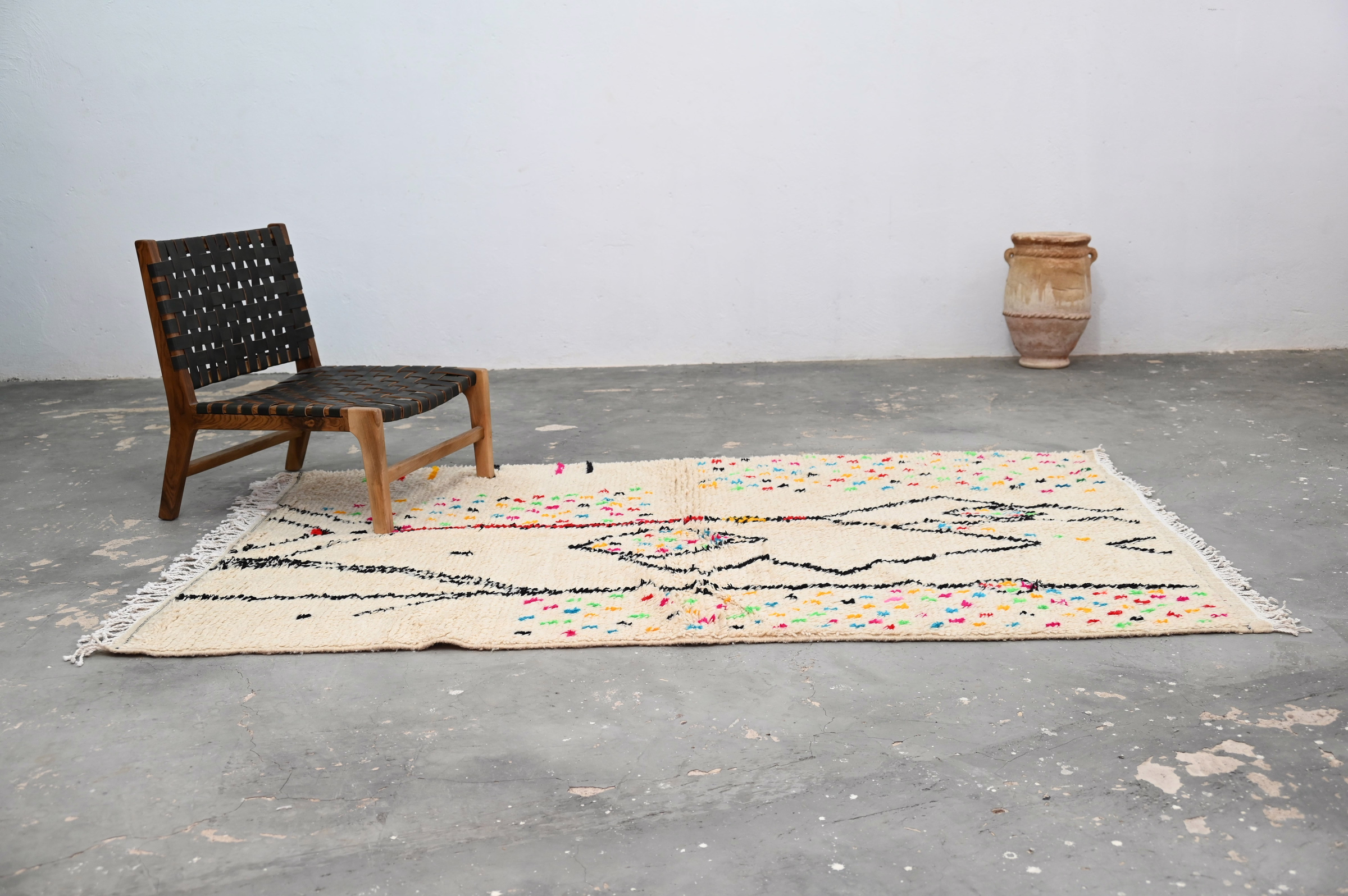 Handwoven in the Azilal region of the Middle Atlas, each piece emerges from a dialogue between material and maker. Measuring 234 × 147 cm, this piece carries the quiet rhythm of slow craftsmanship—wool prepared by hand, patterns emerging over weeks of focused work.
