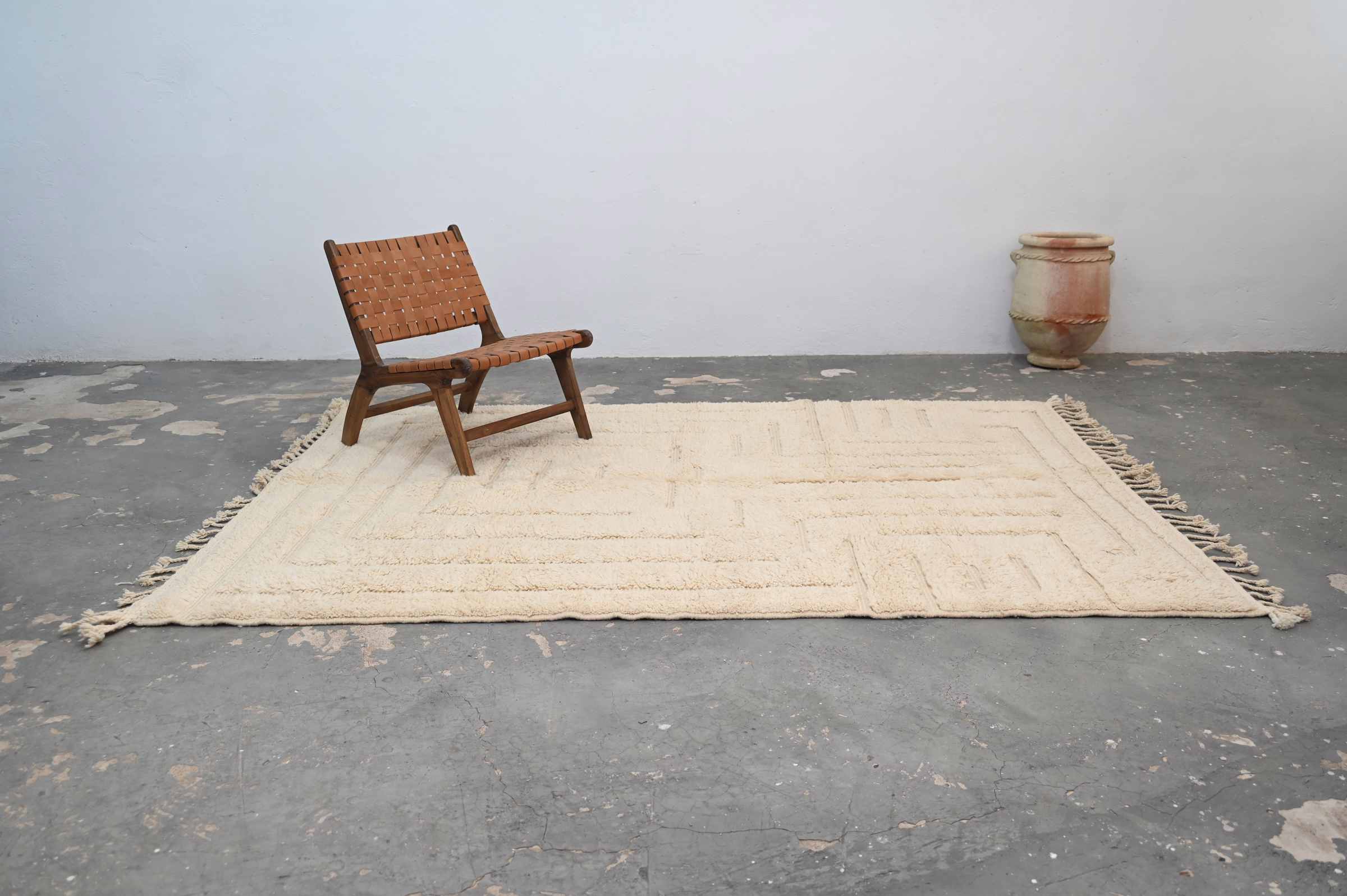 A textile of uncommon presence from the Atlas Mountains. Measuring 295 × 205 cm, this piece represents the intersection of ancestral technique and contemporary restraint—a piece for interiors that value substance over statement.