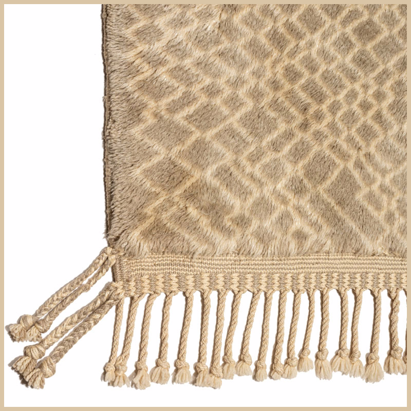 This textile emerges from generations of Atlas Mountain craft. Virgin wool, hand-spun and naturally dyed, takes form over weeks on traditional looms. No automation. No urgency. Only time and intention.