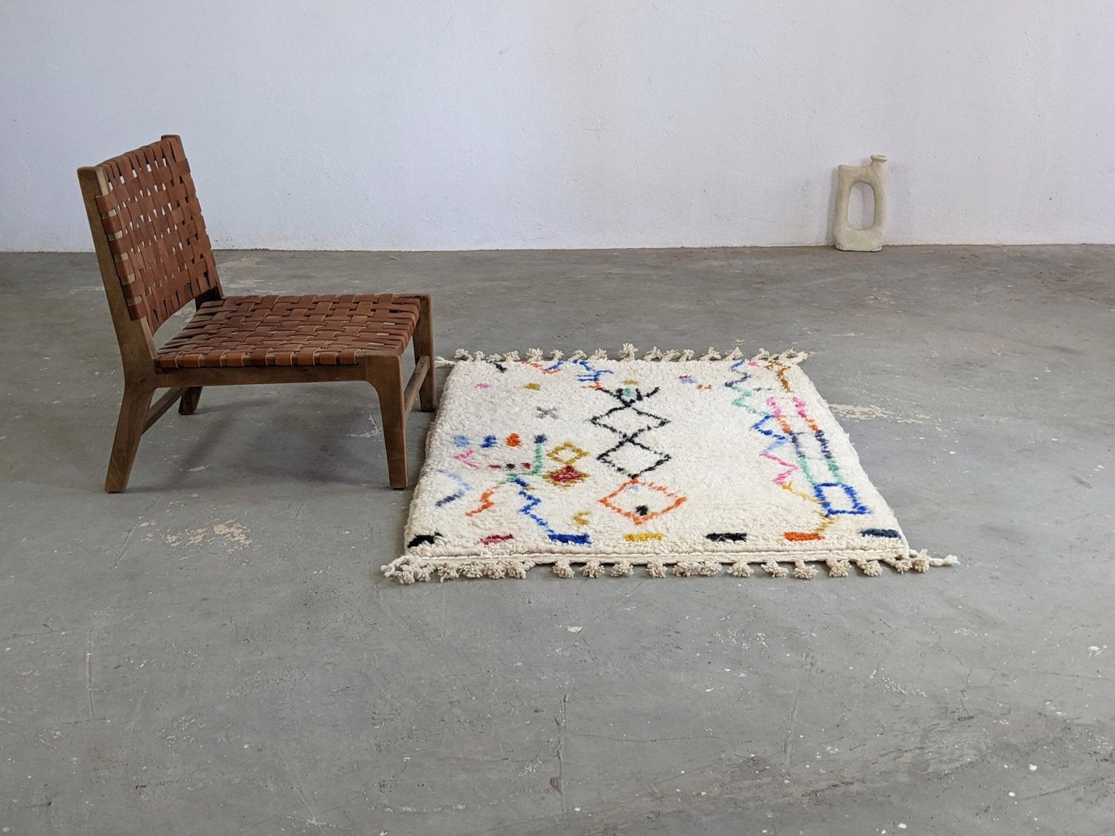Handwoven in the Azilal region of the Middle Atlas, each piece emerges from a dialogue between material and maker. Measuring 140 × 106 cm, this piece carries the quiet rhythm of slow craftsmanship—wool prepared by hand, patterns emerging over weeks of focused work.