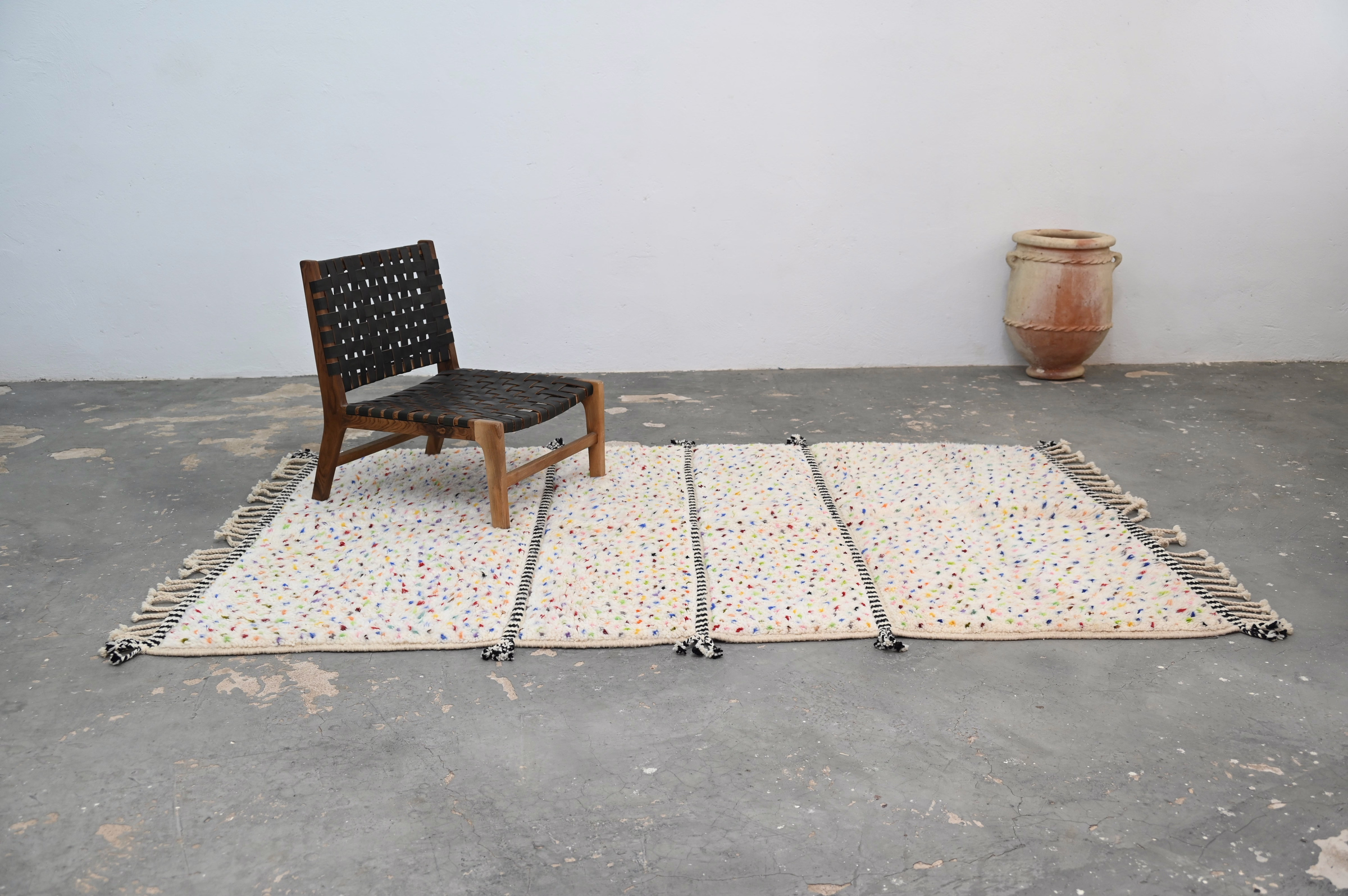 The Azilal handwoven piece presents horizontal banded composition with scattered dot motifs in multicolor across a cream ground. The structured layout and rhythmic patterning create contemplative visual interest through repetition and variation.