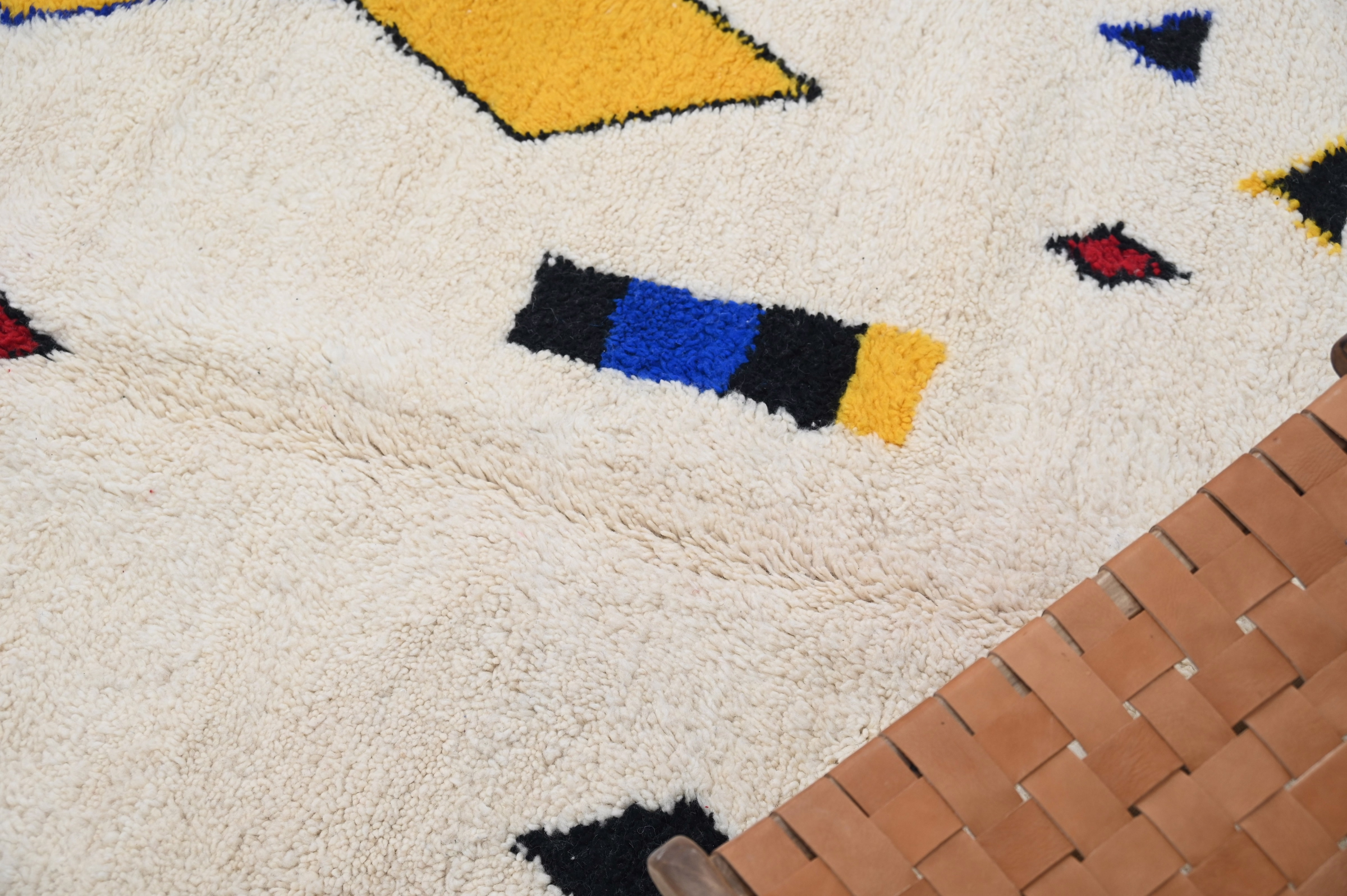 Measuring 310 × 205 cm, this wool rug originates from the Azilal region of Morocco's Atlas Mountains, where Berber women weave intuitive compositions that blend ancestral symbolism with personal expression. The generous proportions suit living rooms and bedrooms, while the playful color palette energizes contemporary interiors. The high-pile construction delivers acoustic softening and underfoot luxury, transforming minimalist spaces with artisanal warmth. Free international delivery.