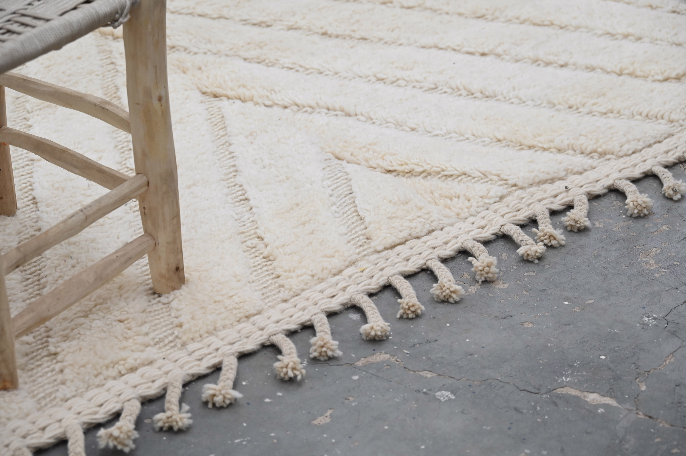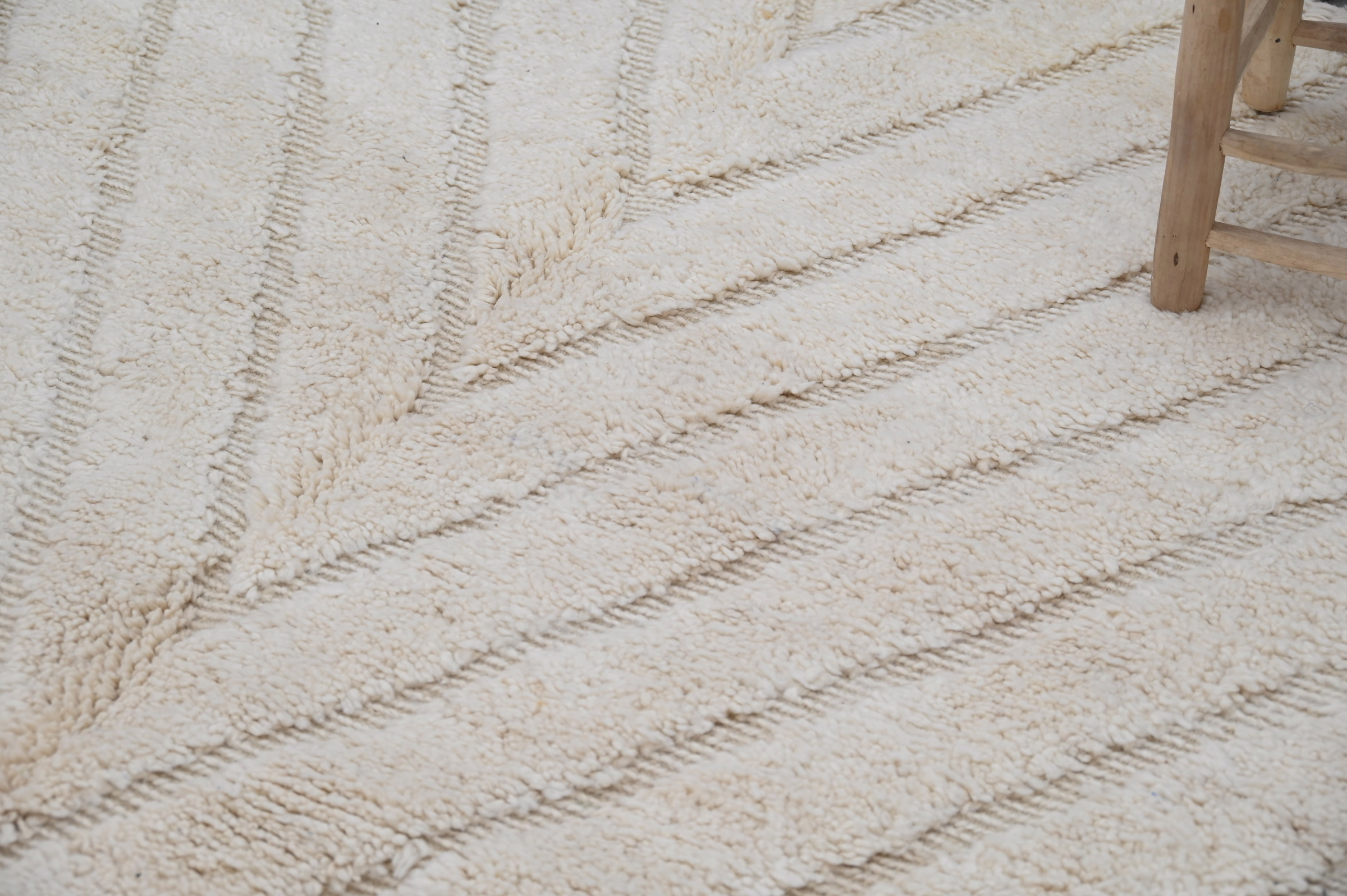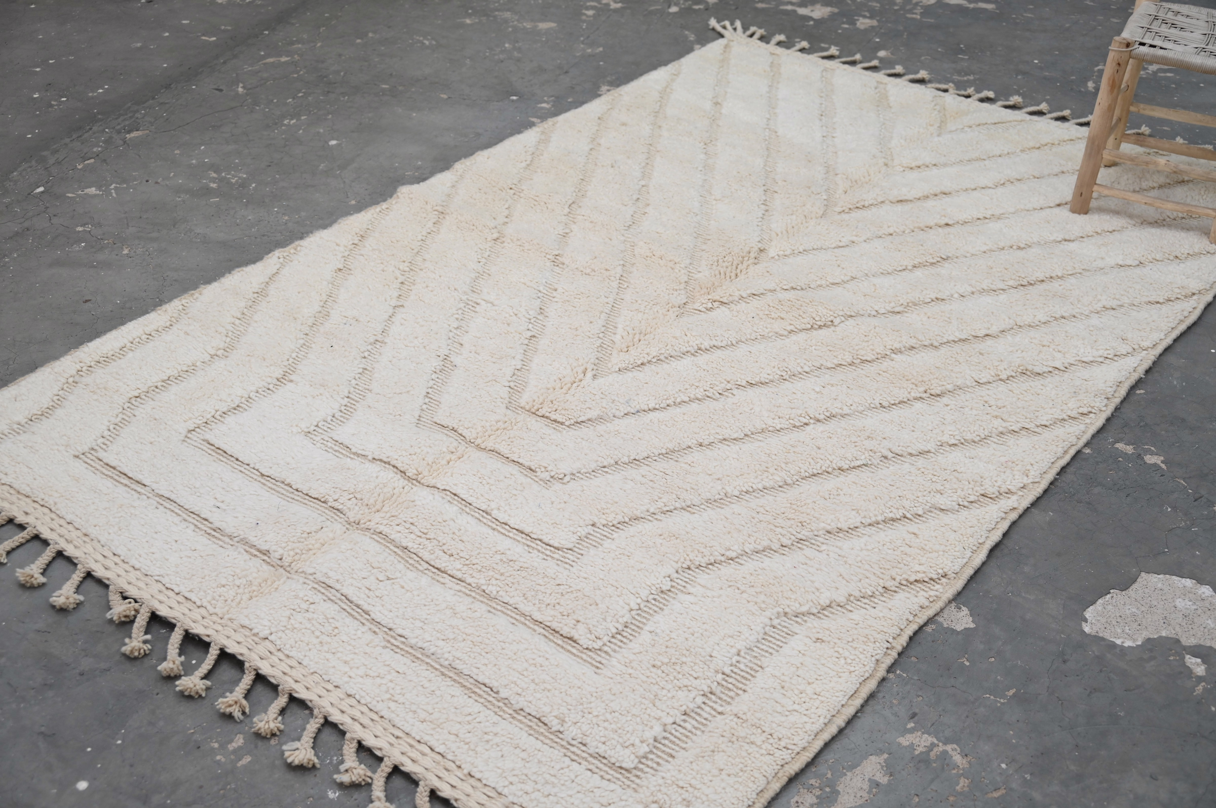 Denna traditionella Beni Ouarain-matta presenterar subtila chevron- och linjära mönster i kol som skapar mild visuell rytm över ett plyschigt krämfält. Den minimalistiska kompositionen betonar texturdjup, medan den högflossiga texturen ger lyxig komfort under fötterna.